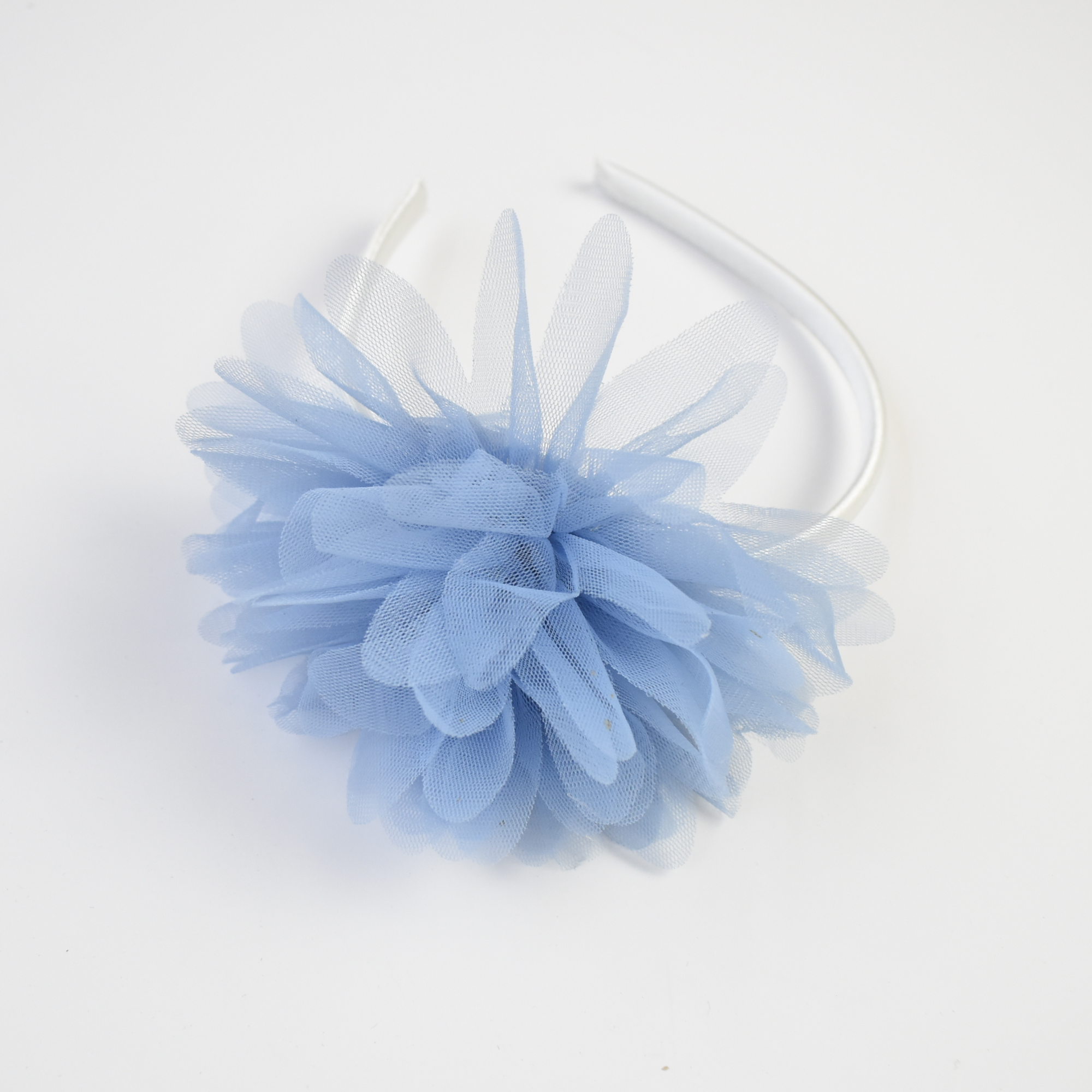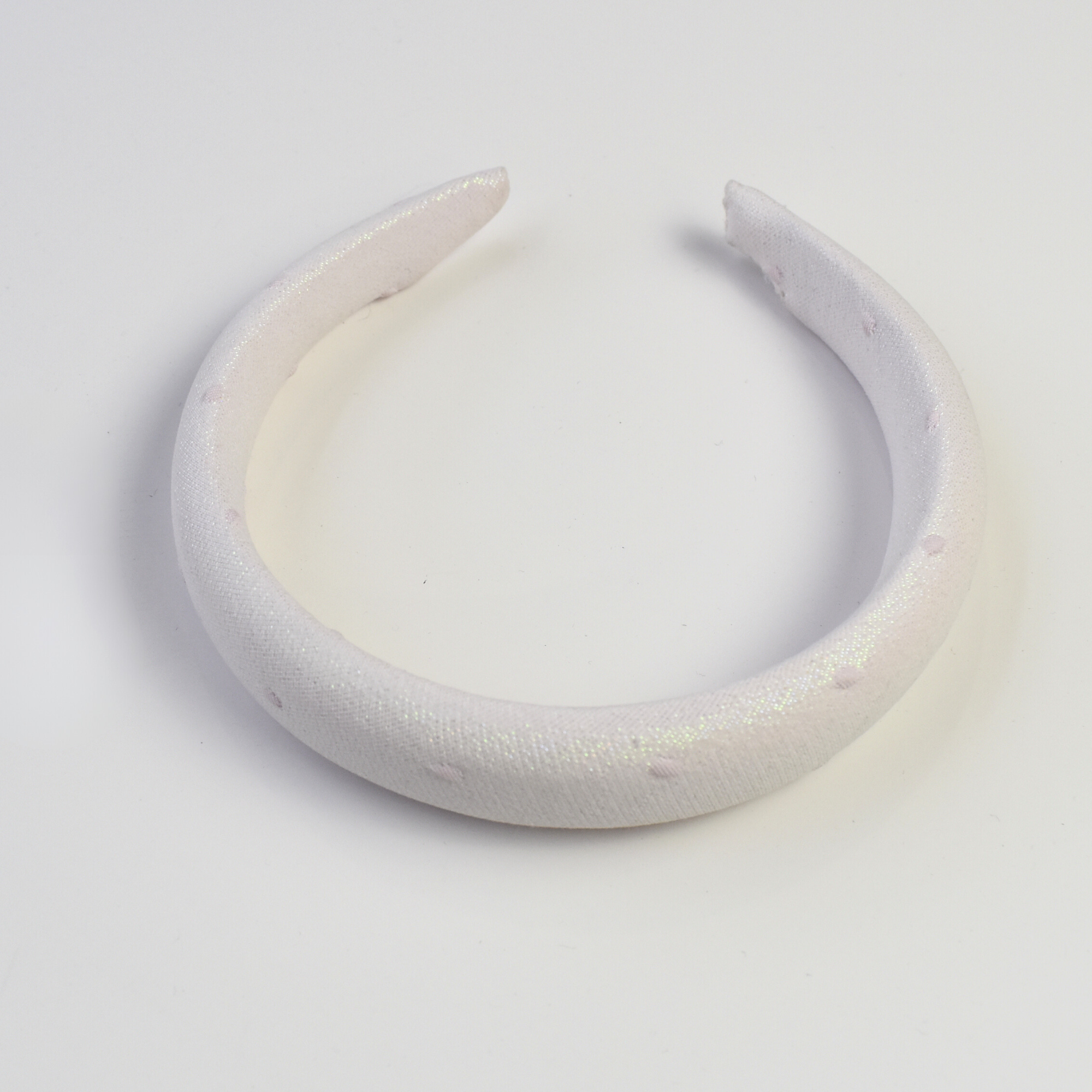 White satin-covered headband for girls, embellished with small pearl beads arranged evenly across the surface, perfect for weddings.