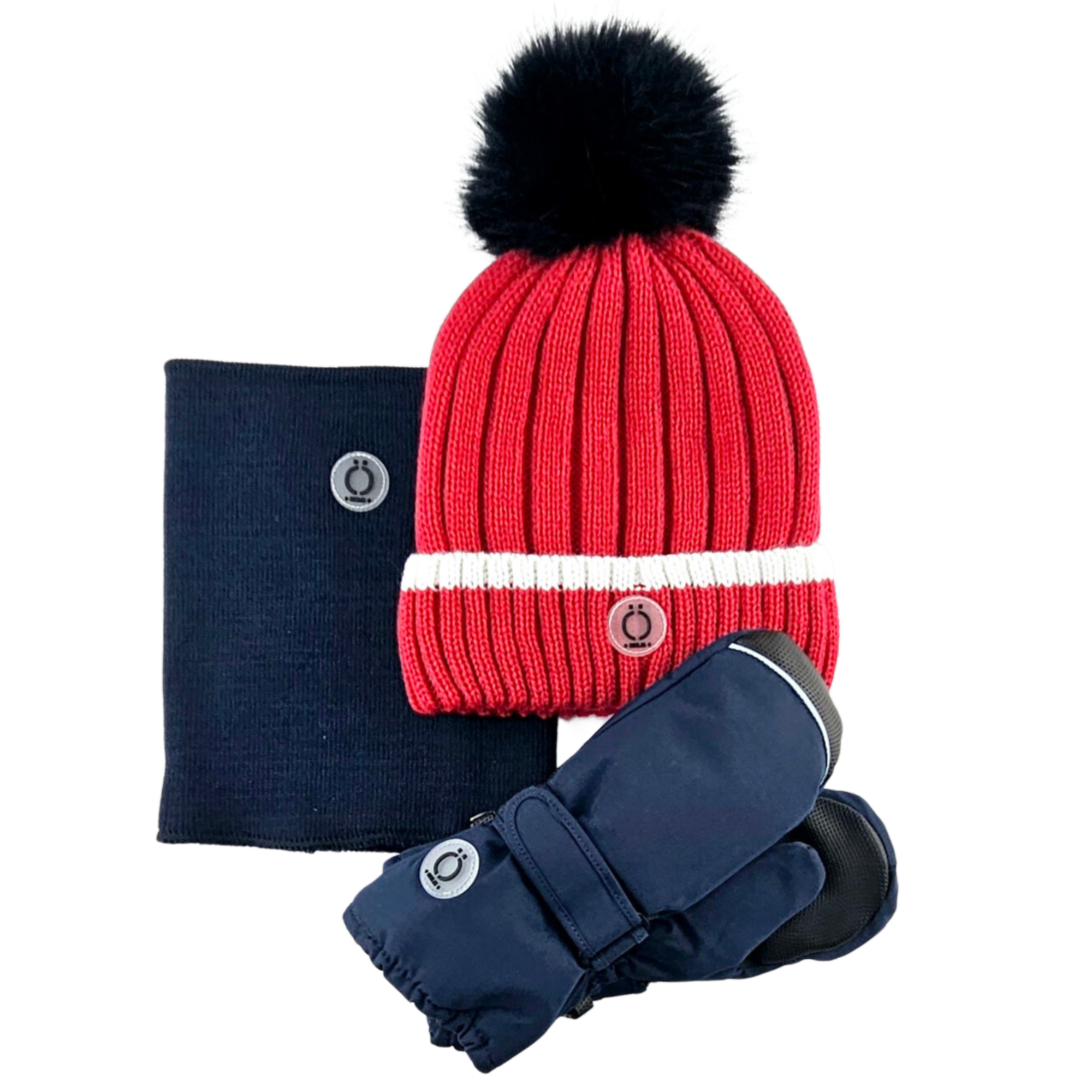 • Winter accessory set for kids including a black knit hat with a faux fur pom-pom, matching neck warmer & insulated gloves, all with button detail.