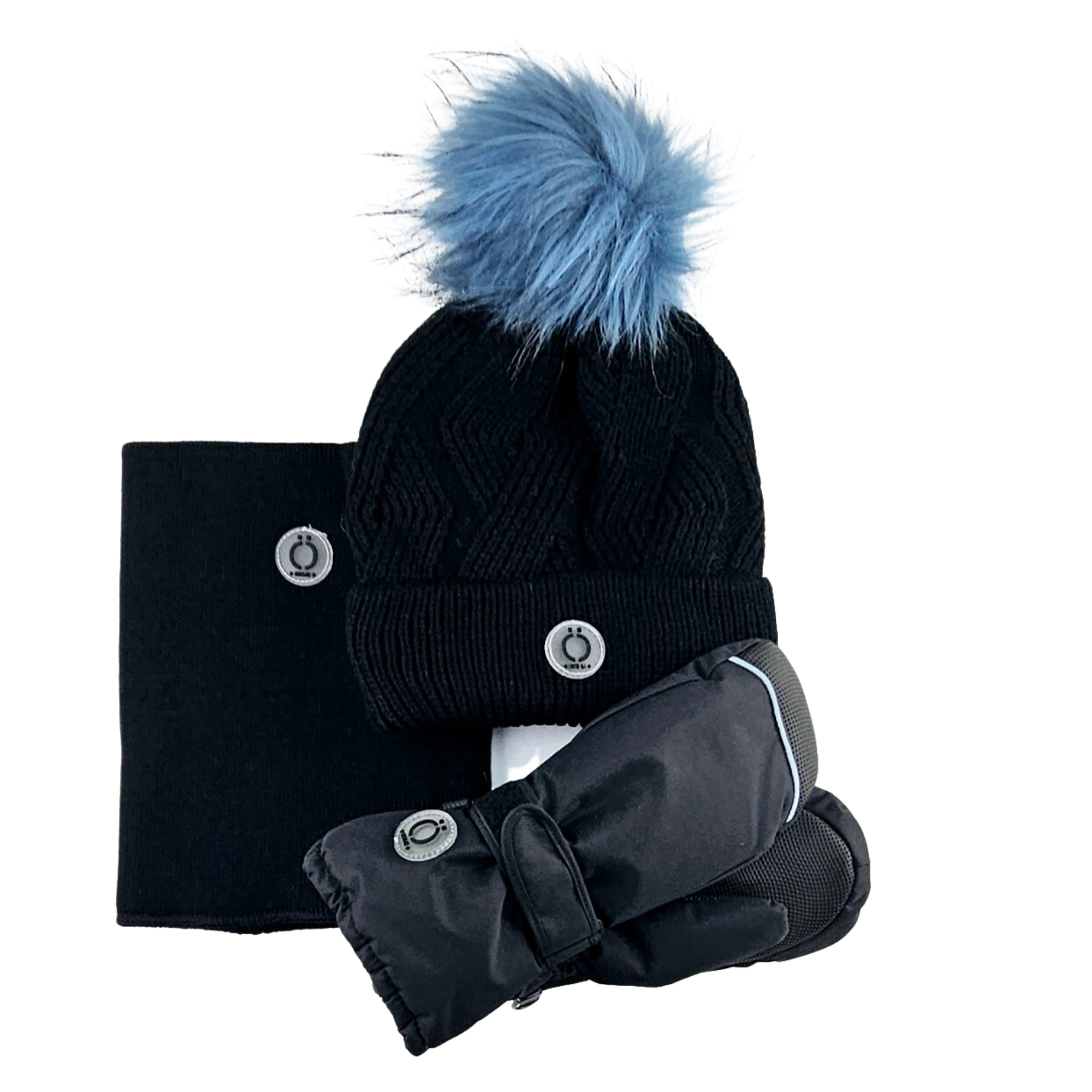 Winter accessory set for kids including a black knit hat with a faux fur pom-pom, matching neck warmer & insulated gloves, all with button detail.