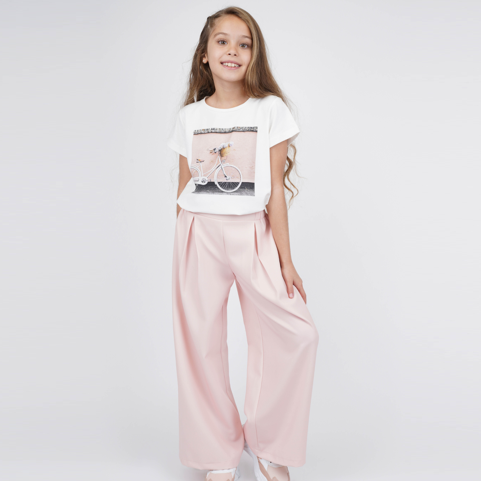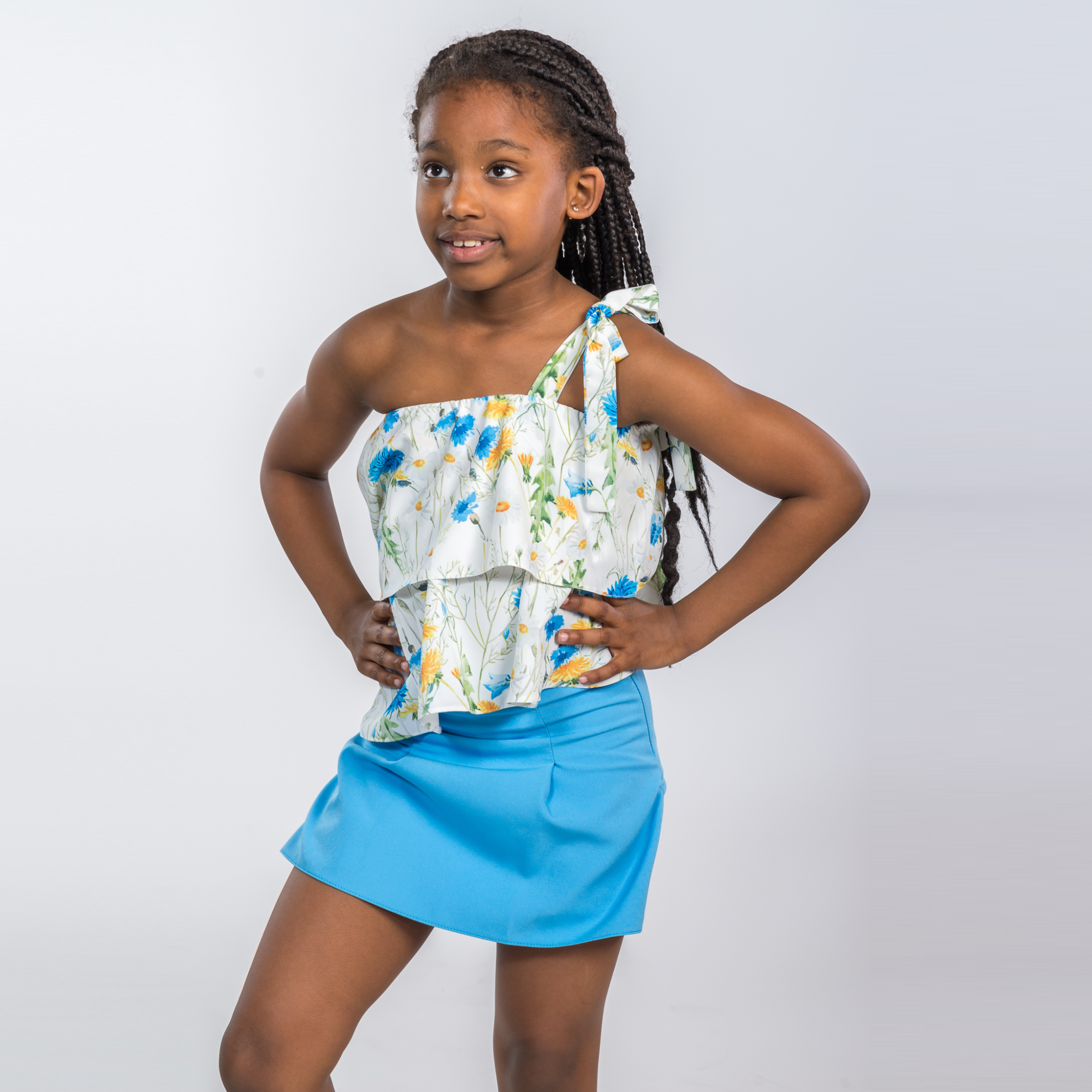 • Girls’ summer outfit with white T-shirt featuring blue vases with daisies print and matching bright blue shorts decorated with bow accents.