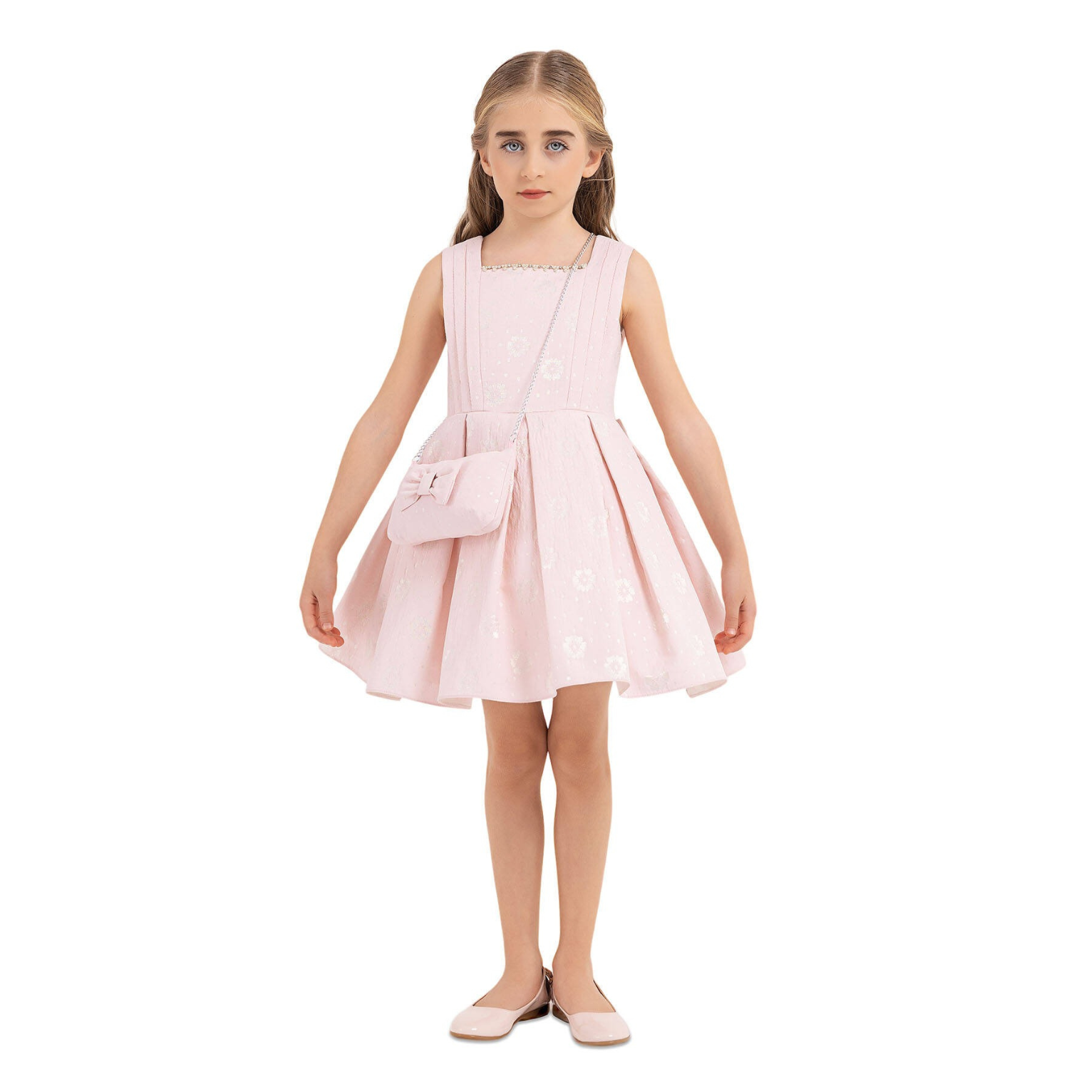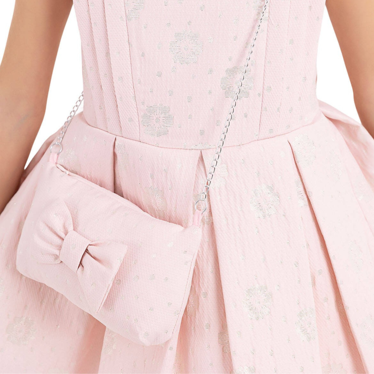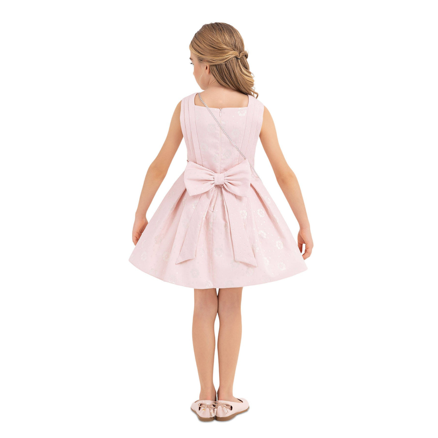 Élégante et ravissante, cette robe sans manches est parfaite pour les occasions spéciales. Dotée d’une doublure en coton doux pour un confort optimal, elle est confectionnée en jacquard argenté scintillant. L’encolure est ornée de perles et de strass, apportant une touche de glamour. Un joli nœud à la taille et un mini sac assorti complètent la tenue, faisant de cette robe un incontournable pour votre petite fashionista.