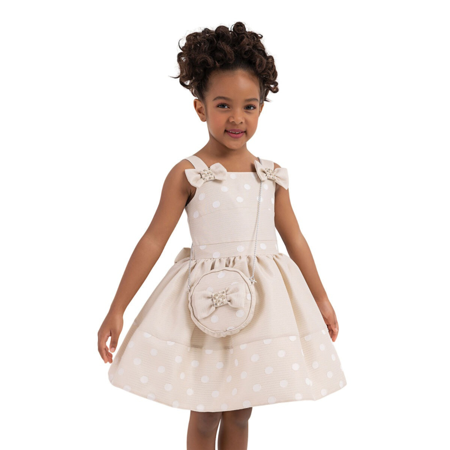 Faites briller votre petite avec cette magnifique robe à bretelles, alliant confort et élégance. Son tissu jacquard à pois et rayures, rehaussé de jolis nœuds ornés de perles et de strass, crée un look à la fois ludique et raffiné.