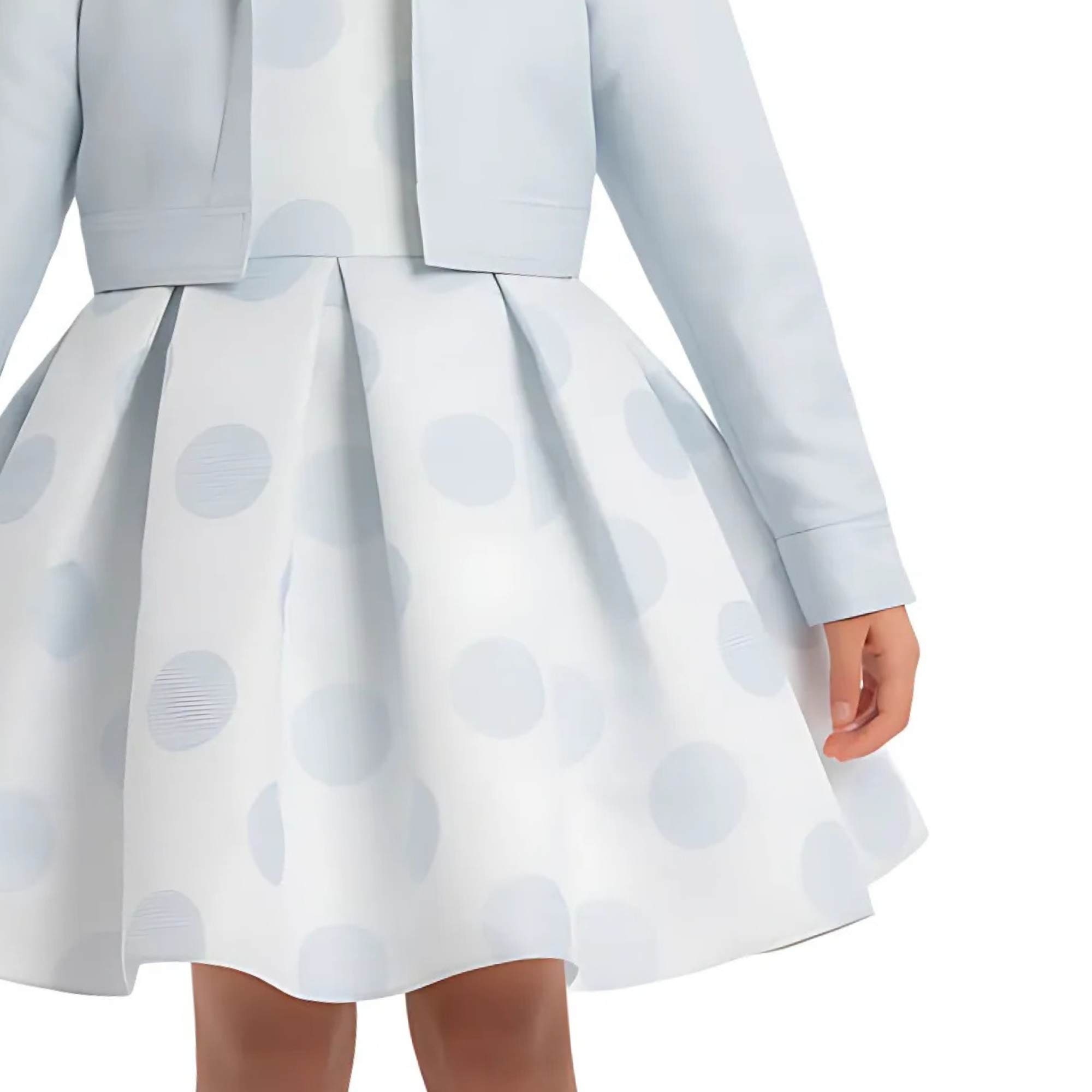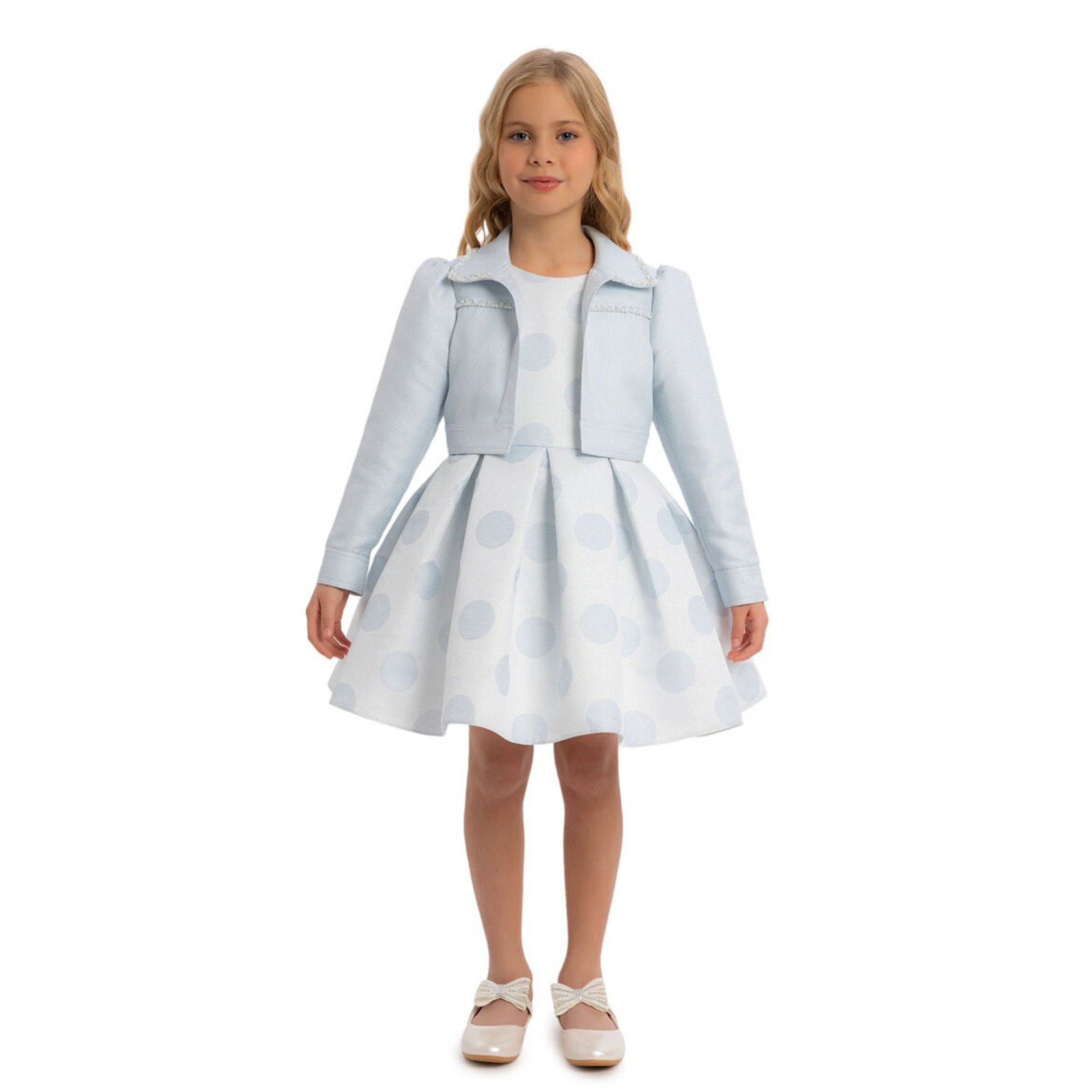 Cet ensemble boléro et robe est un incontournable pour la garde-robe de votre petite fille cette saison ! Le boléro en jacquard, avec sa coupe veste en jean, apporte une touche d’élégance avec ses broderies de perles et ses épaules froncées et volumineuses. Parfait pour compléter n’importe quelle tenue, c’est une pièce polyvalente pour le printemps et l’été.