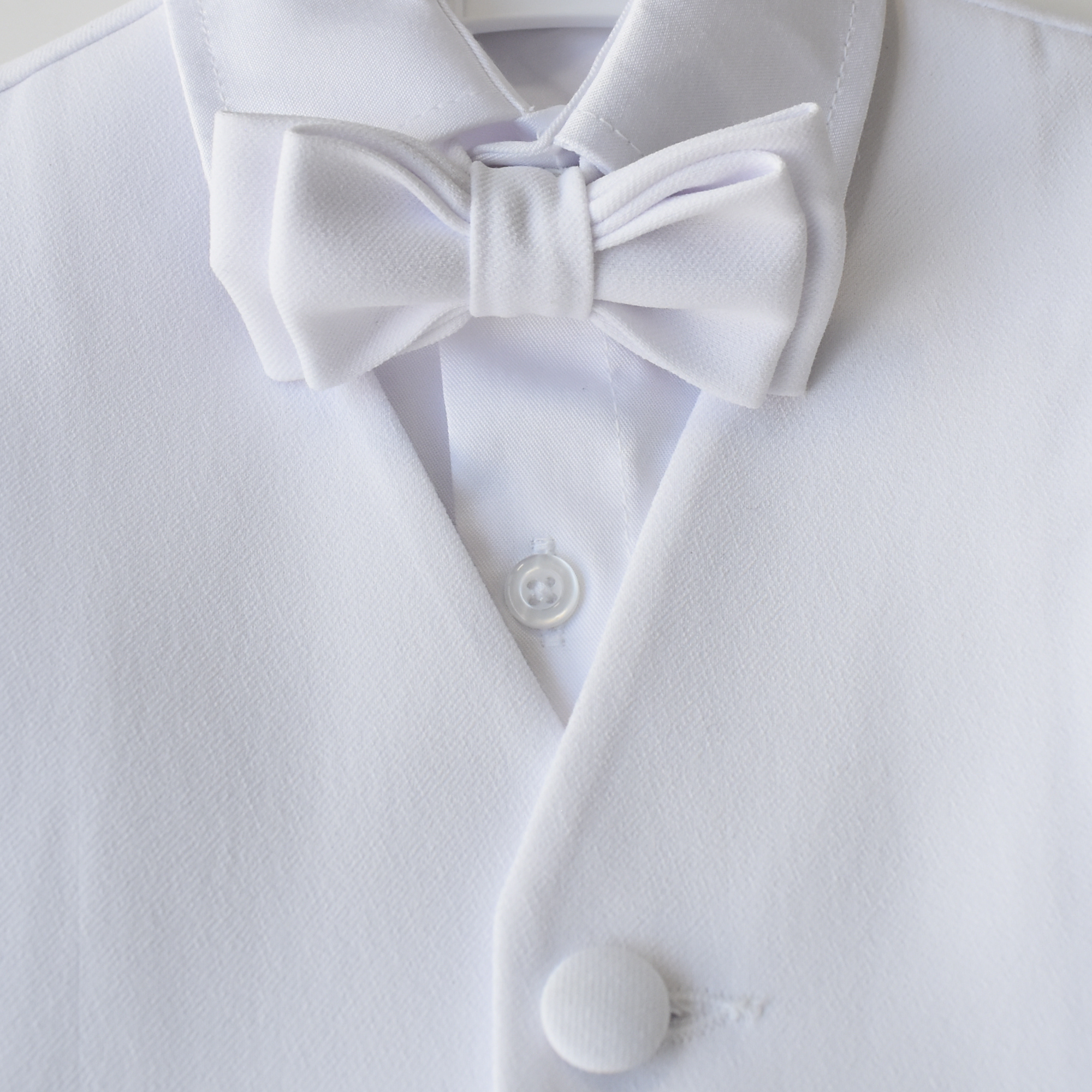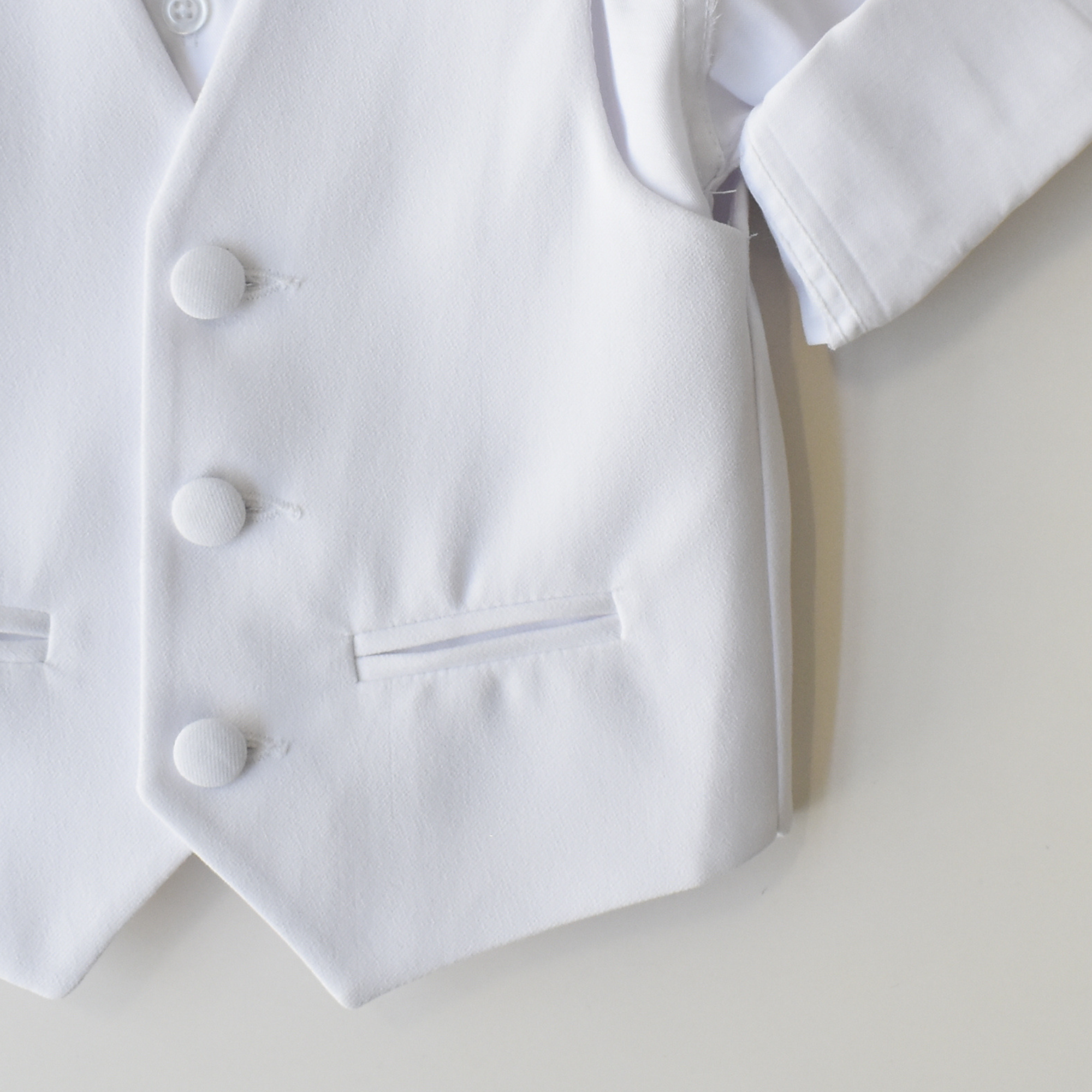 Habillez votre petit avec ce magnifique ensemble en lin blanc optique, comprenant un body chemise net et un gilet ajusté à boutons blancs. Le pantalon long à coupe droite complète parfaitement ce look semi-formel, parfait pour les baptêmes, fêtes de famille et occasions spéciales.