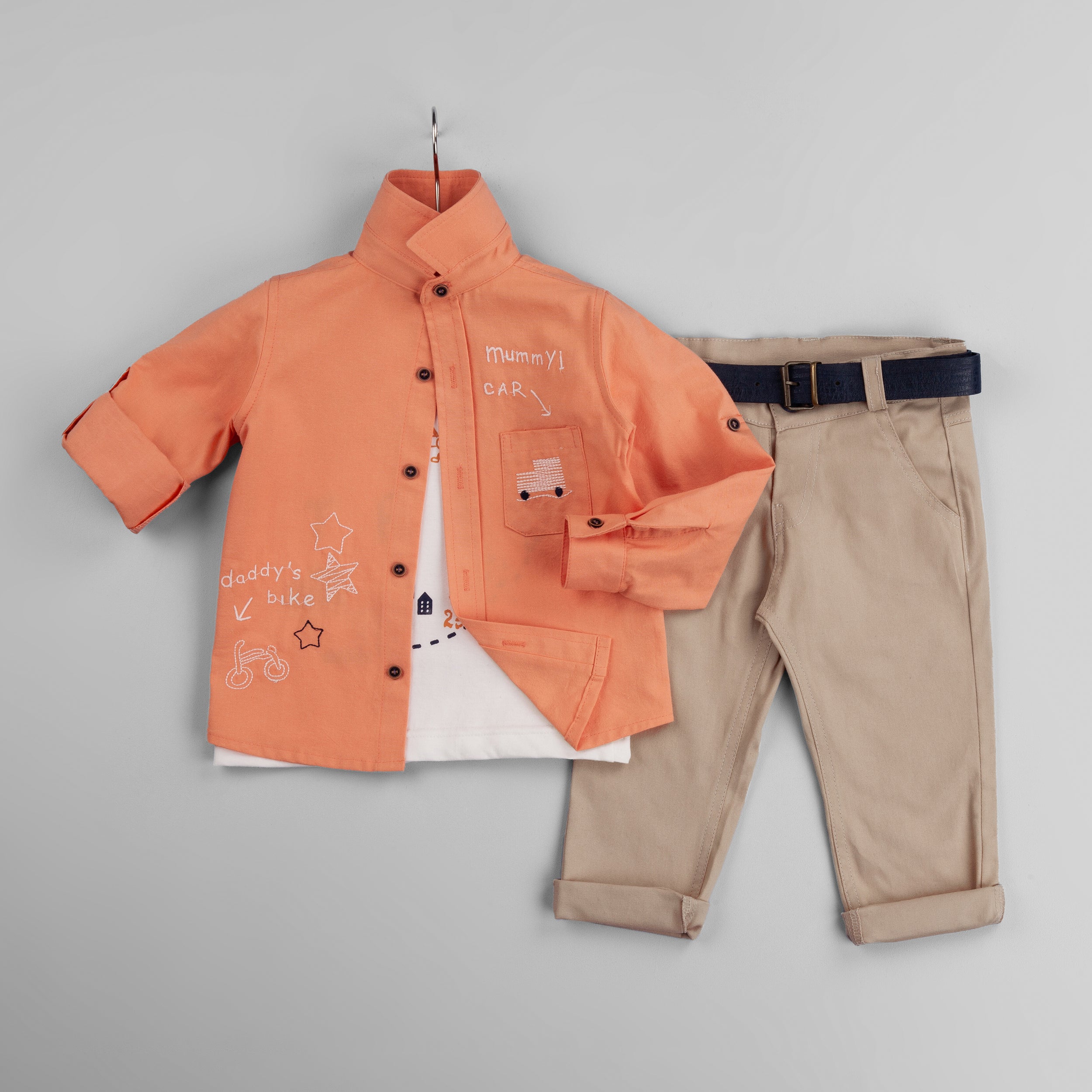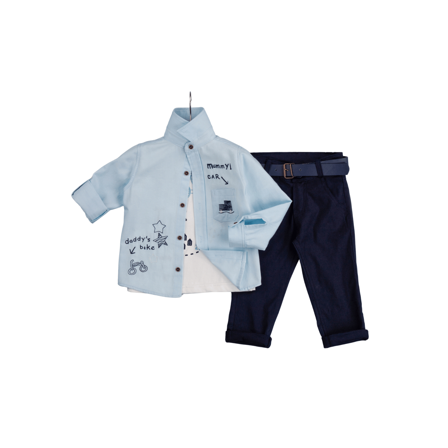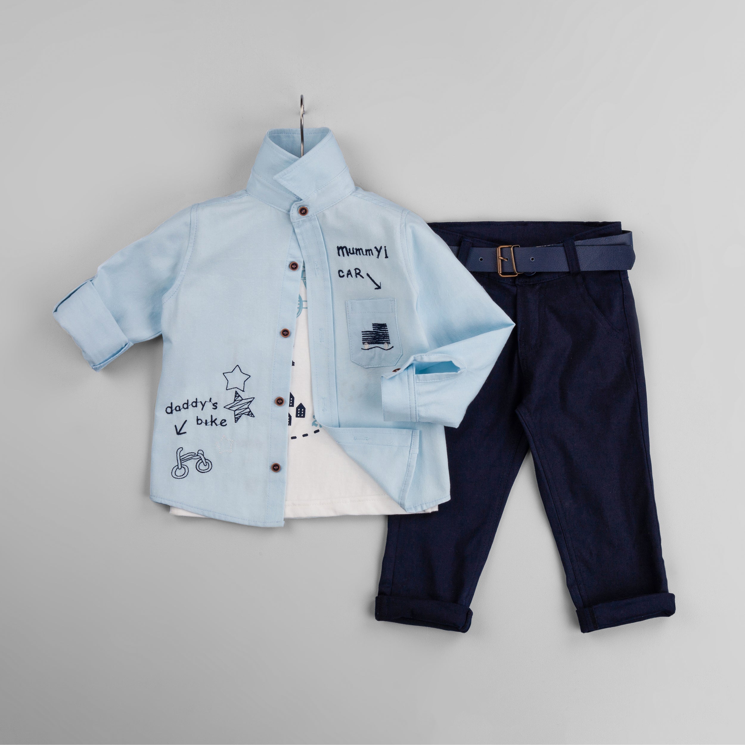 Ensemble en denim cool pour votre petit fauteur de troubles, y compris un gilet en denim, une chemise en lin mélangé blanc, un capri skinny et une ceinture.