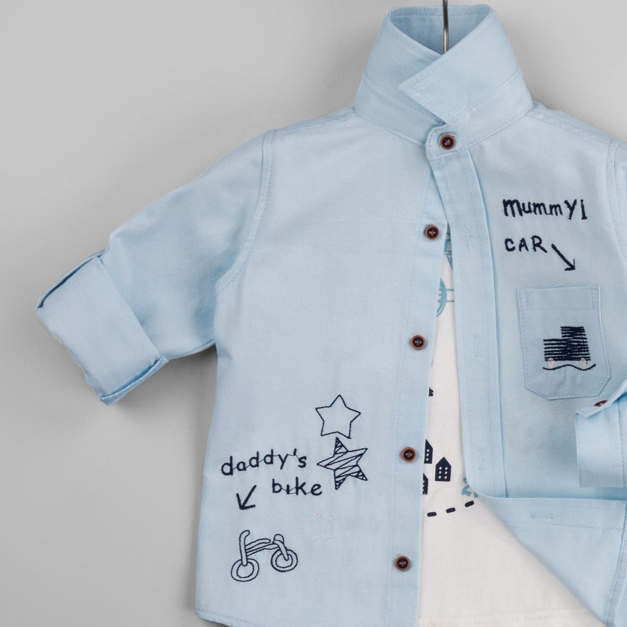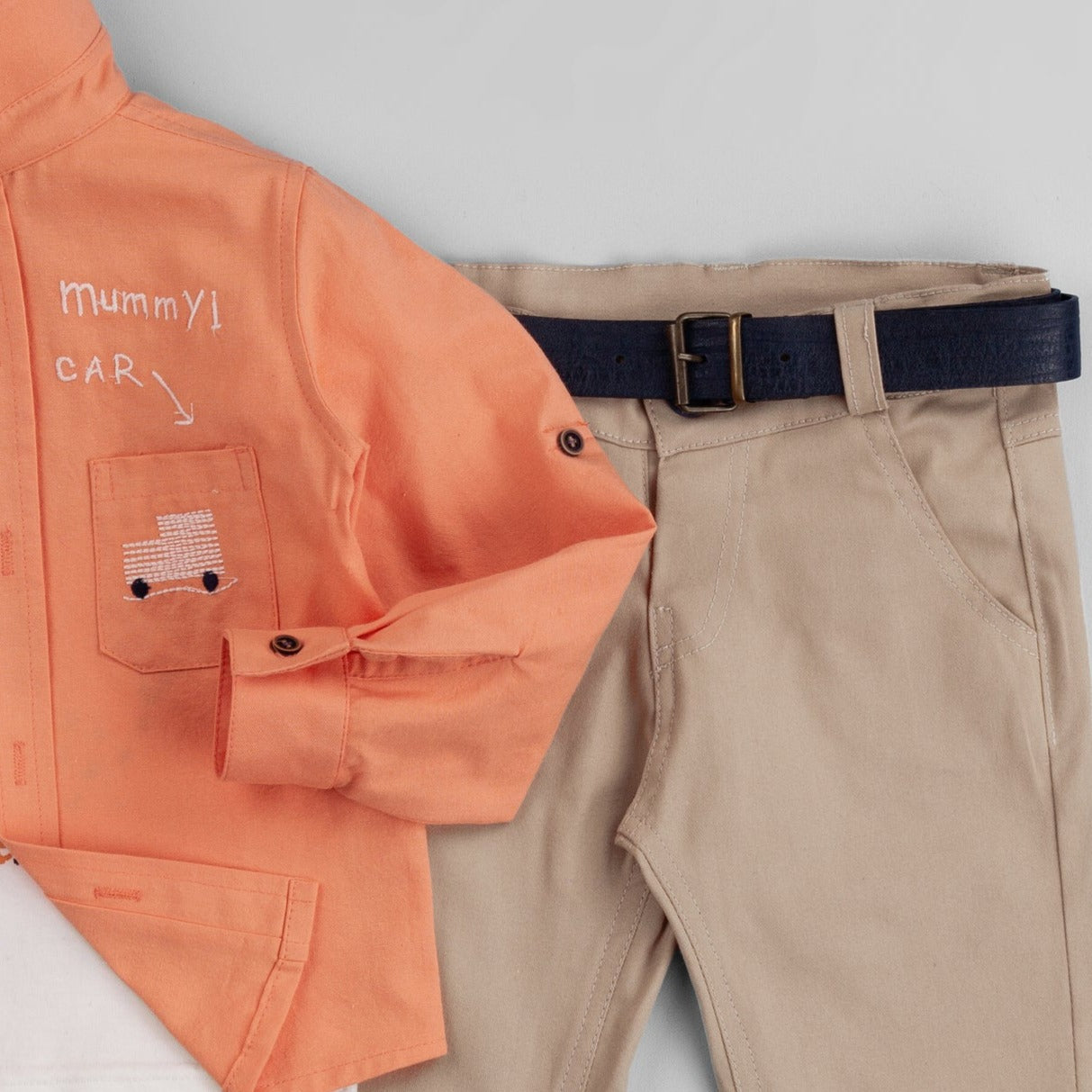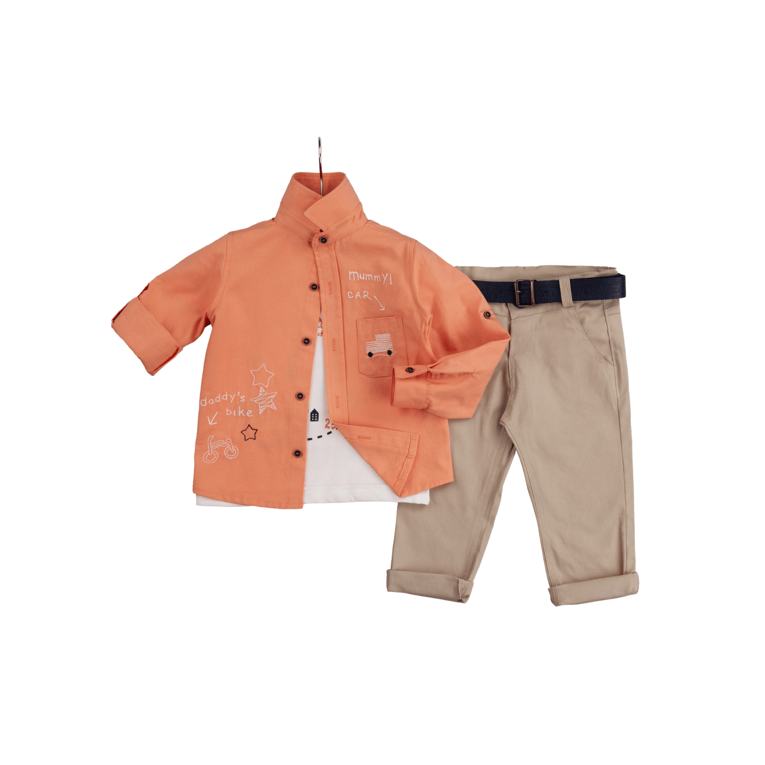 Ensemble en denim cool pour votre petit fauteur de troubles, y compris un gilet en denim, une chemise en lin mélangé blanc, un capri skinny et une ceinture.