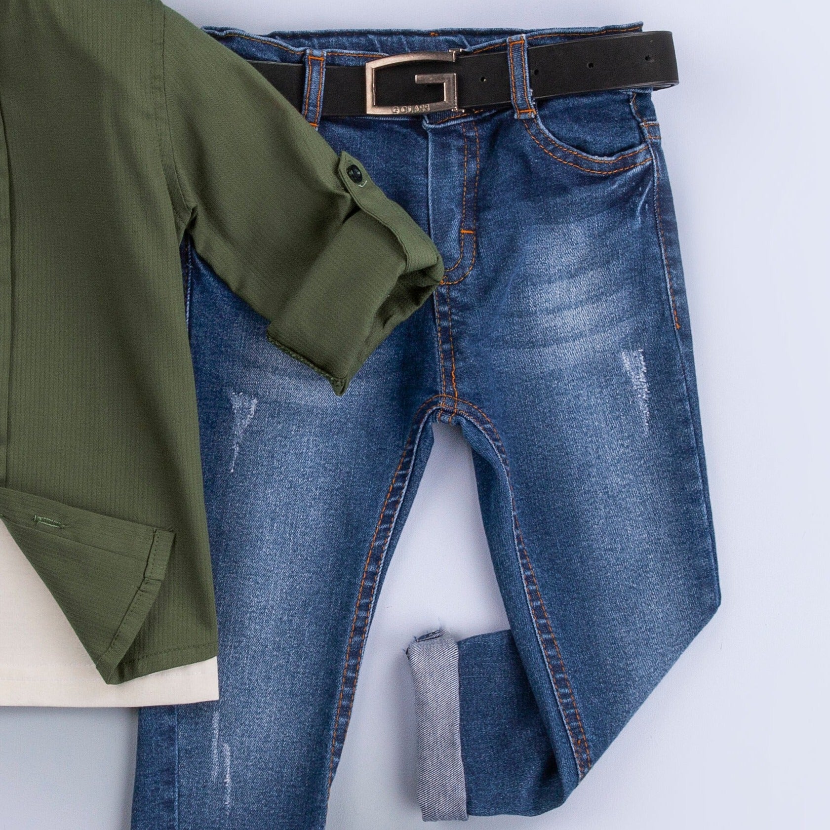 Ensemble en denim cool pour votre petit fauteur de troubles, y compris un gilet en denim, une chemise en lin mélangé blanc, un capri skinny et une ceinture.