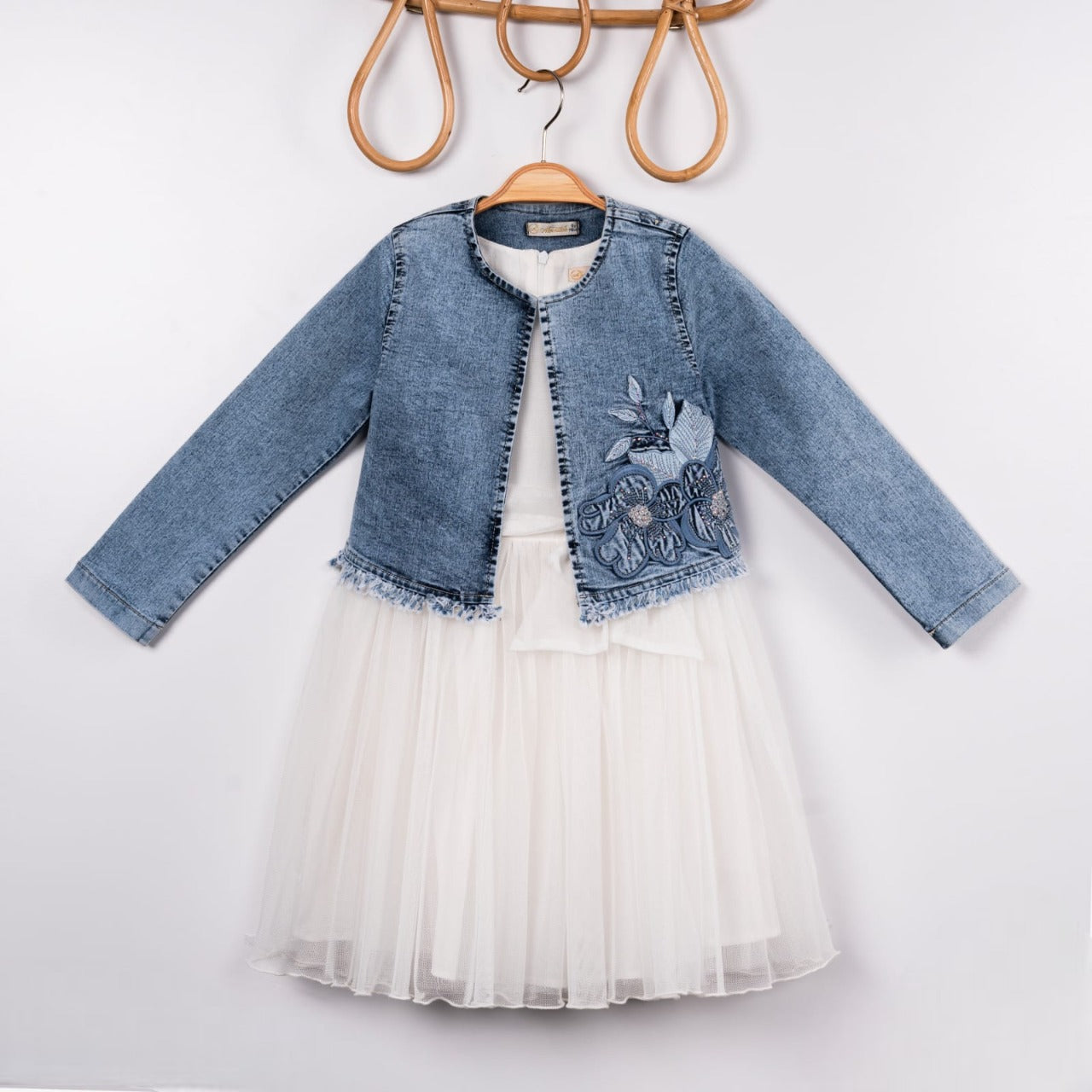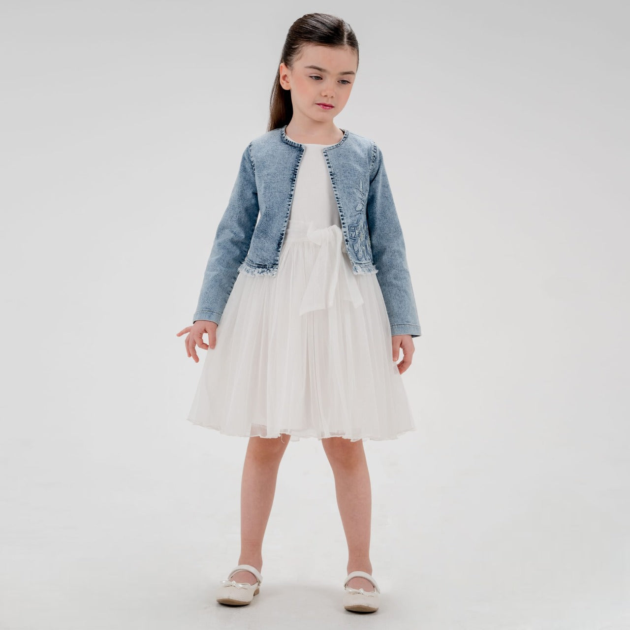 Superbe robe en tulle avec doublure en coton (55% coton / 45% polyester) pour votre petite chérie avec ceinture à la taille et cardigan original assorti pour cette tenue de vacances parfaite (55% coton / 45% polyester).