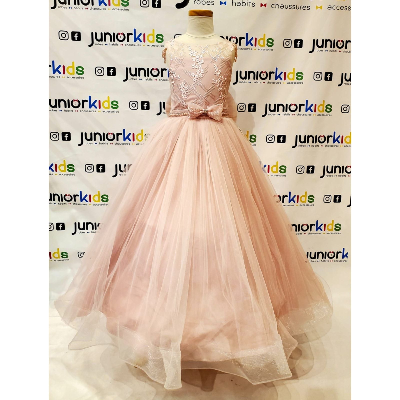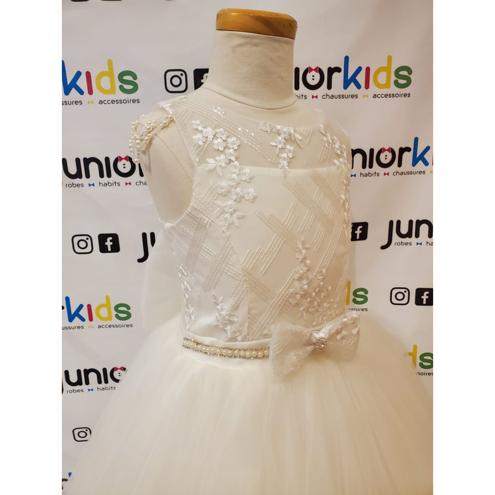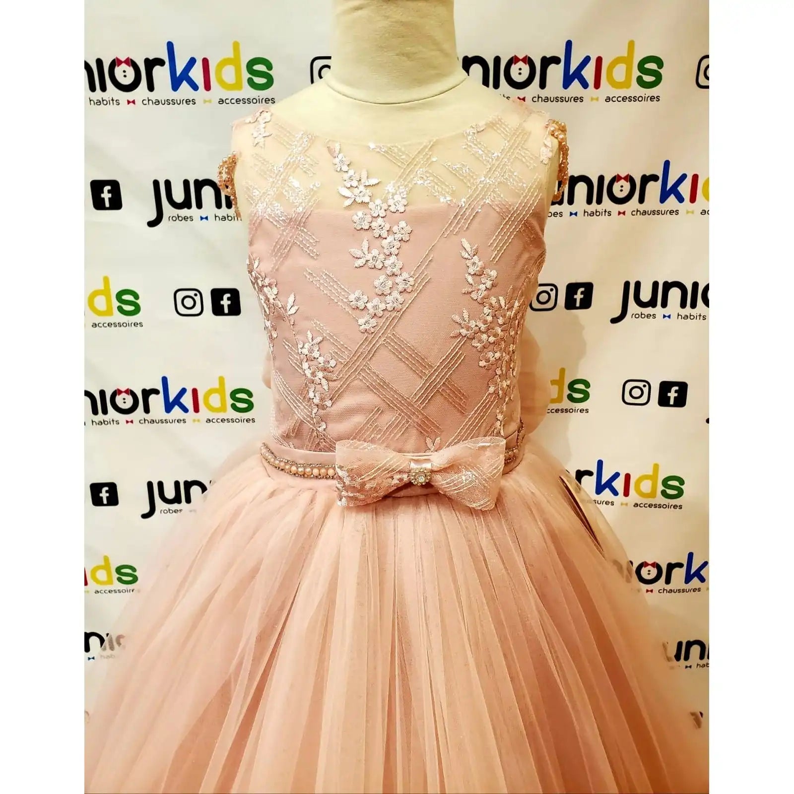 Une vraie robe de princesse brodée avec un fond en tulle et un grand nœud assorti. Un modèle JuniorKids exclusif!