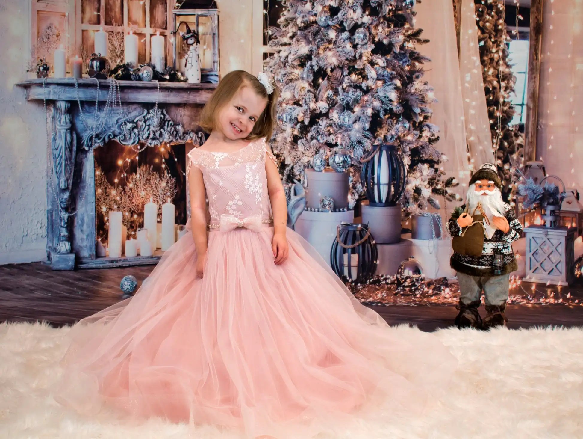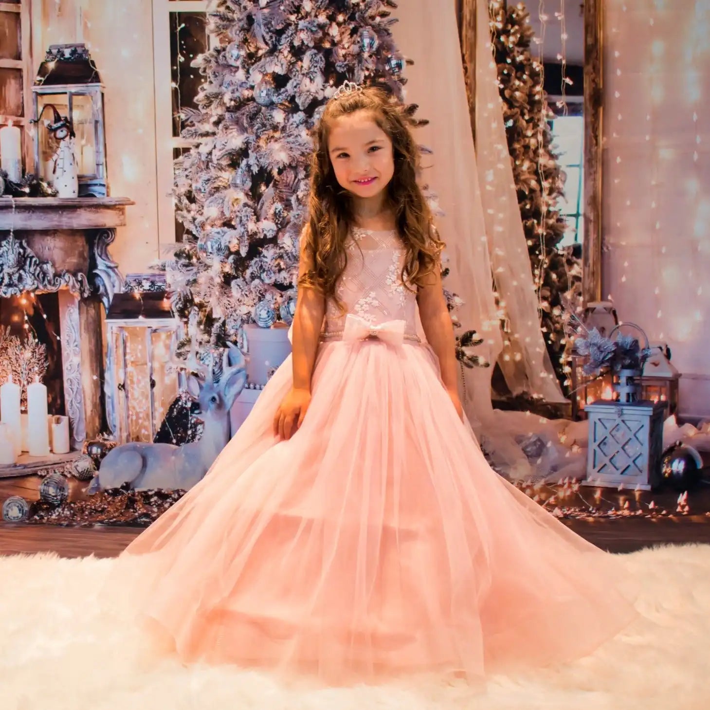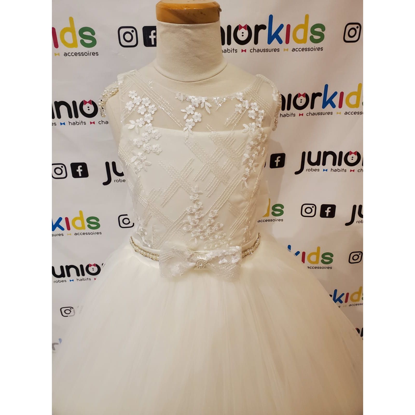 Une vraie robe de princesse brodée avec un fond en tulle et un grand nœud assorti. Un modèle JuniorKids exclusif!