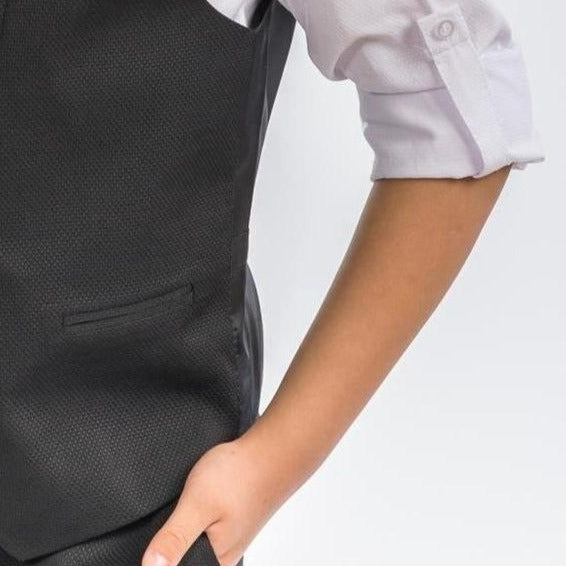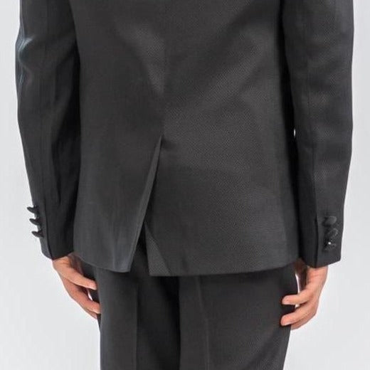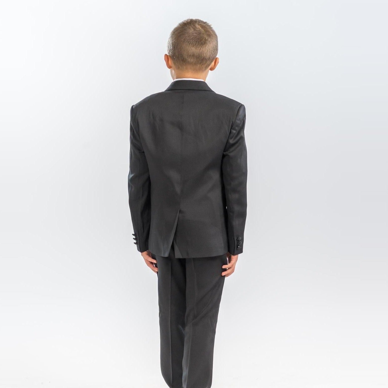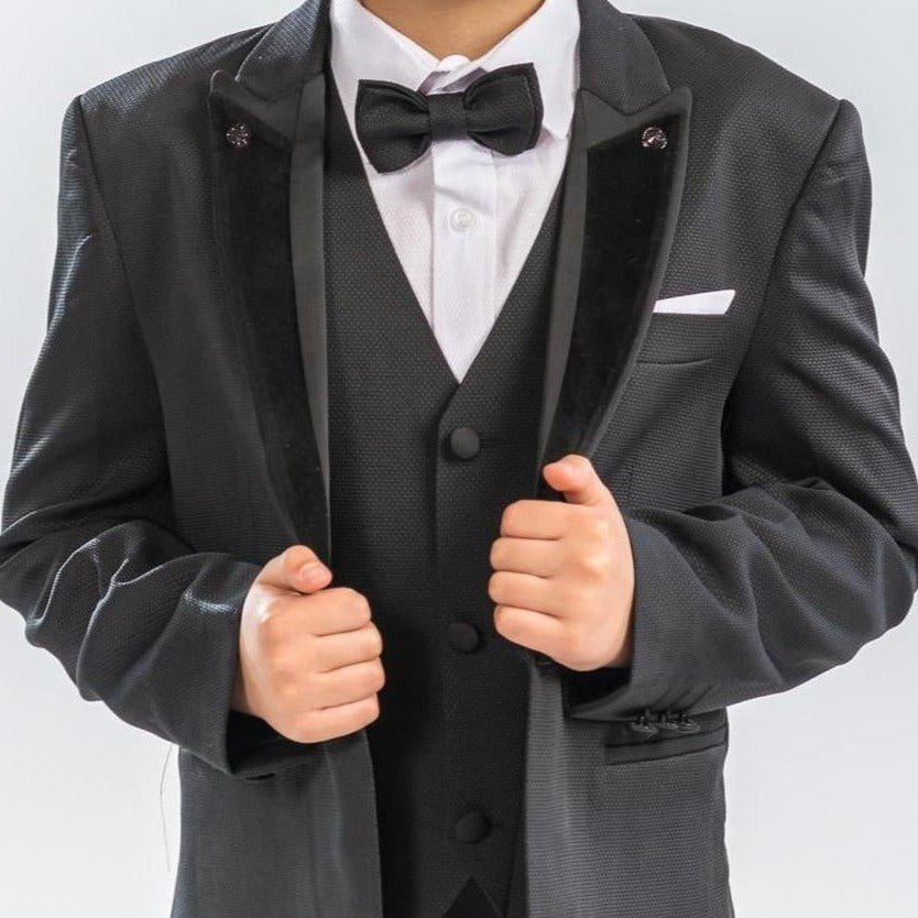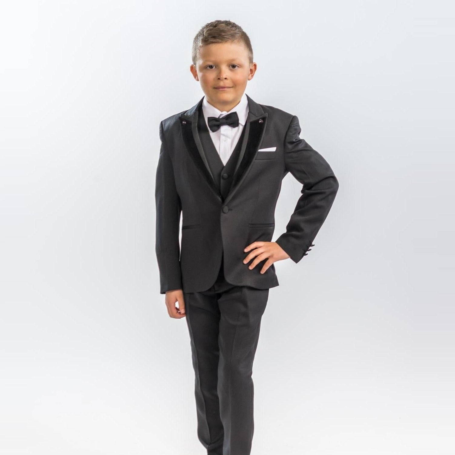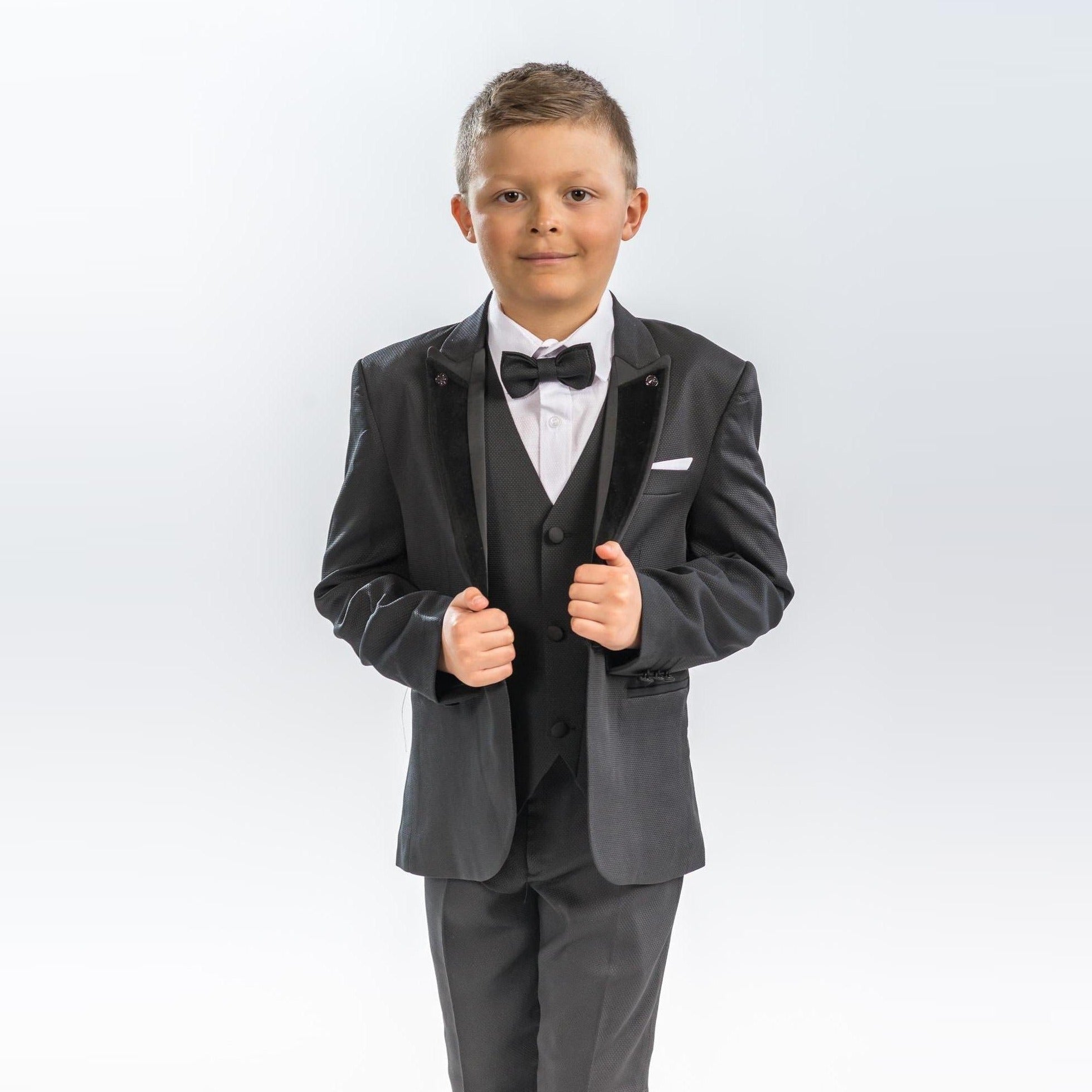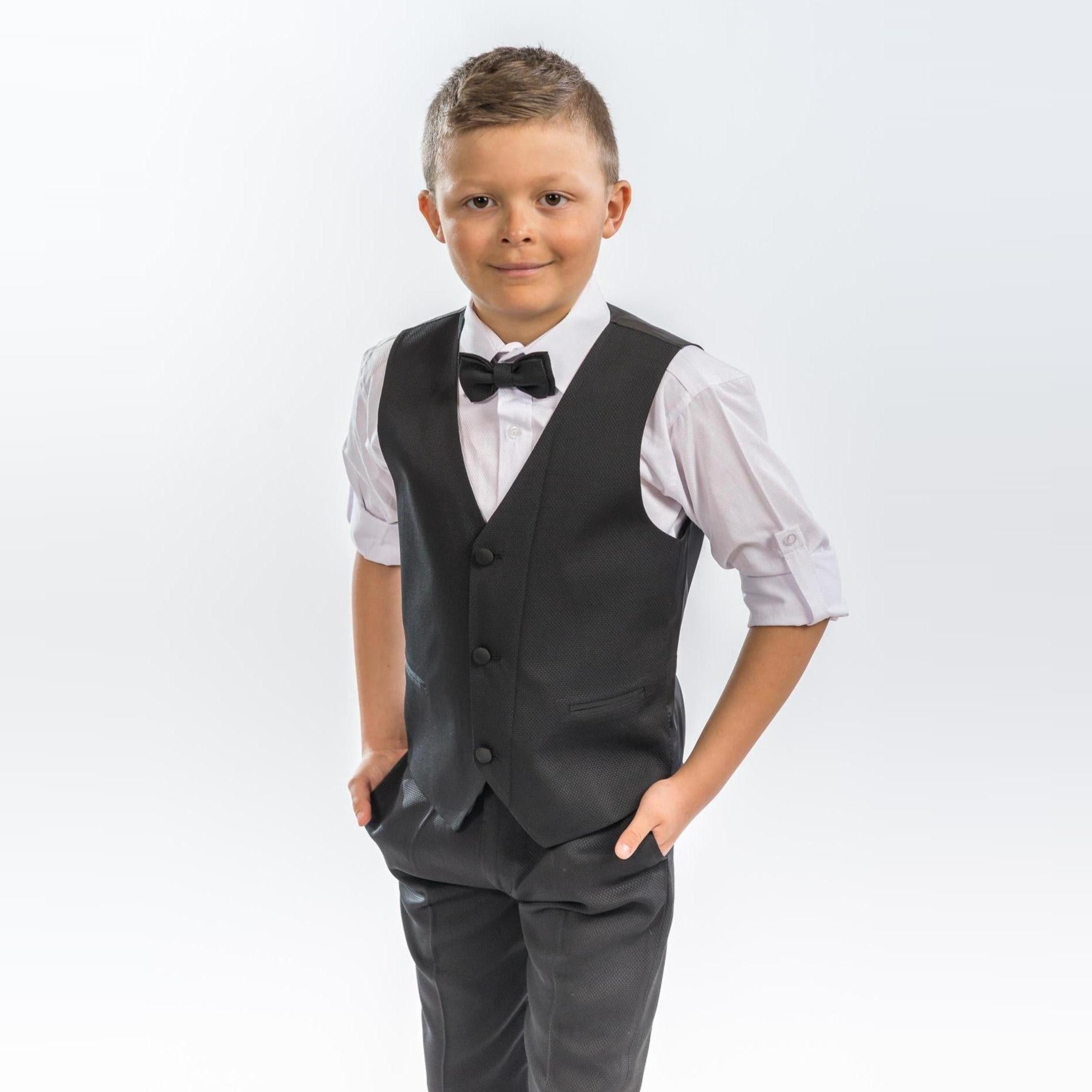 Superbe costume slim fit comprenant blazer, pantalon assorti, gilet en U, chemise en coton imprimé, mouchoir et noeud papillon. Un style très européen et un look exclusif JuniorKids!