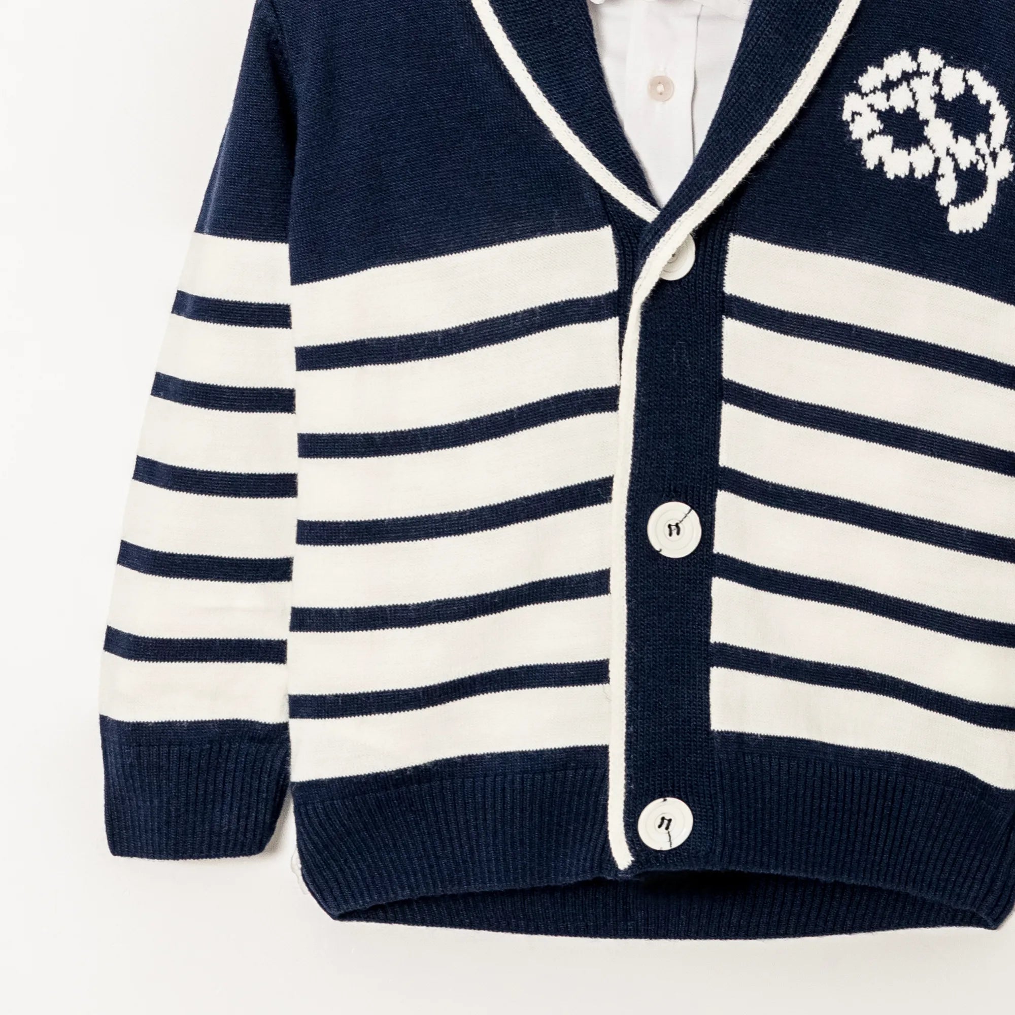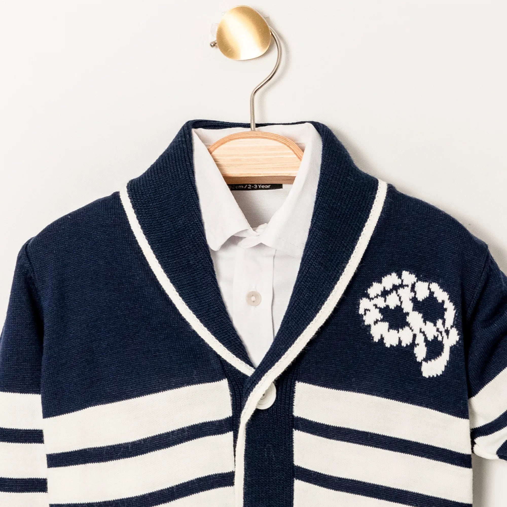 Cet ensemble élégant comprend une chemise douce 100 % coton, un cardigan rayé et un jean, parfait en toute occasion. Avec son design classique et sa coupe confortable, votre enfant sera au top de sa forme.