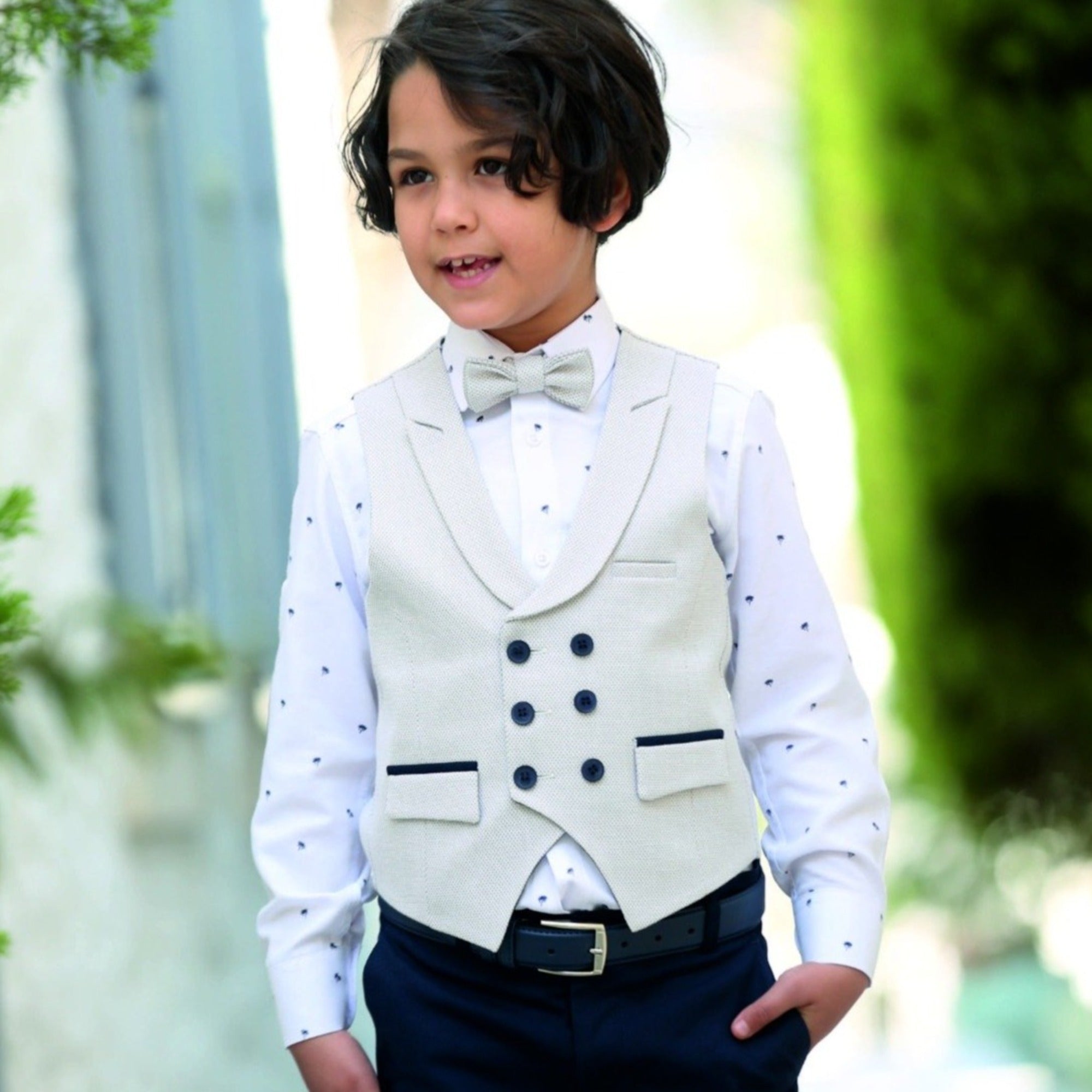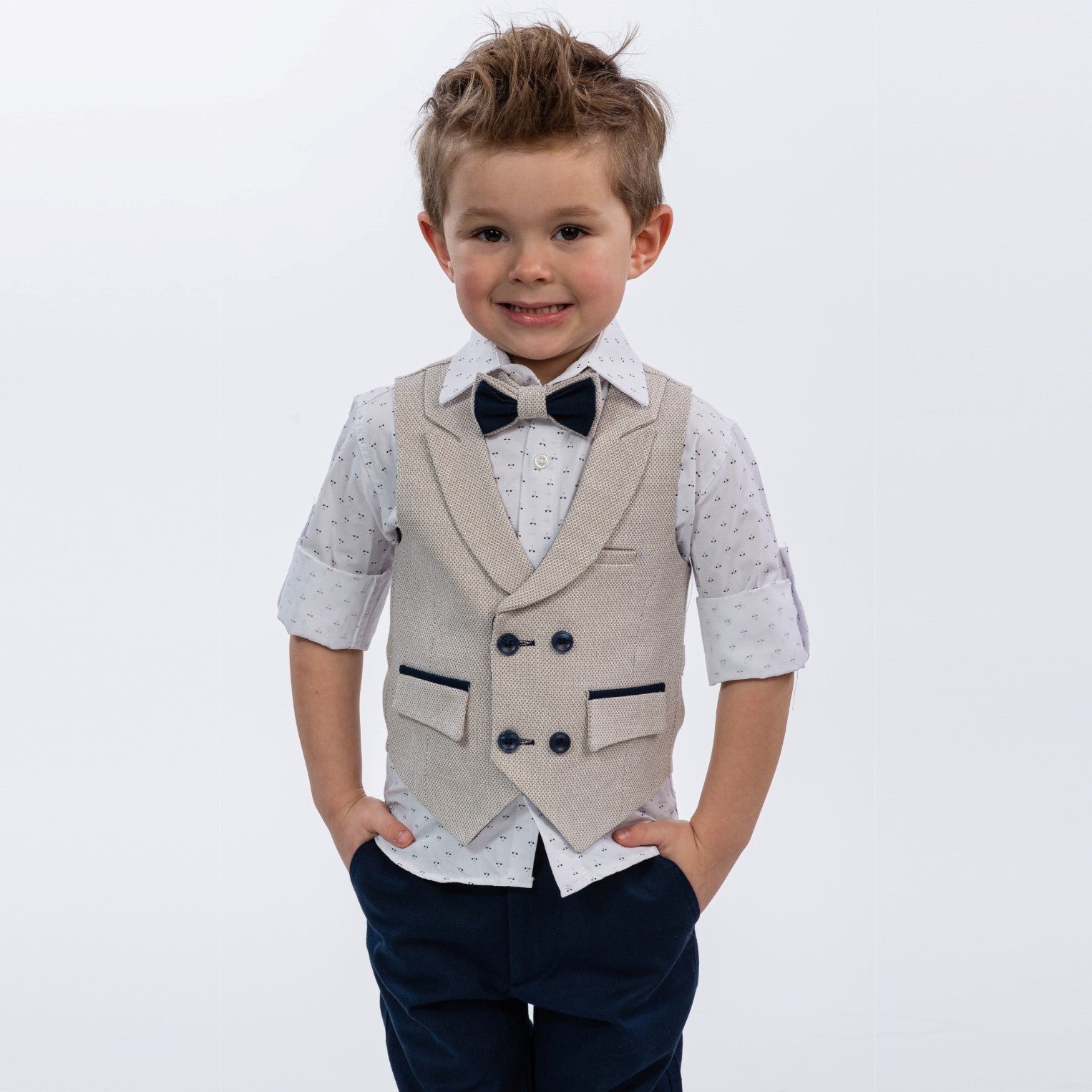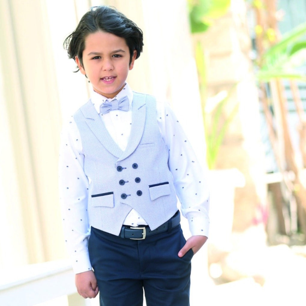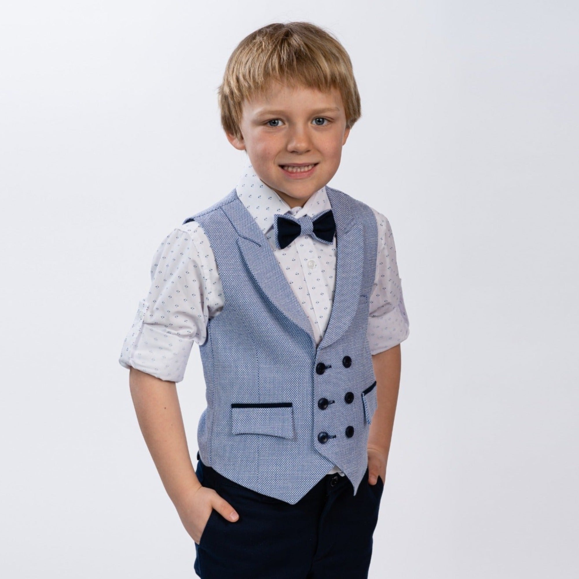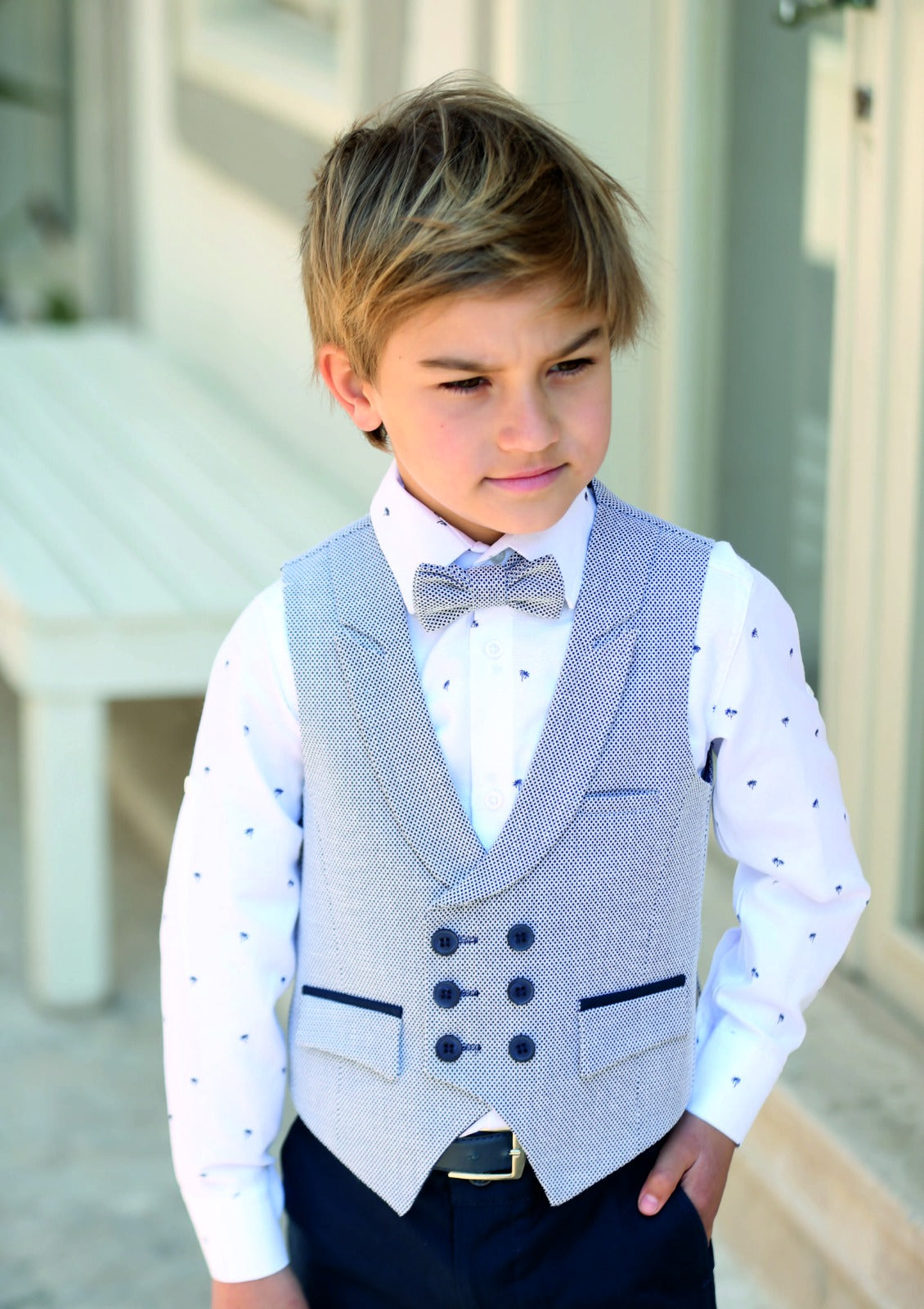 Formal vest set with U-shaped lapel, patterned cotton shirt, matching adjustable skinny navy pants and bowtie. A JuniorKids exclusive creation!