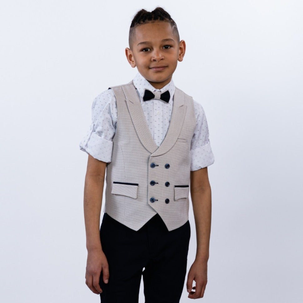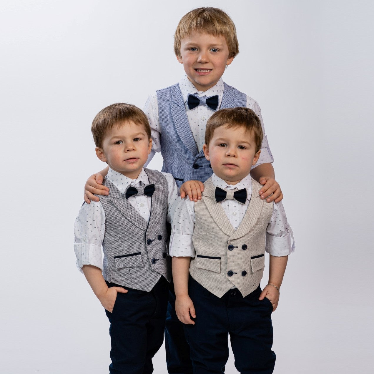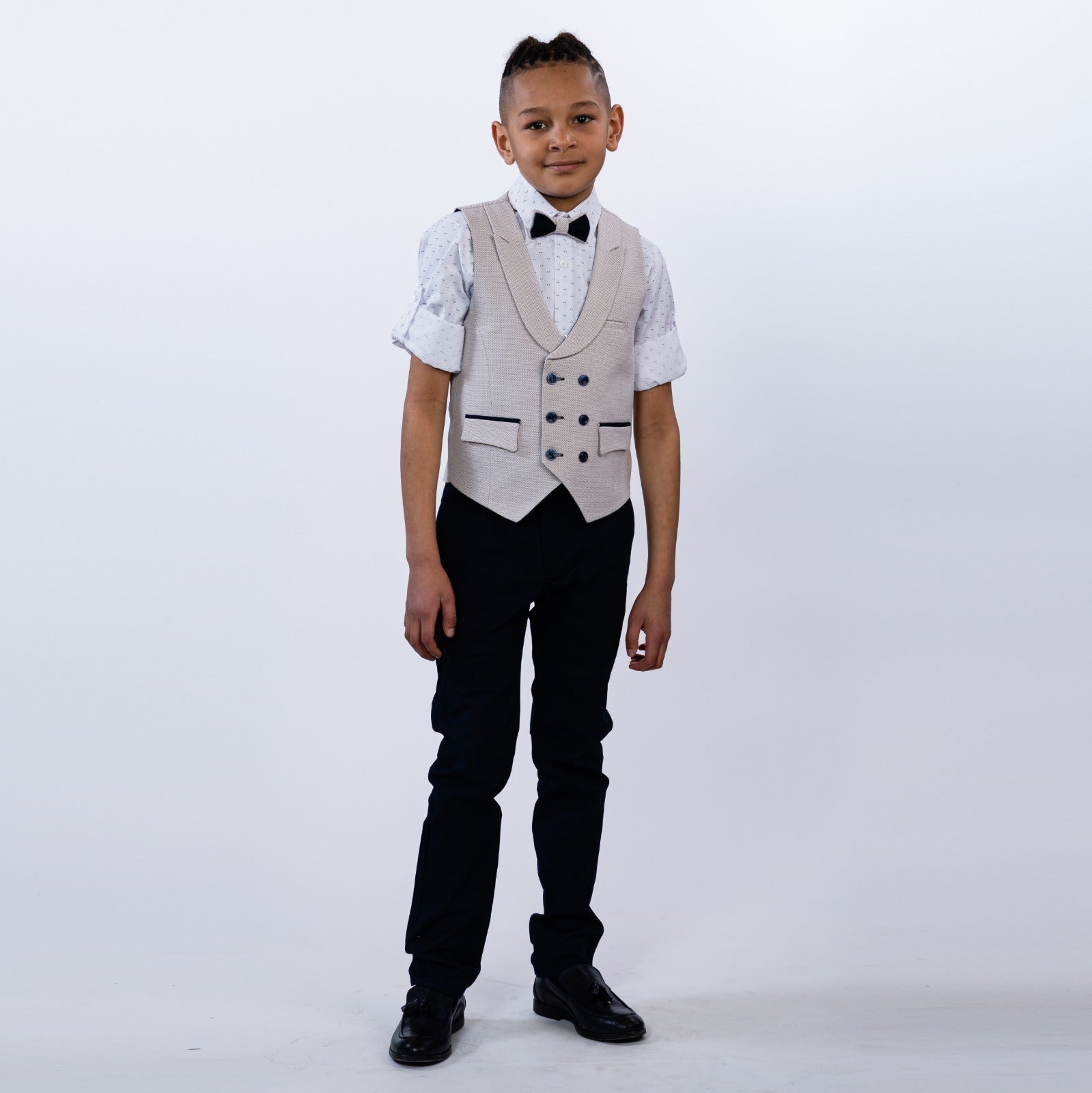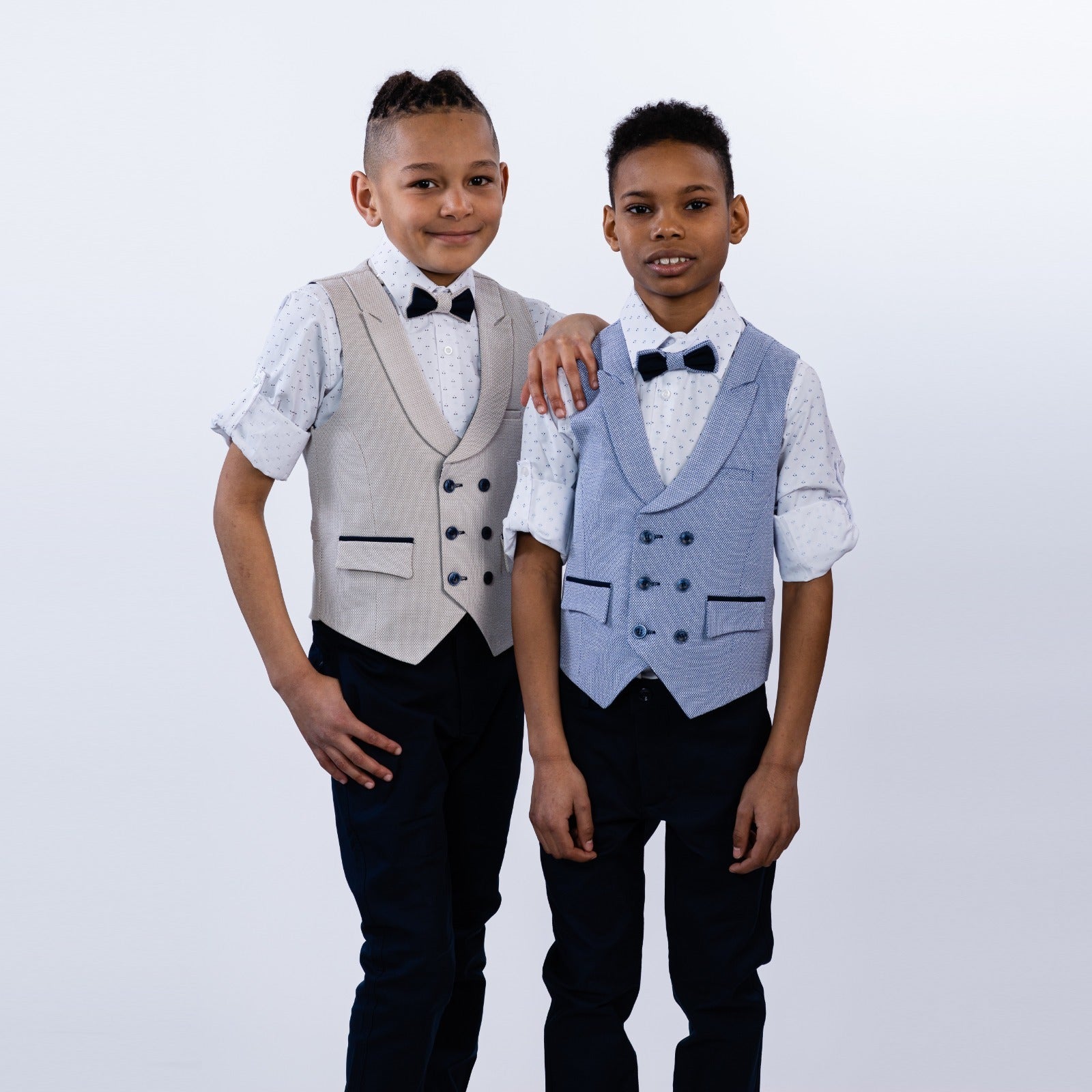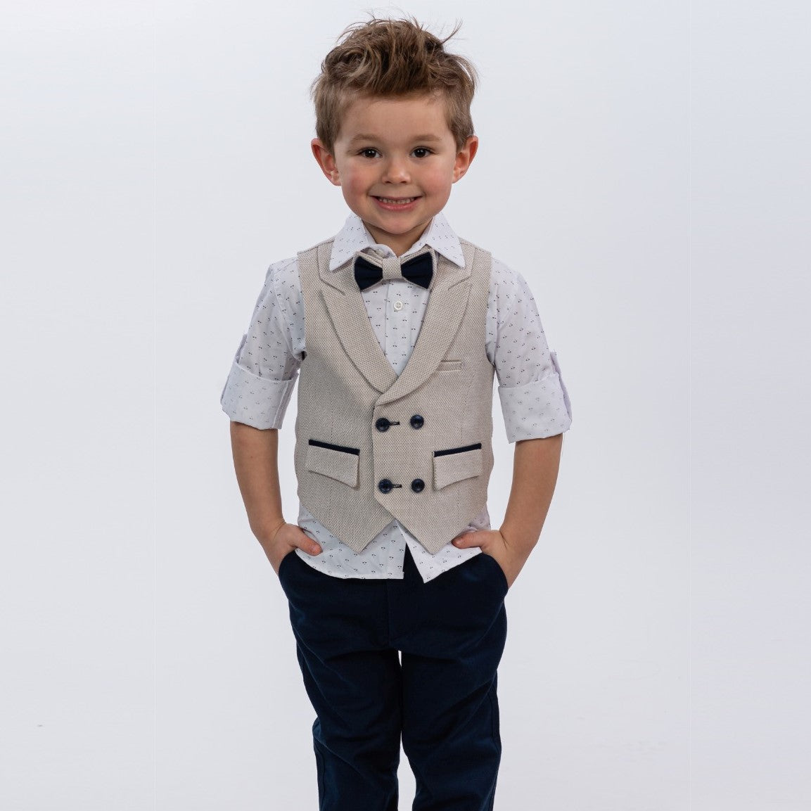 Formal vest set with U-shaped lapel, patterned cotton shirt, matching adjustable skinny navy pants and bowtie. A JuniorKids exclusive creation!