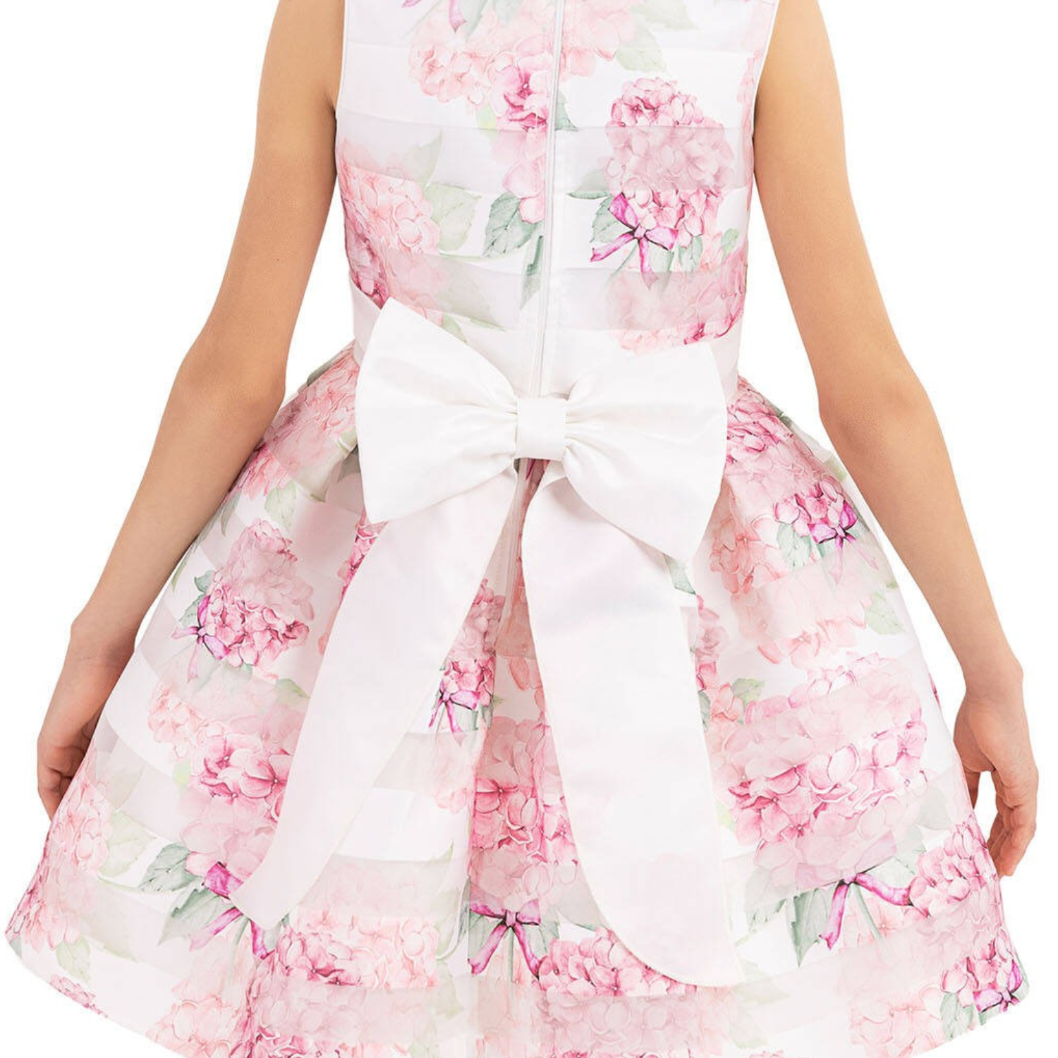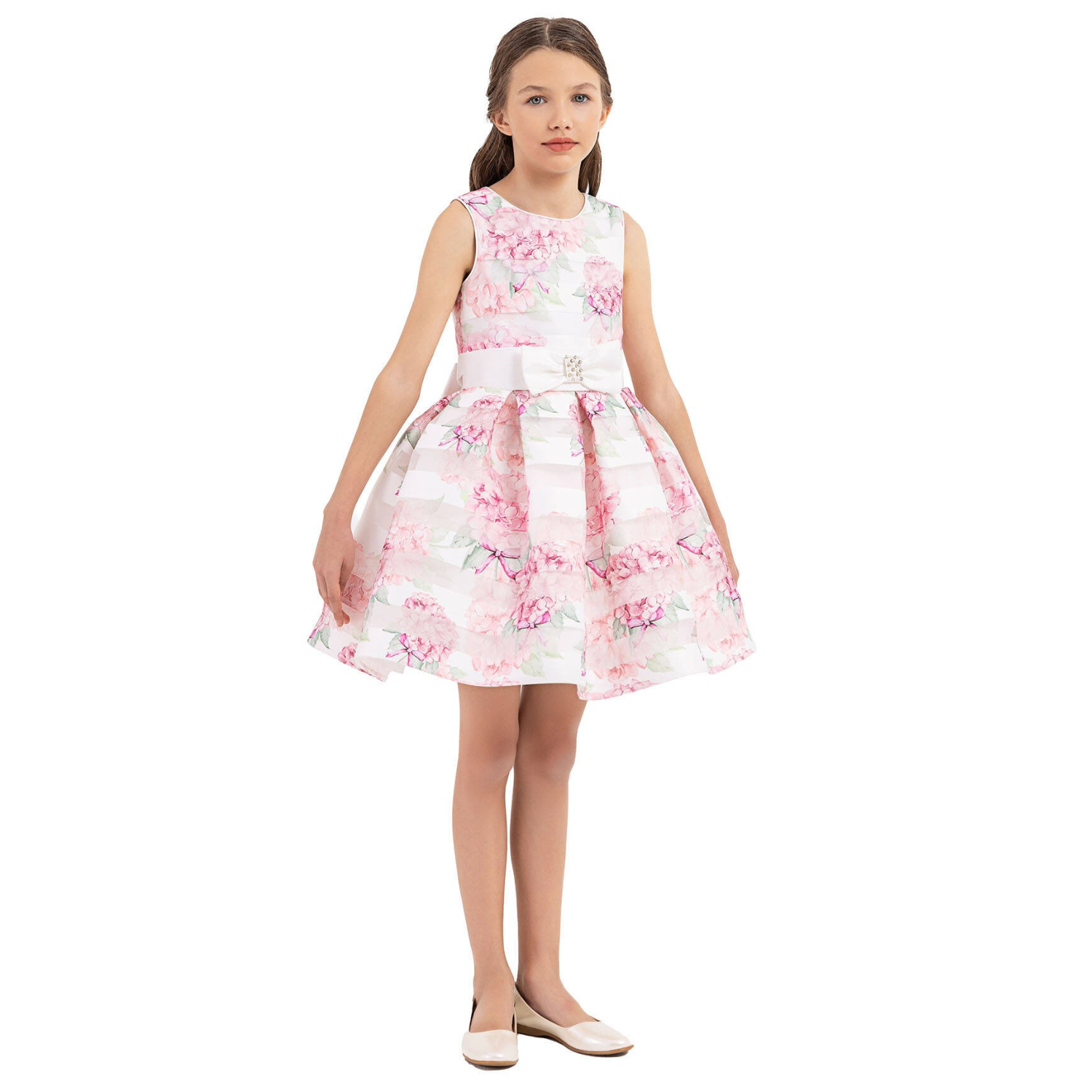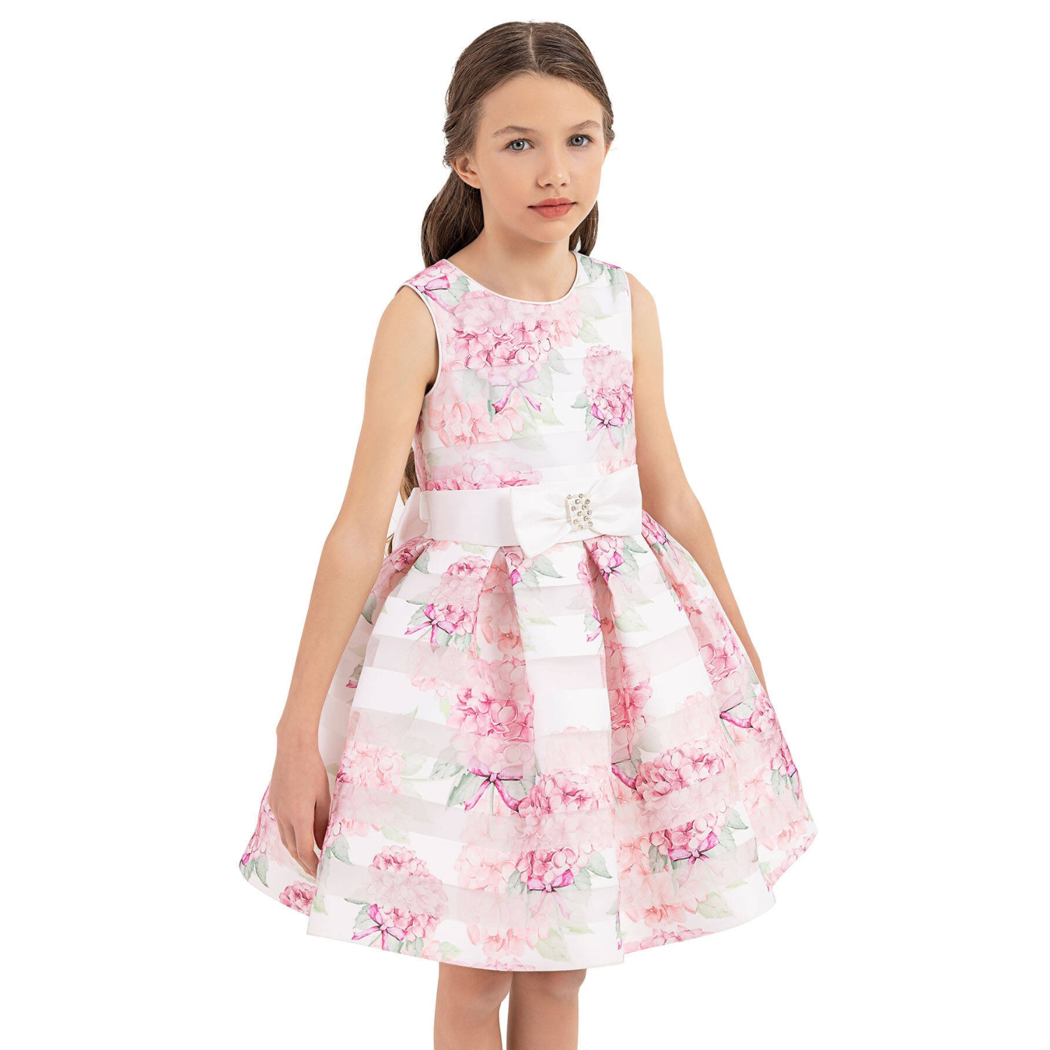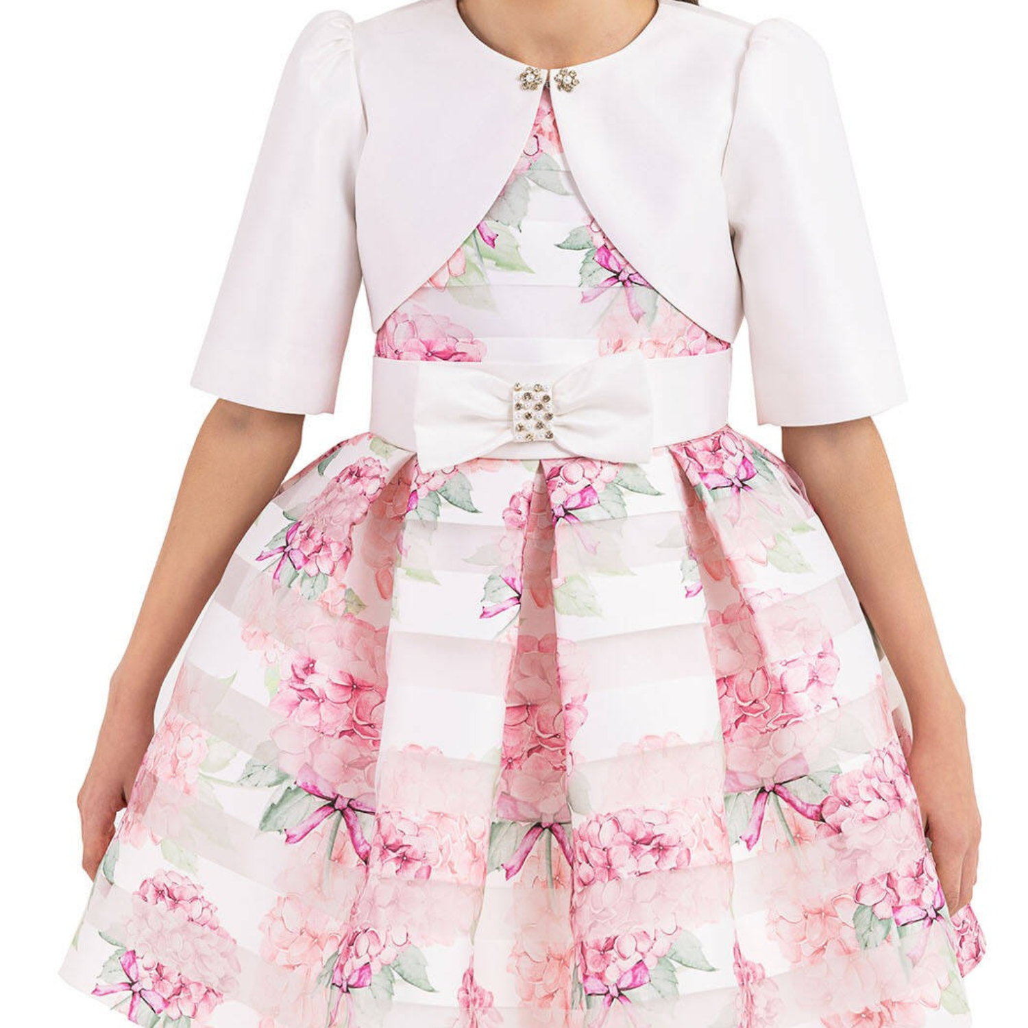 Make your little one shine with this gorgeous sleeveless dress and bolero set! Designed with a striped textured jacquard fabric, this dress combines elegance and sophistication. The delicate floral print and matte satin belt with pearl and stone embroidery add a refined touch.