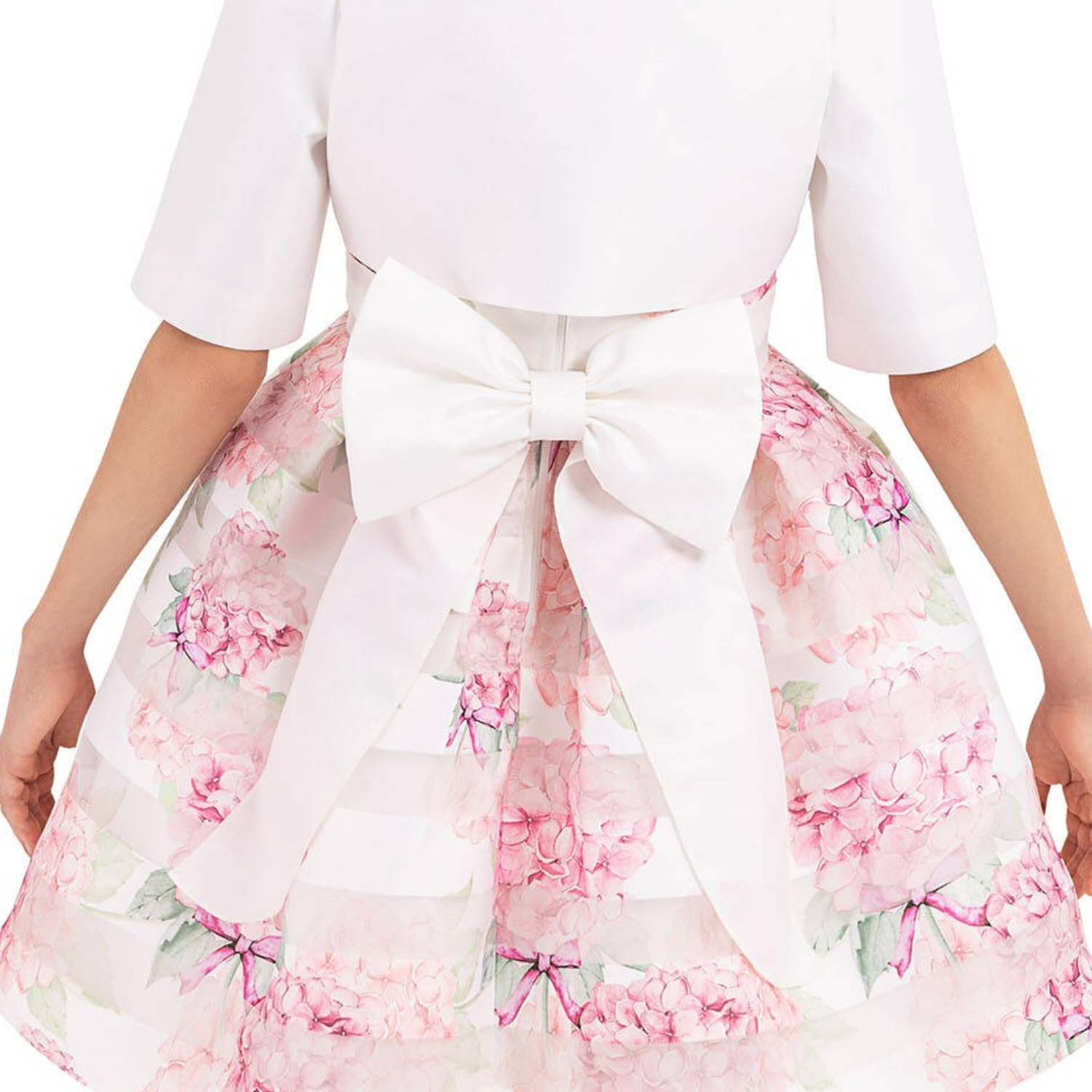 The inverted pleated skirt with soft tulle lining creates a beautiful, voluminous silhouette, while the charming bow at the back makes this dress a showstopper. Paired with a three-quarter sleeve satin bolero with shirred shoulders, this set is perfect for birthdays, parties, and special occasions.