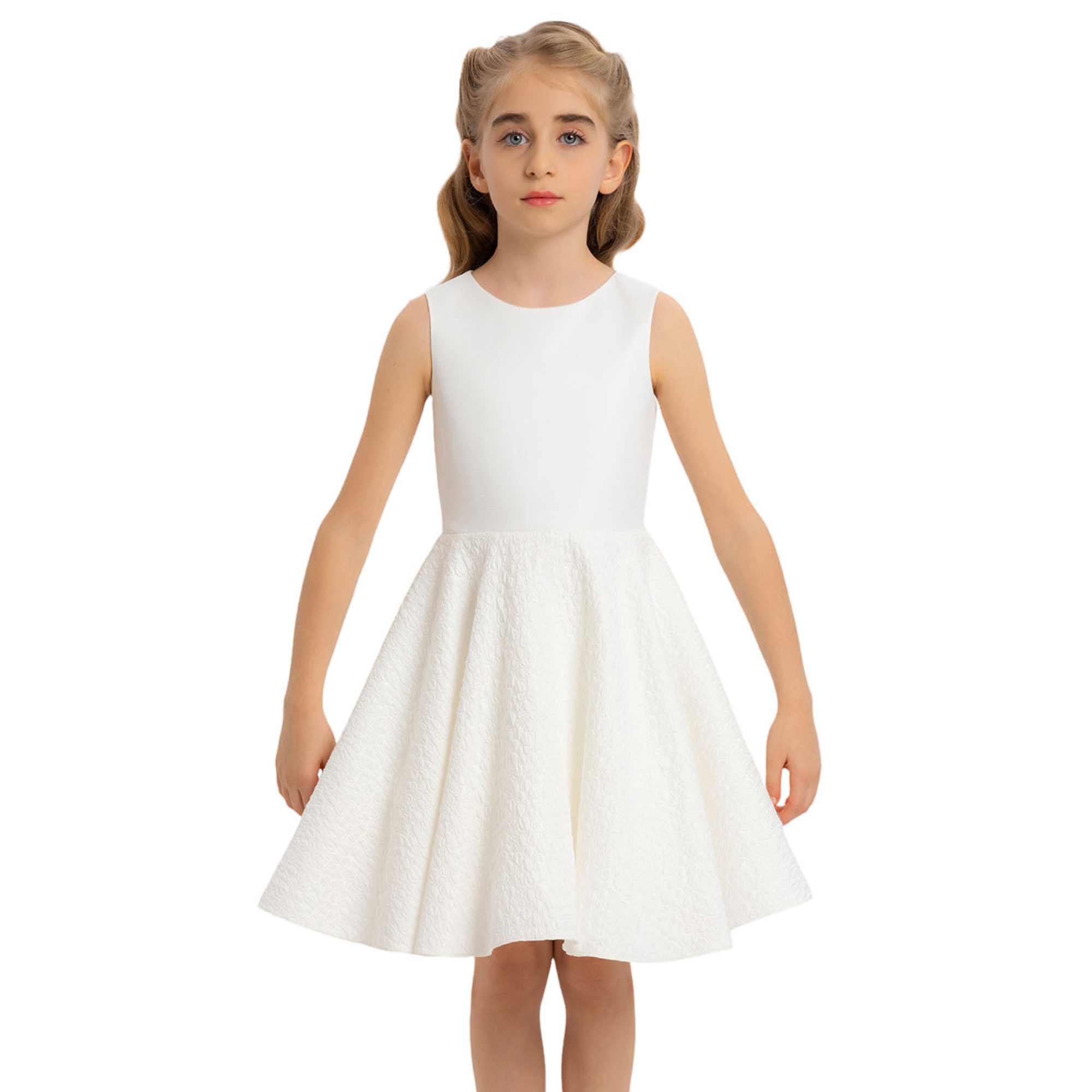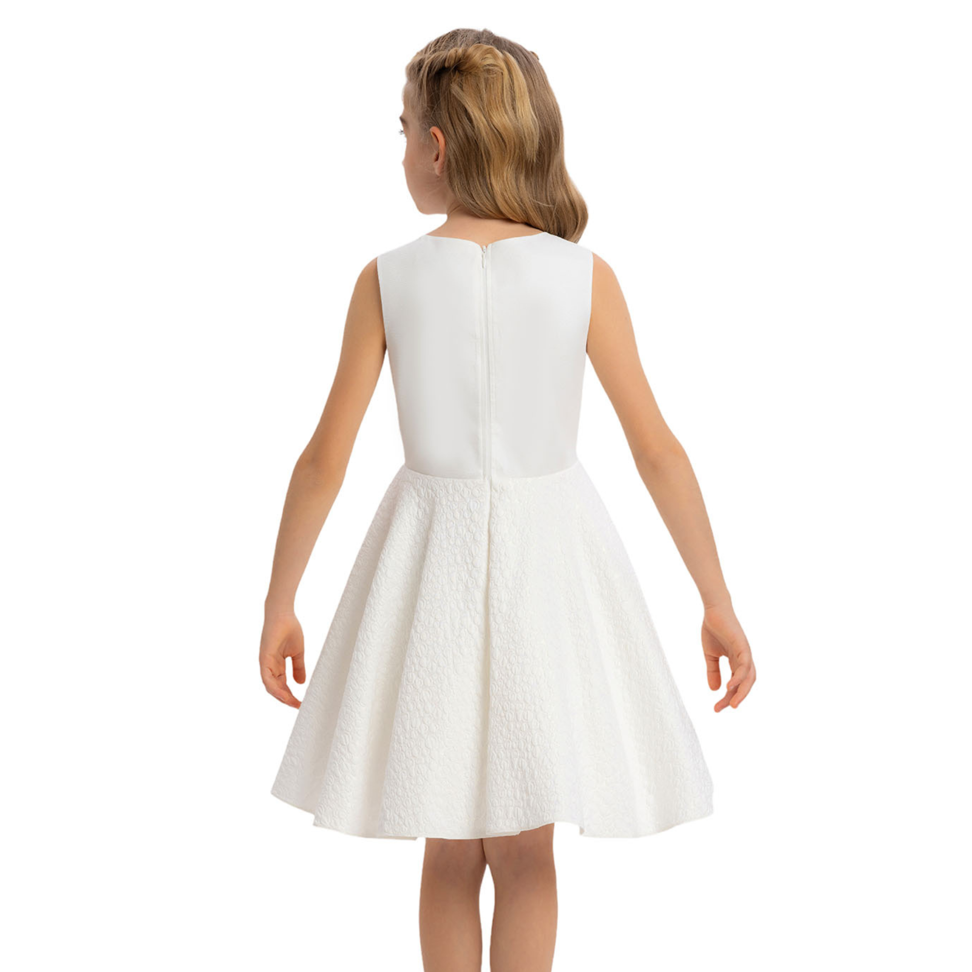 The sleeveless dress, made from premium jacquard fabric, stands out with its ruffled skirt details and plain fabric ribbons for a refined and delicate look. Designed with a 100% cotton lining, it ensures comfort and breathability, making it ideal for summer celebrations.