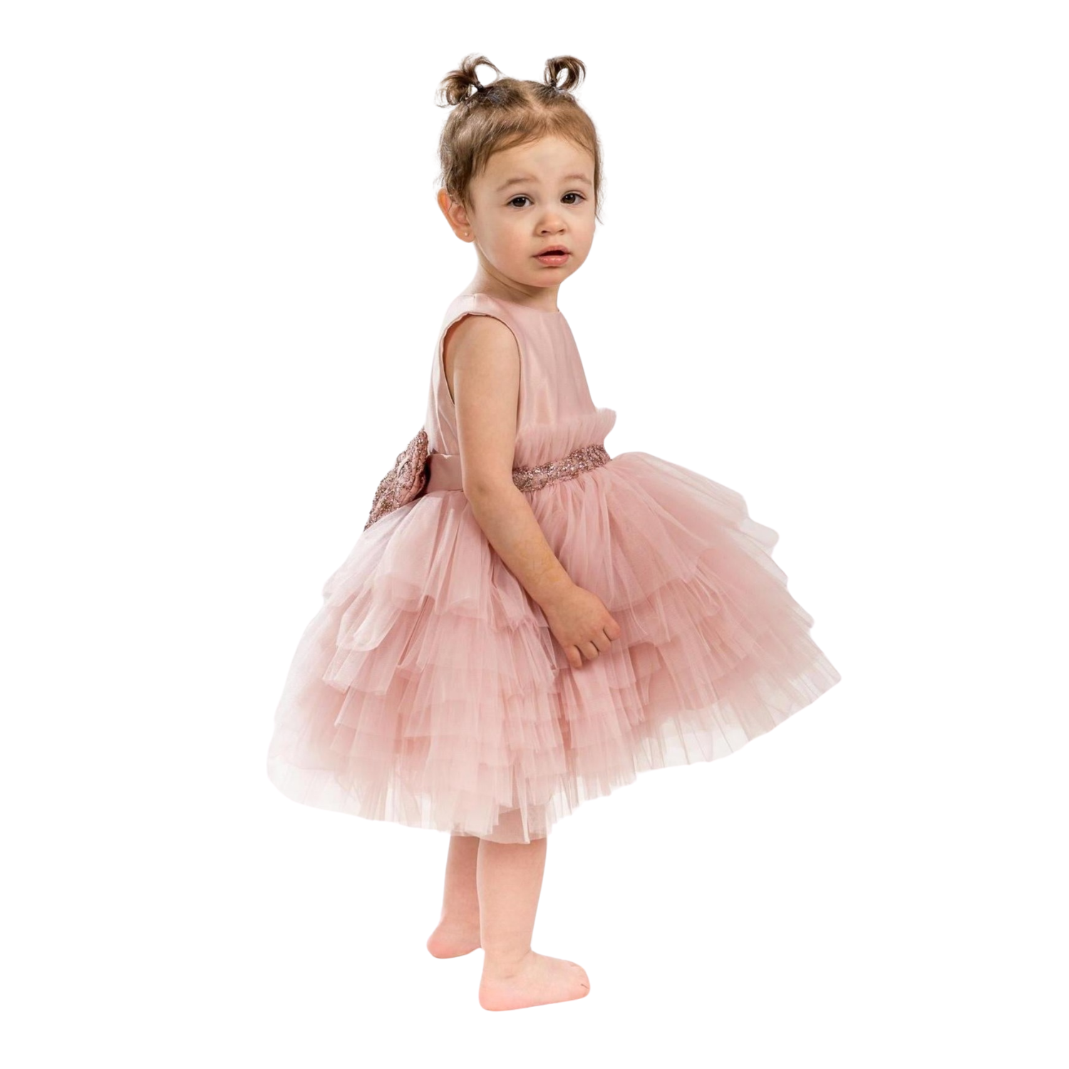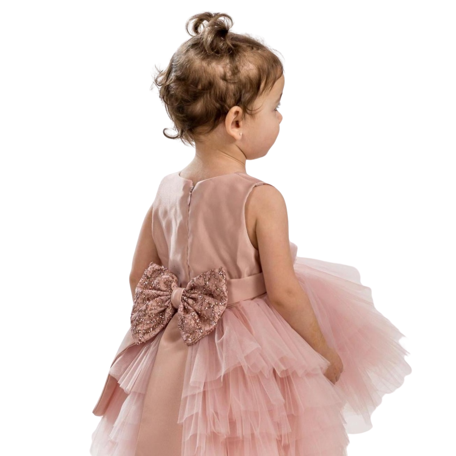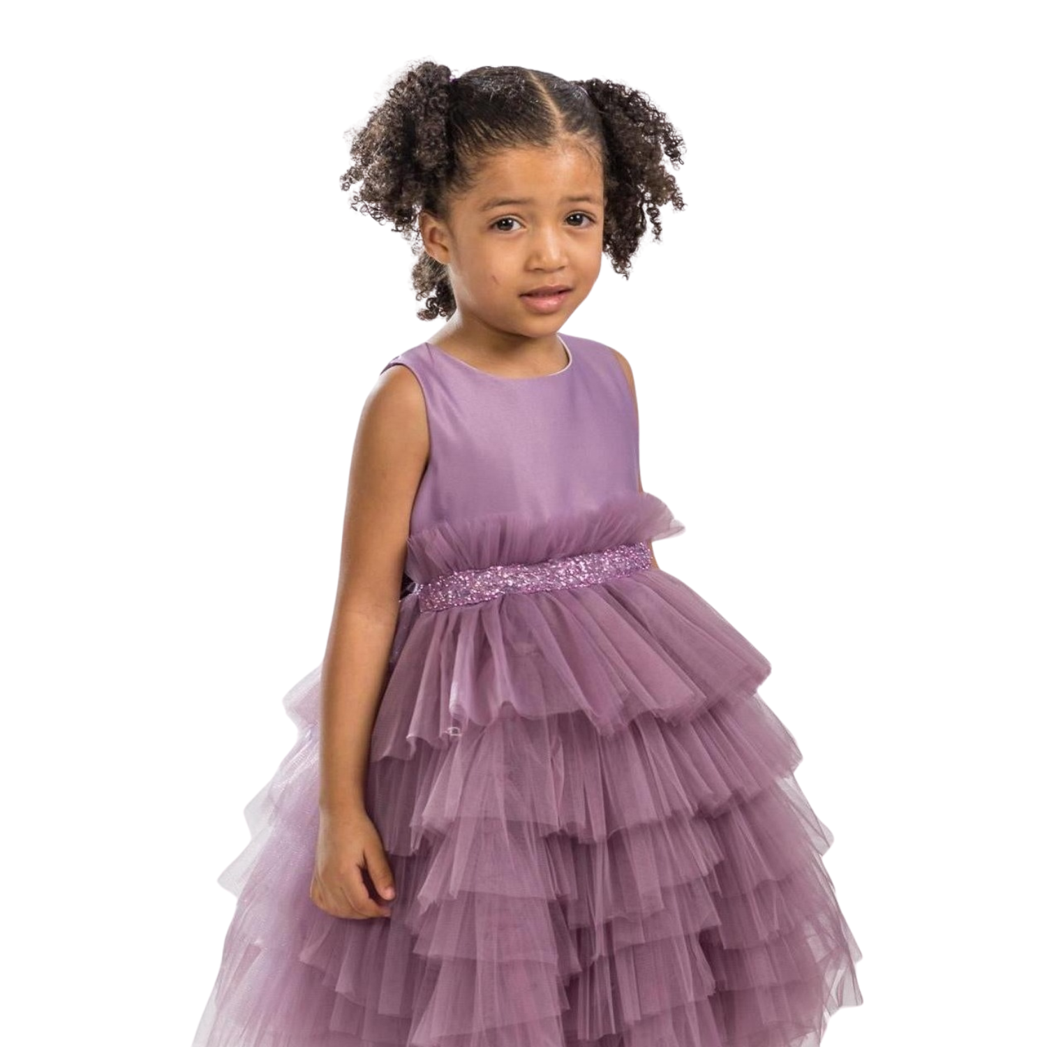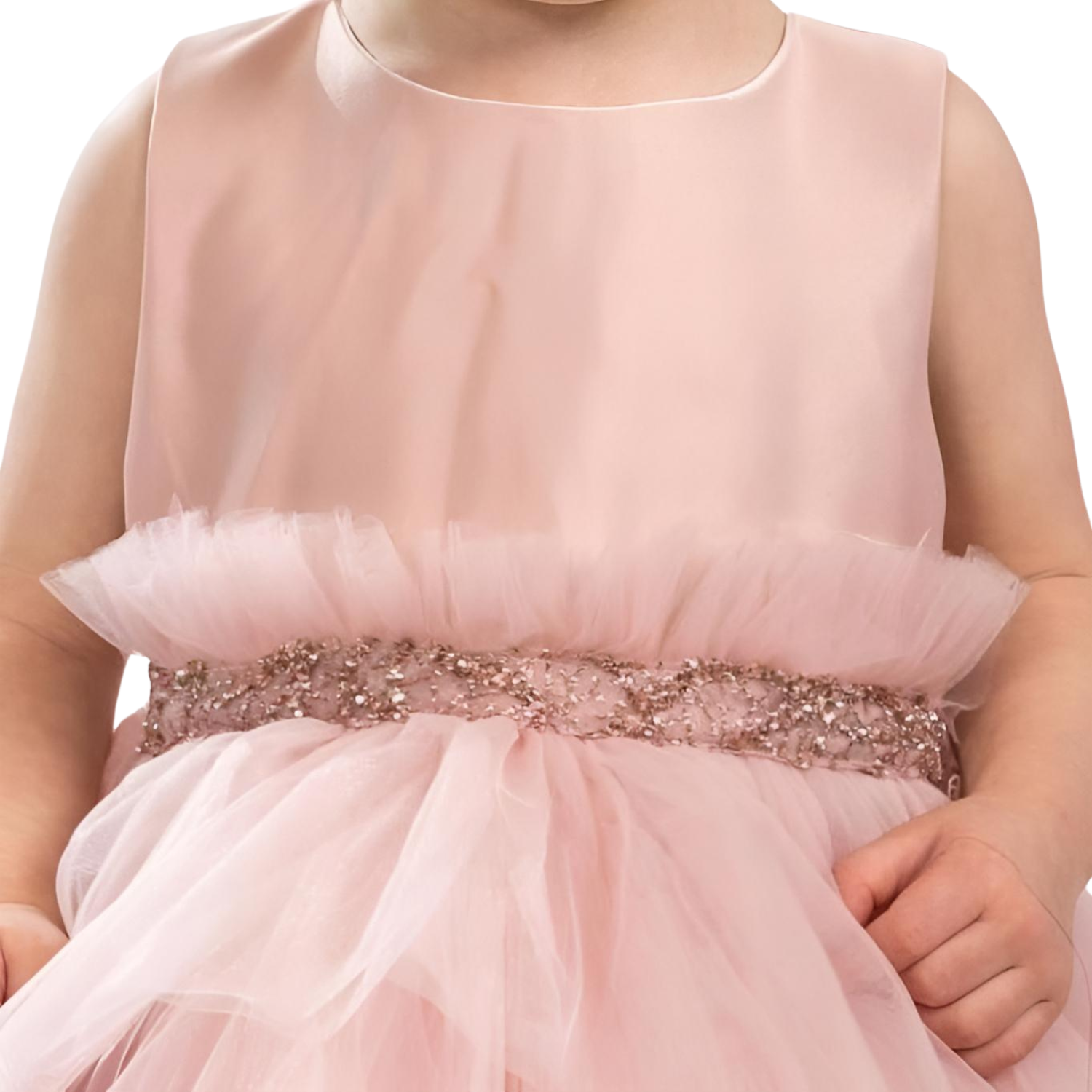 Superbe robe de princesse avec un bas en tulle très bouffant, une bordure en strass sur la taille et un très gros nœud au dos. Un création exclusive signée JuniorKids!