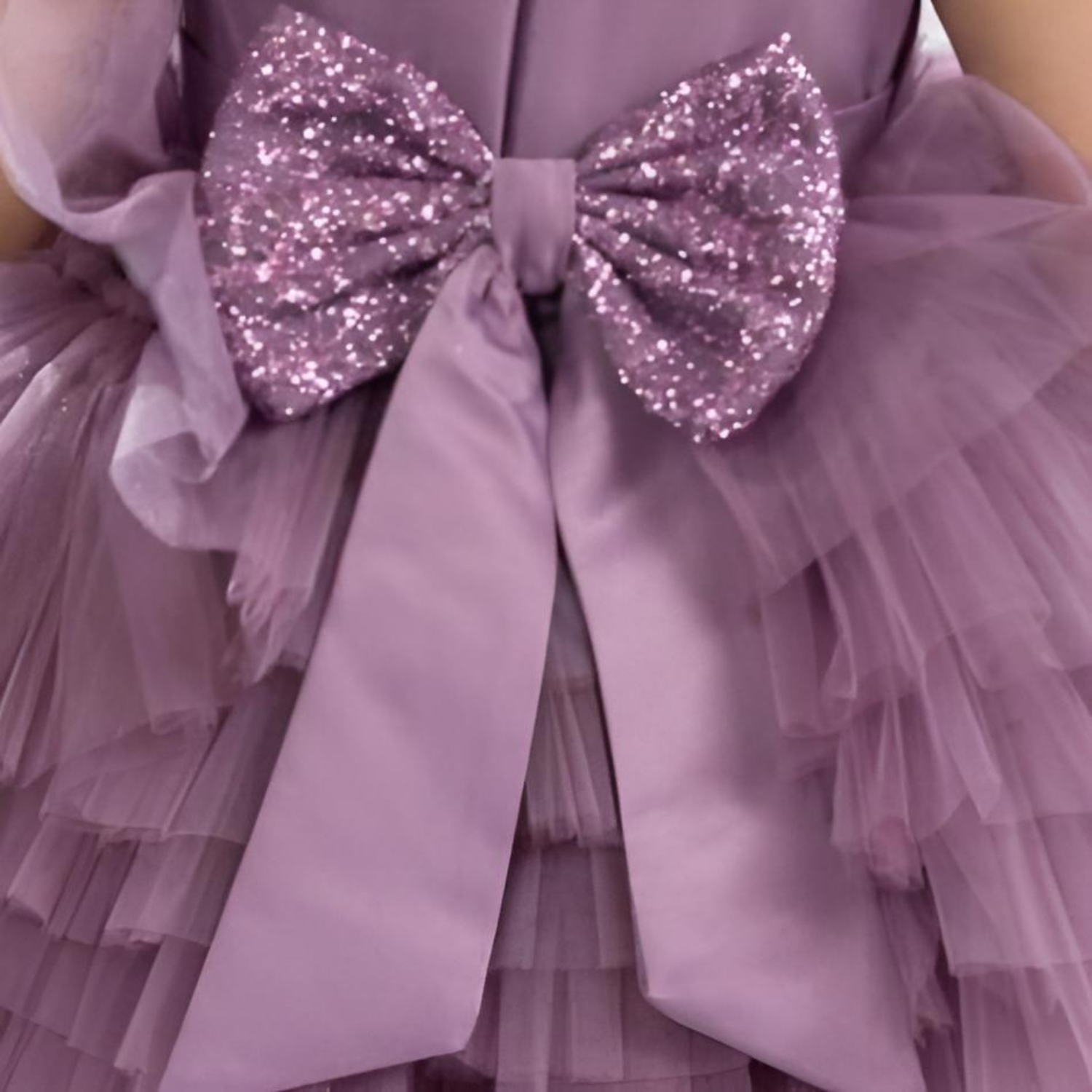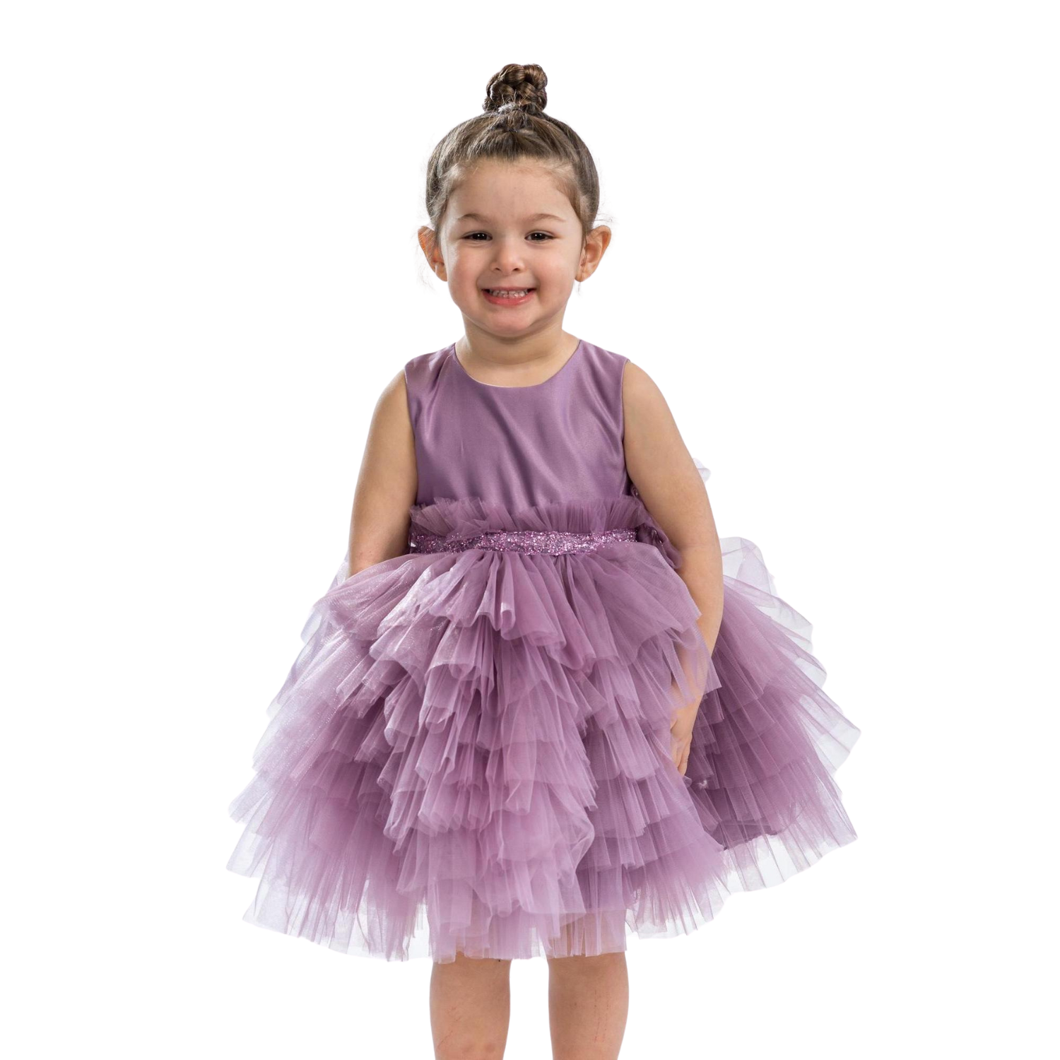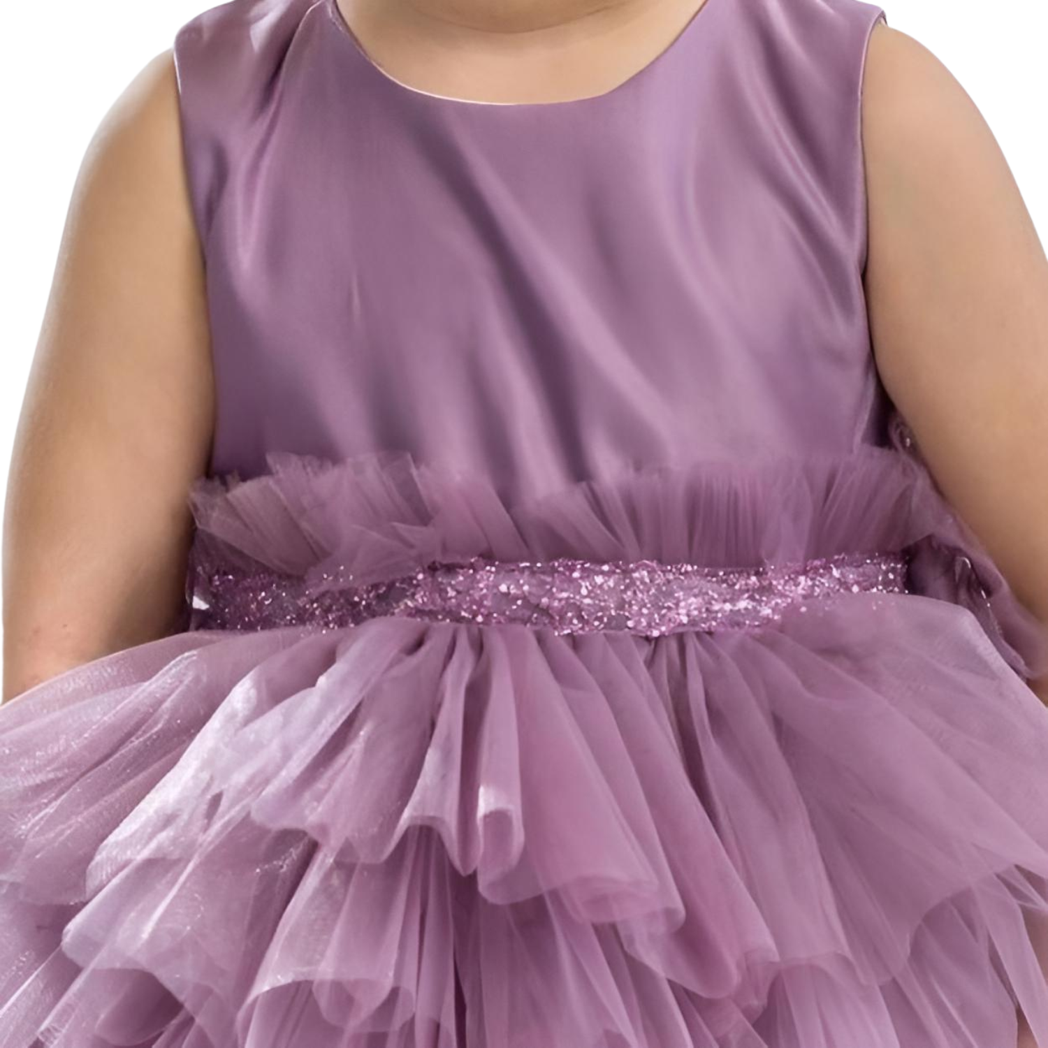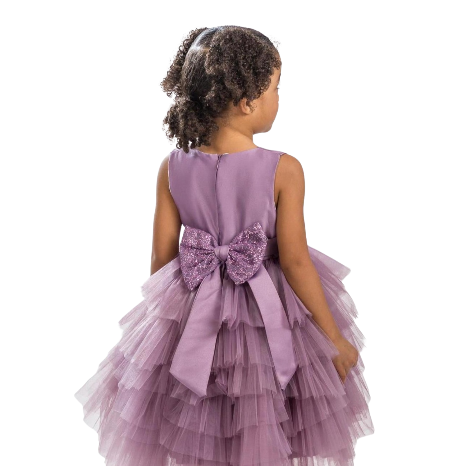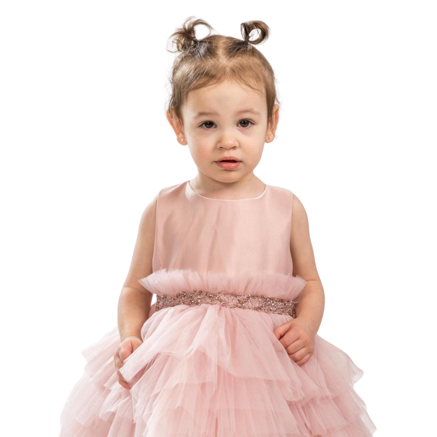 Superbe robe de princesse avec un bas en tulle très bouffant, une bordure en strass sur la taille et un très gros nœud au dos. Un création exclusive signée JuniorKids!