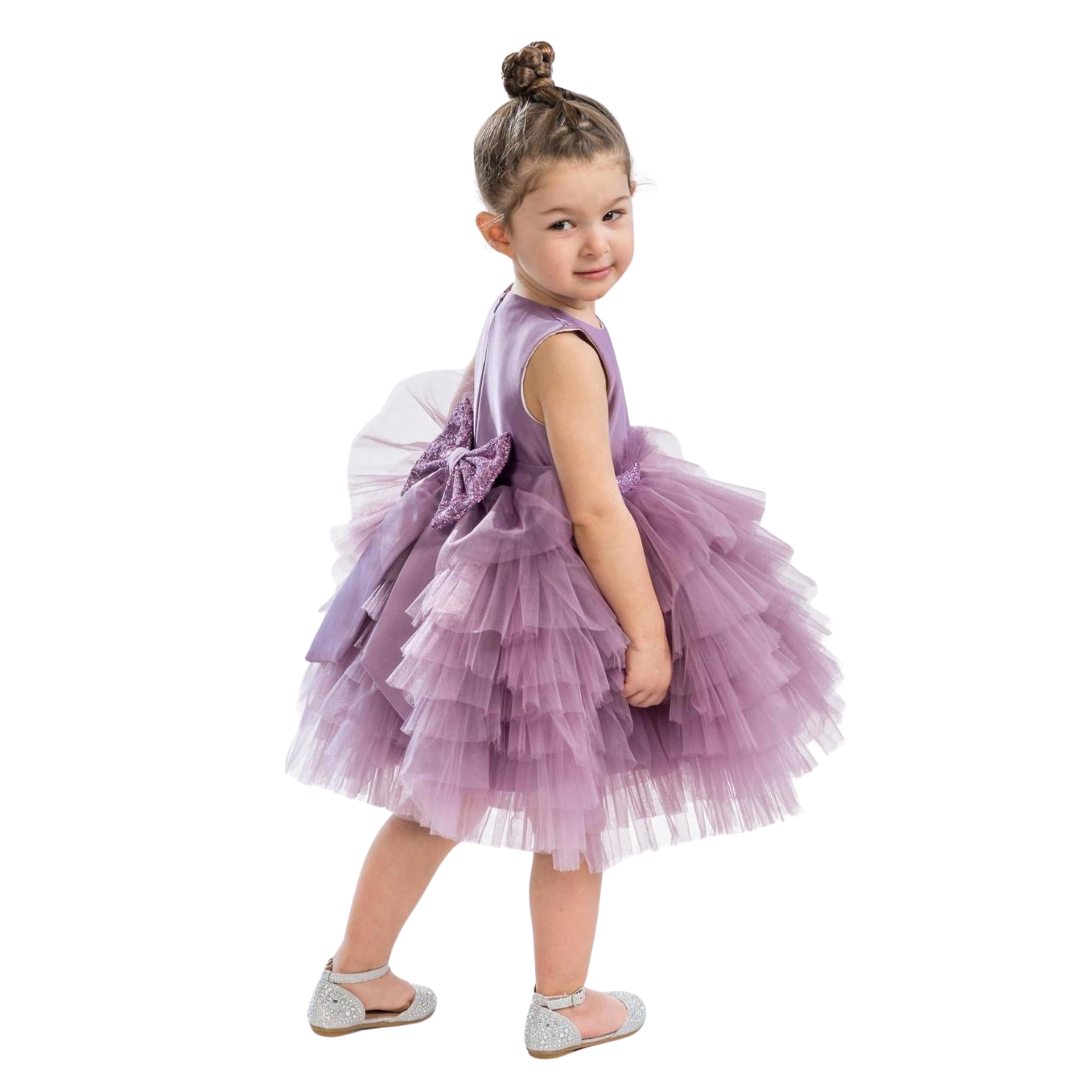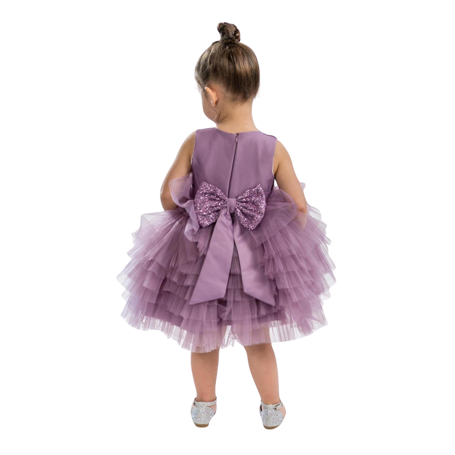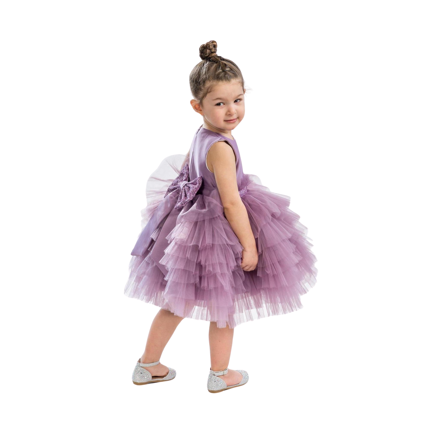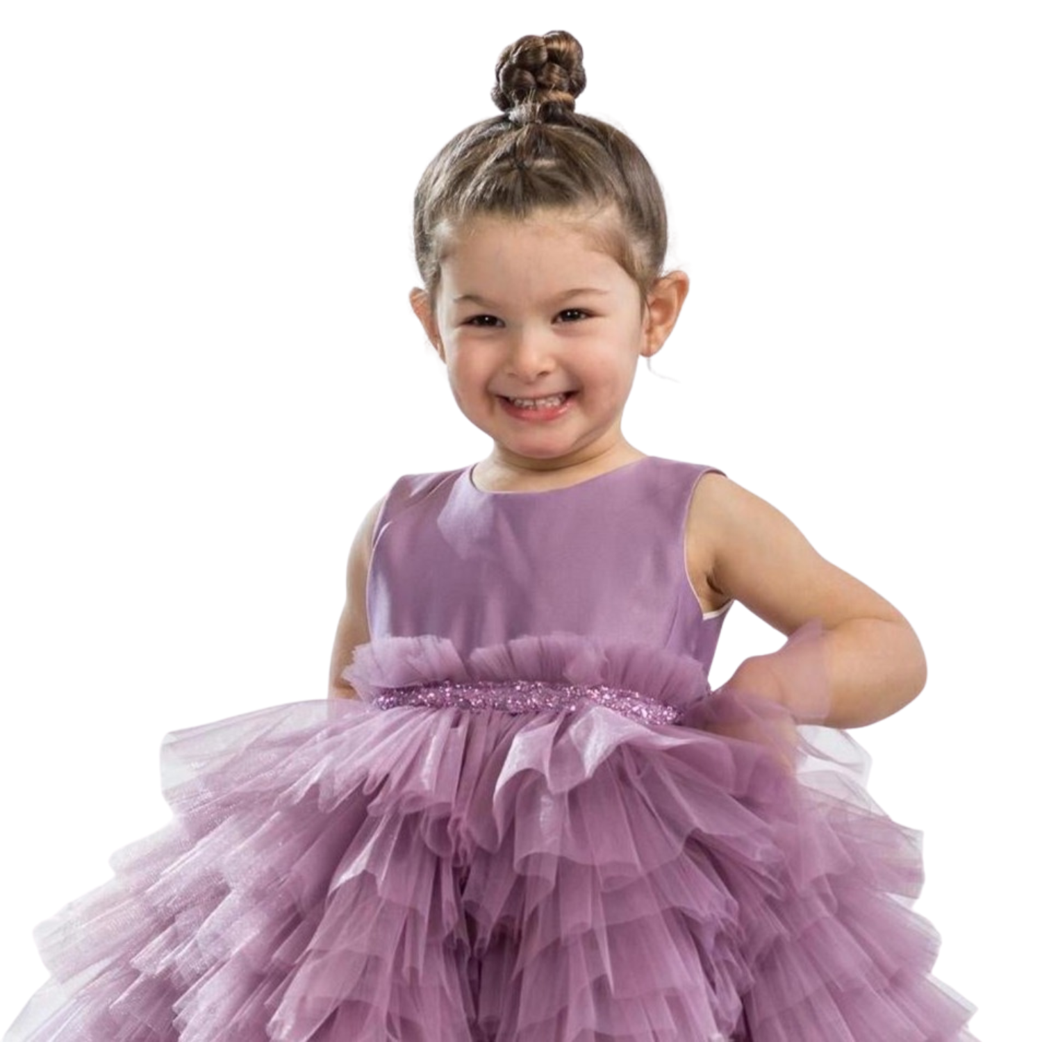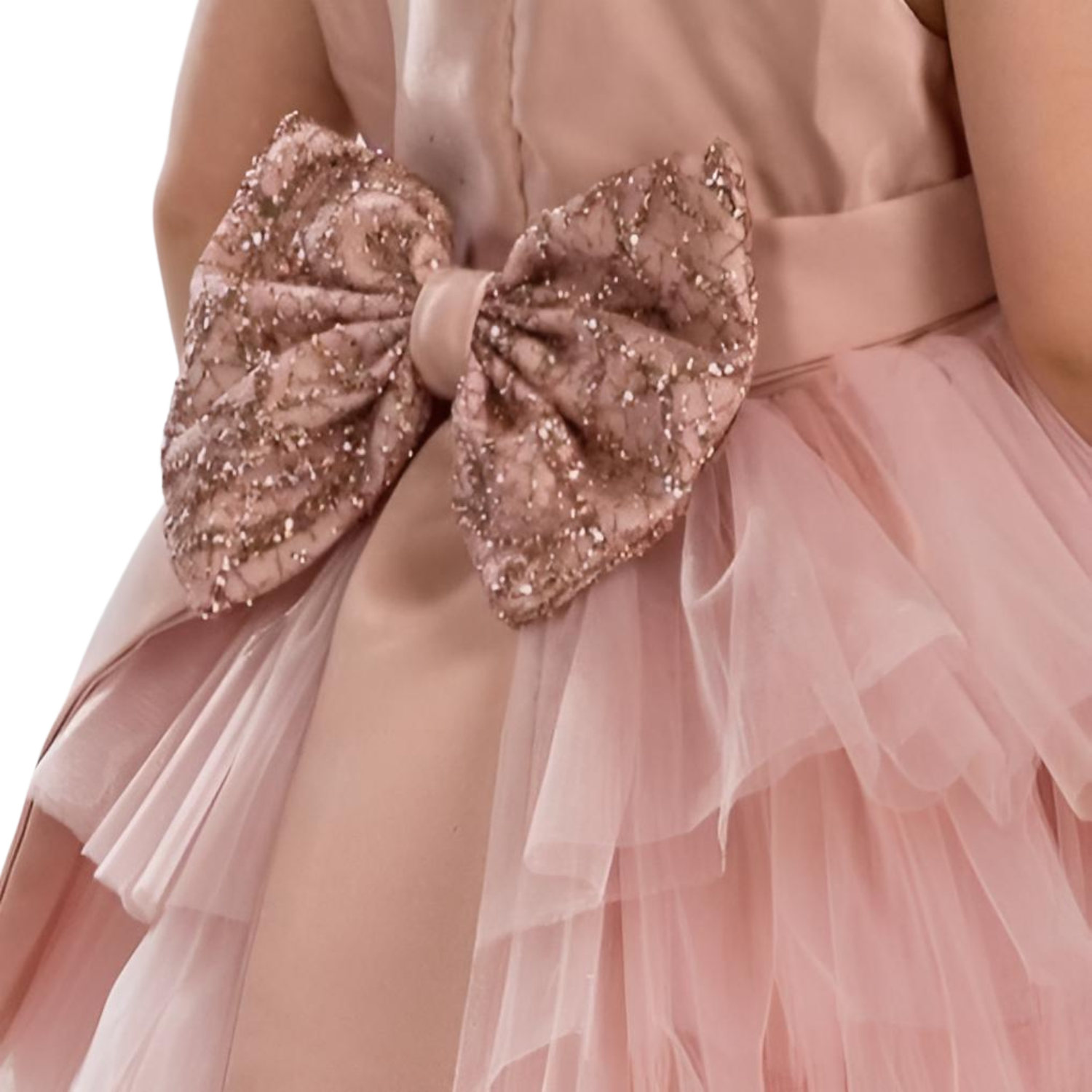 Stunning princess dress with a very pouffy tulle bottom, rhinestones trim on the waistline and big bow in the back. A JuniorKids exclusive design!