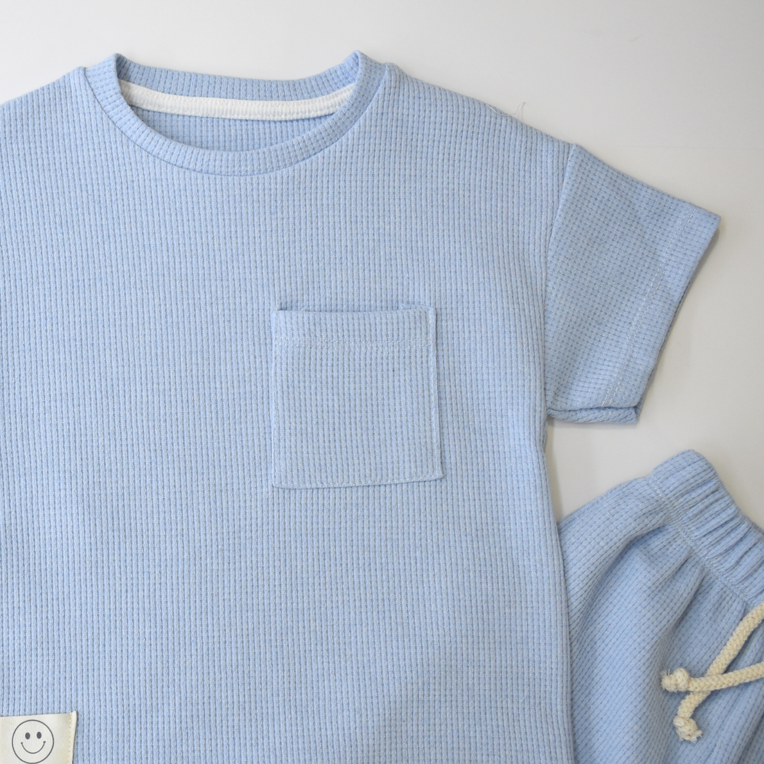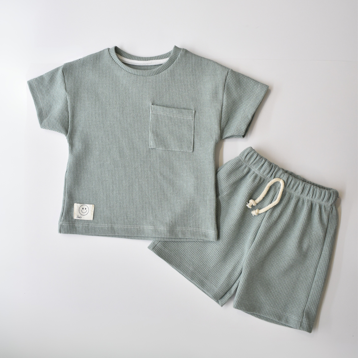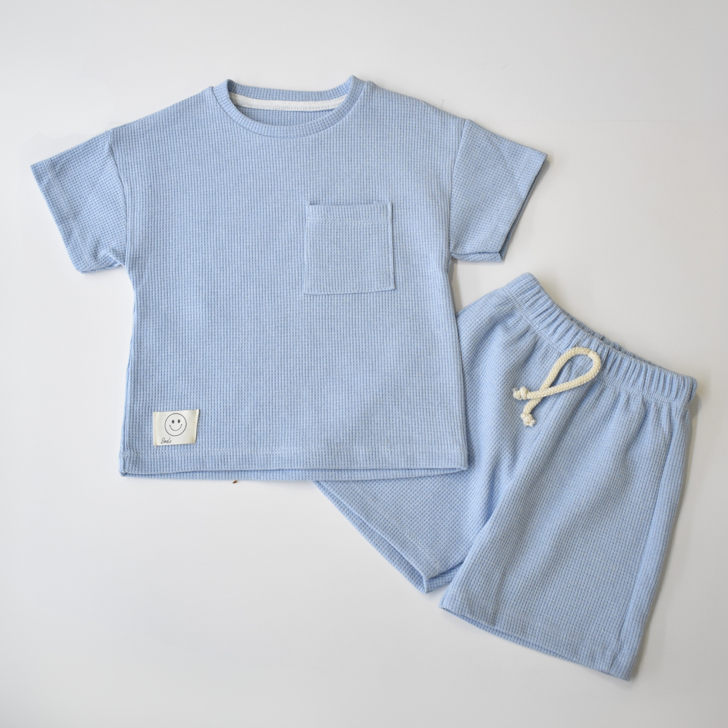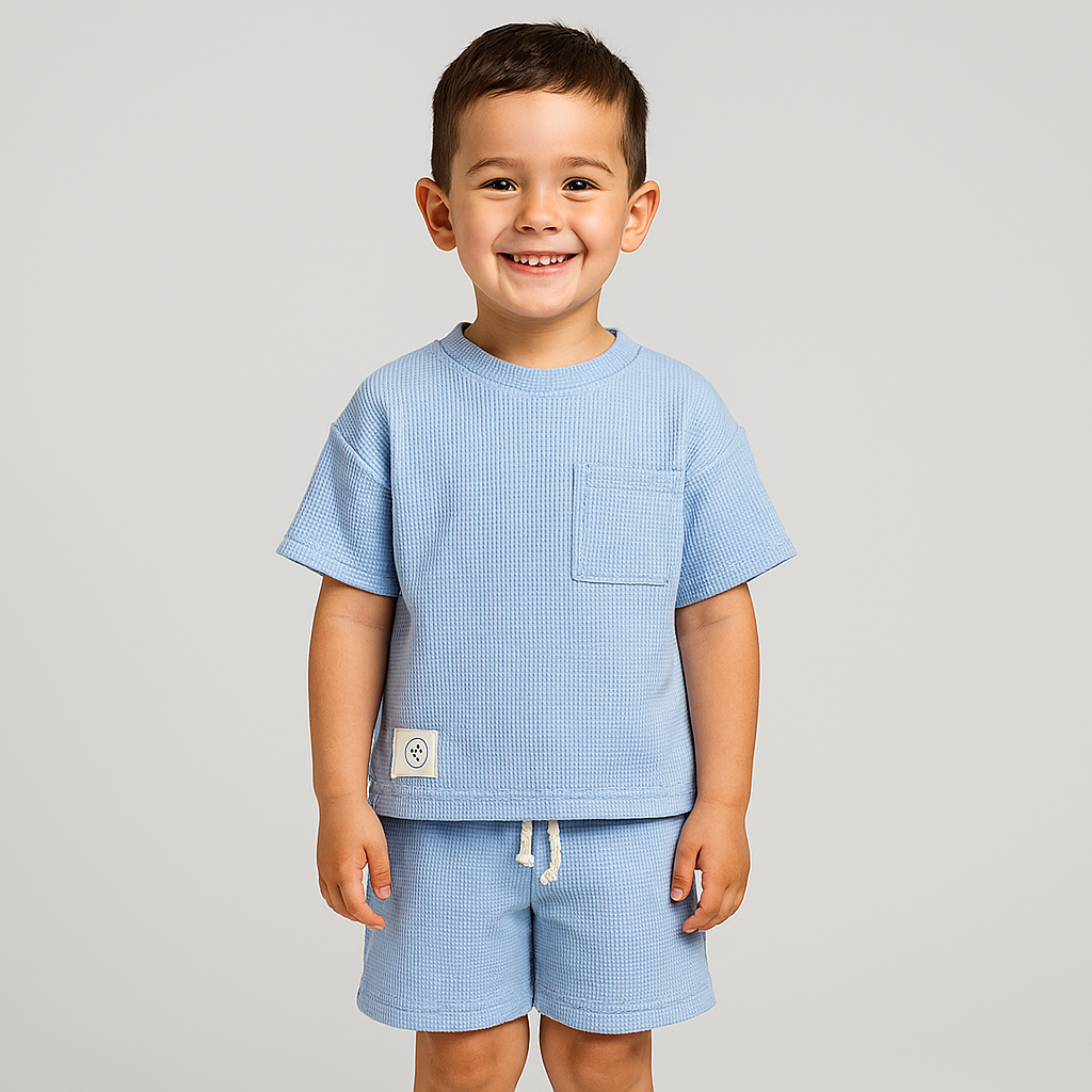 Keep your little one stylish and comfortable with this simple yet trendy two-piece set! Made from 100% soft, breathable cotton, this set includes a T-shirt with a classic chest pocket and matching shorts for a clean, minimalist look. Available in blue and green, these timeless colors make it perfect for everyday wear, playtime, and casual outings.