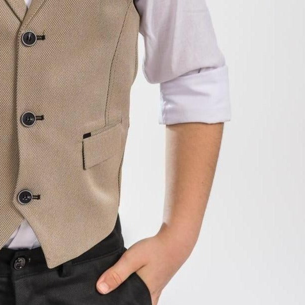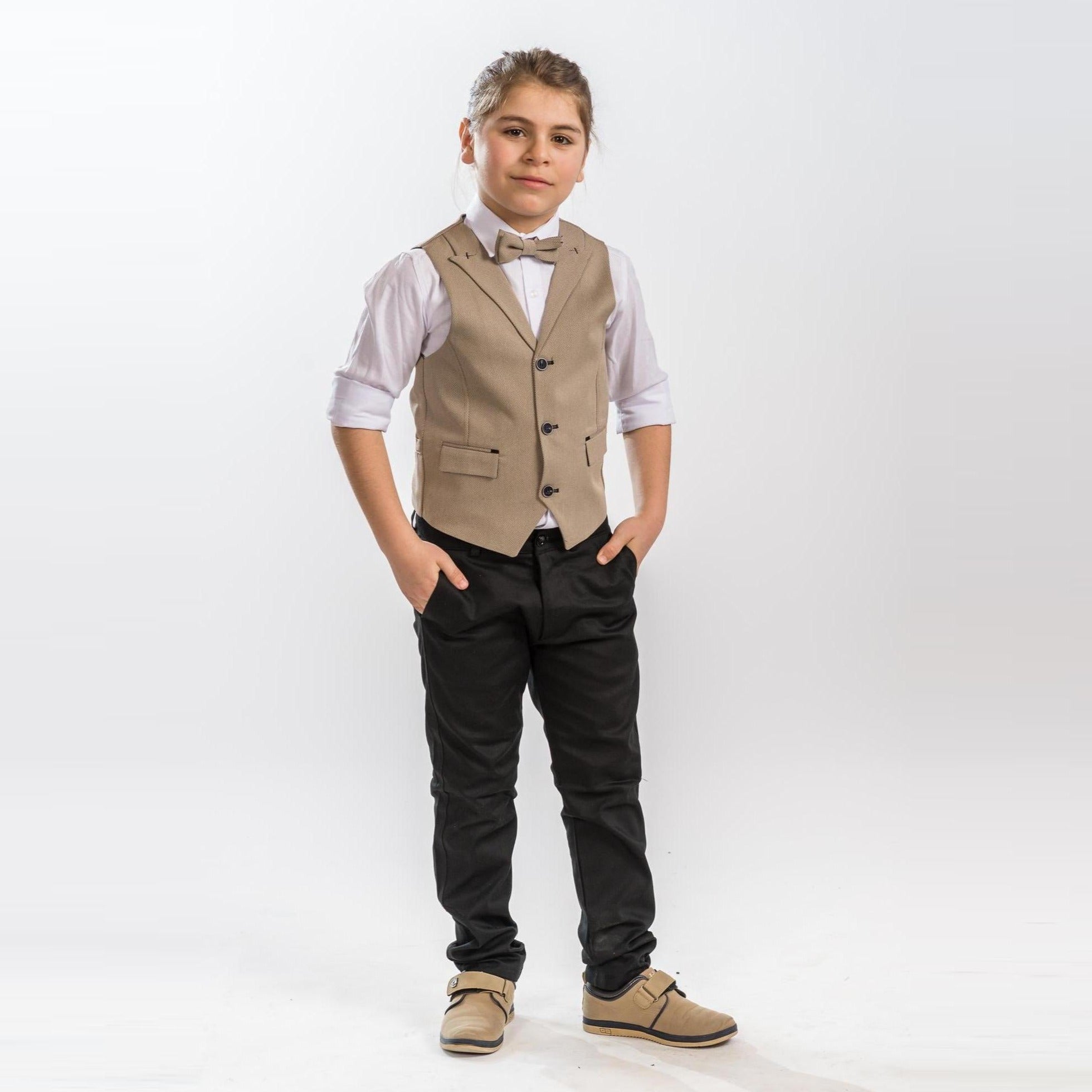 This is taking the vest set style to a new level. Stylish knit cotton vest set including sleeveless vest, soft cotton shirt, and slim fit adjustable waist knit cotton pants, and matching bowtie. A real superstar in the making!