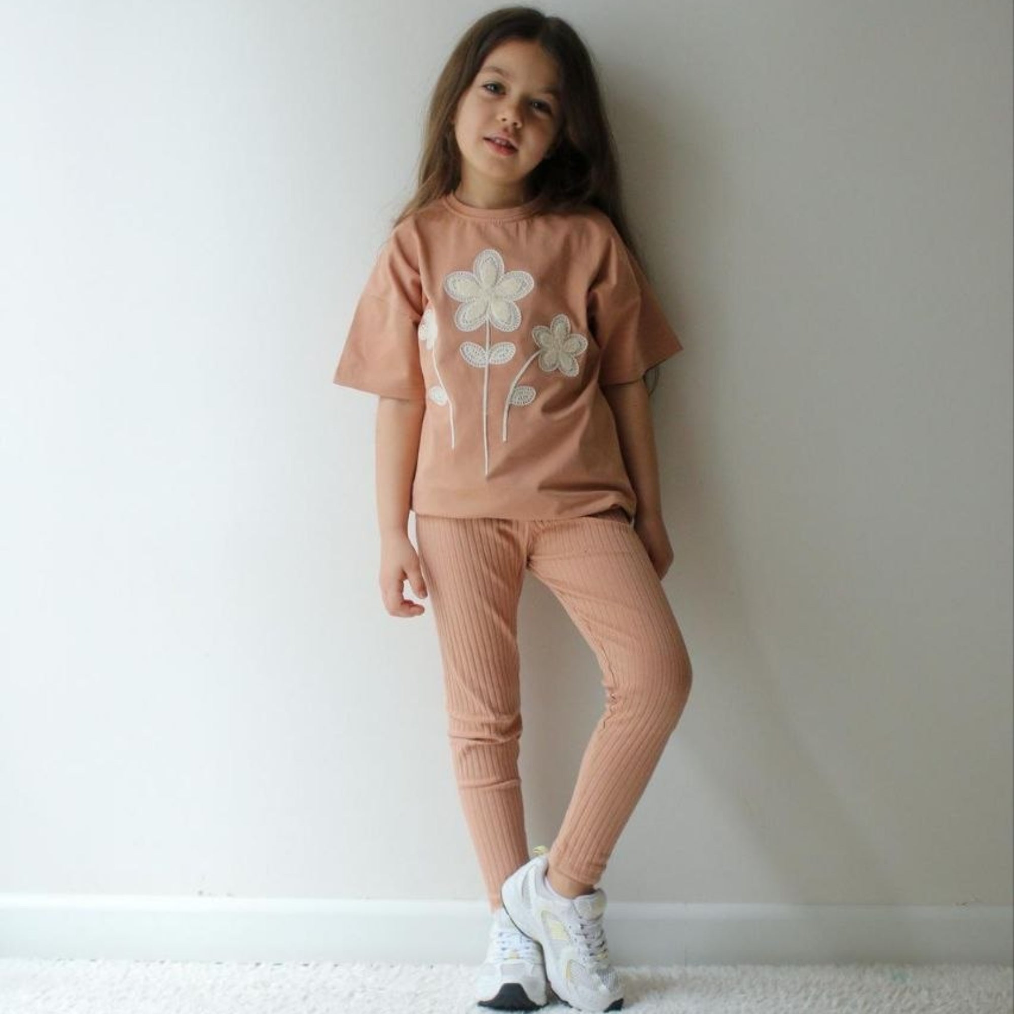 The Desert Eye Set combines soft tones with everyday comfort for a stylish and relaxed look. This two-piece outfit features a breathable cotton t-shirt with delicate floral detailing paired with matching ribbed leggings for a cozy and modern fit.