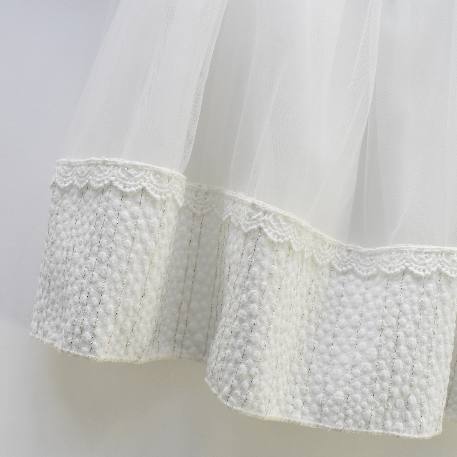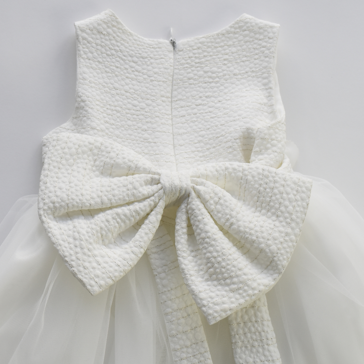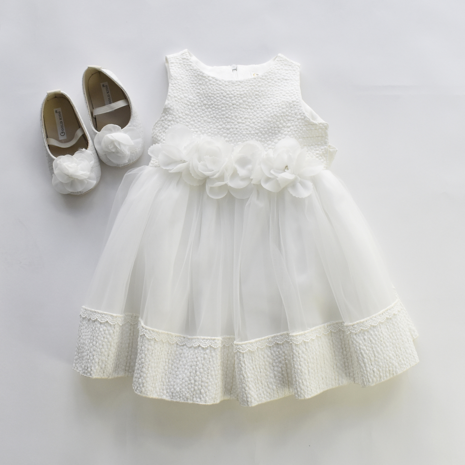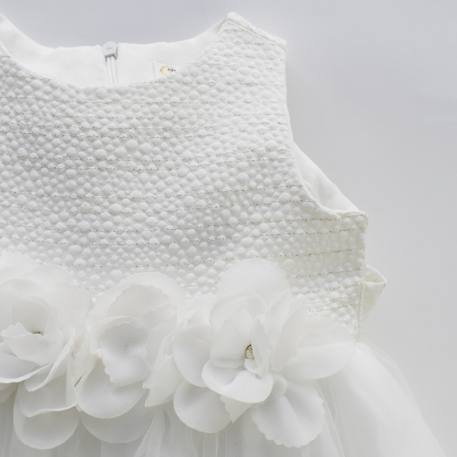 Elegant jacquard dress with tulle and matching jacquard trim bottom, and removable flowers at the waistline. This dress has a soft cotton full lining for added comfort. An exclusive creation by JuniorKids!