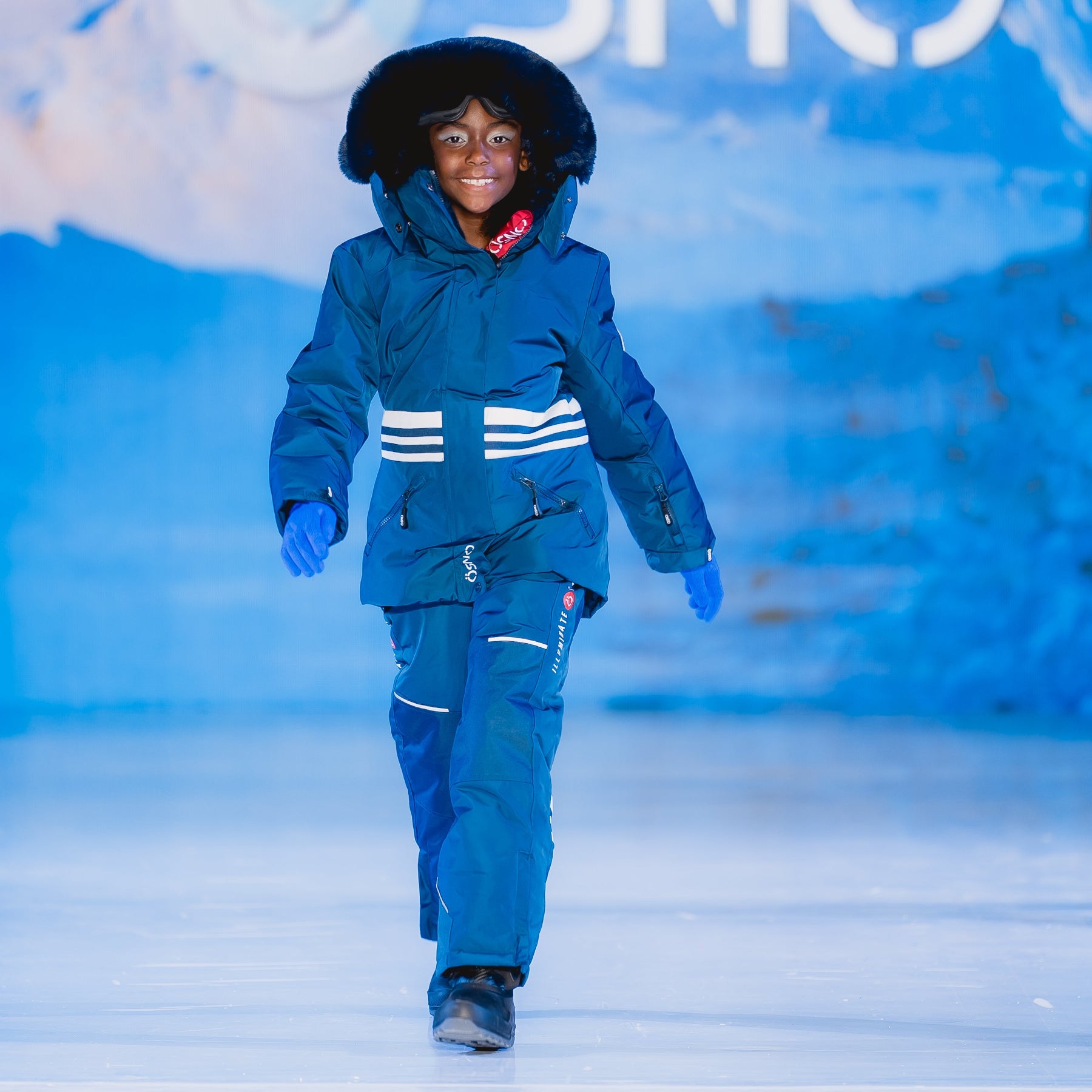 Designed in deep all-navy with a striped white-and-navy waist elastic, this piece features a soft navy fur interior lining and a huge detachable, rounded navy fur hood for ultimate warmth and sophistication. The look is completed with OSNO’s detachable LED patch, making it both stylish and playful—an ideal choice for any toddler girls' snowsuit collection.