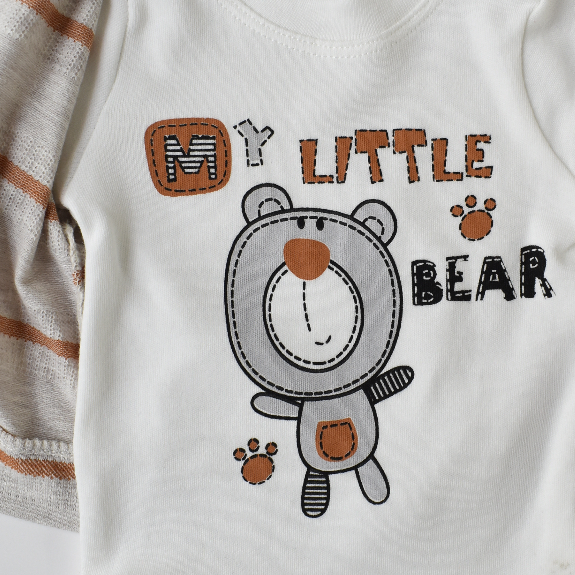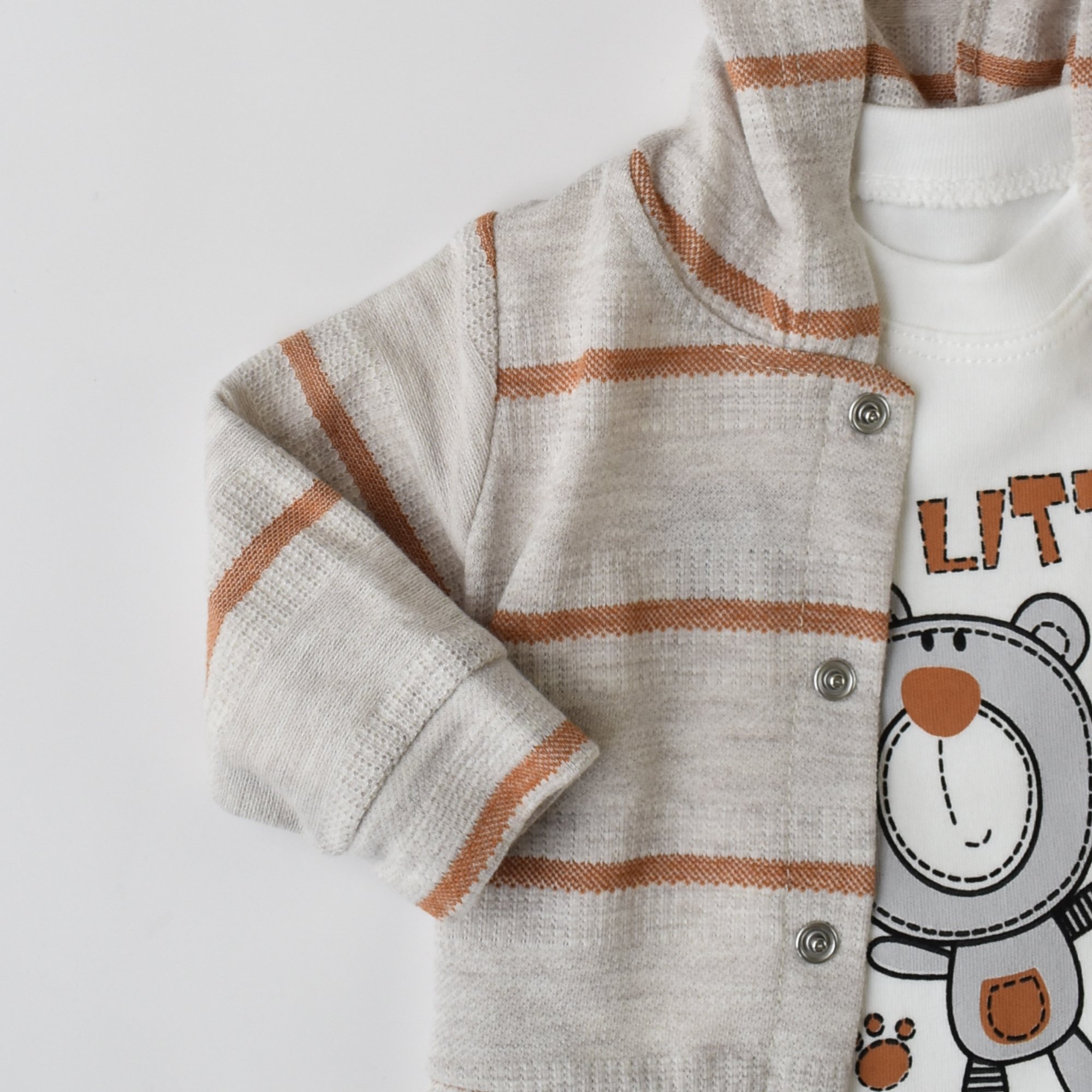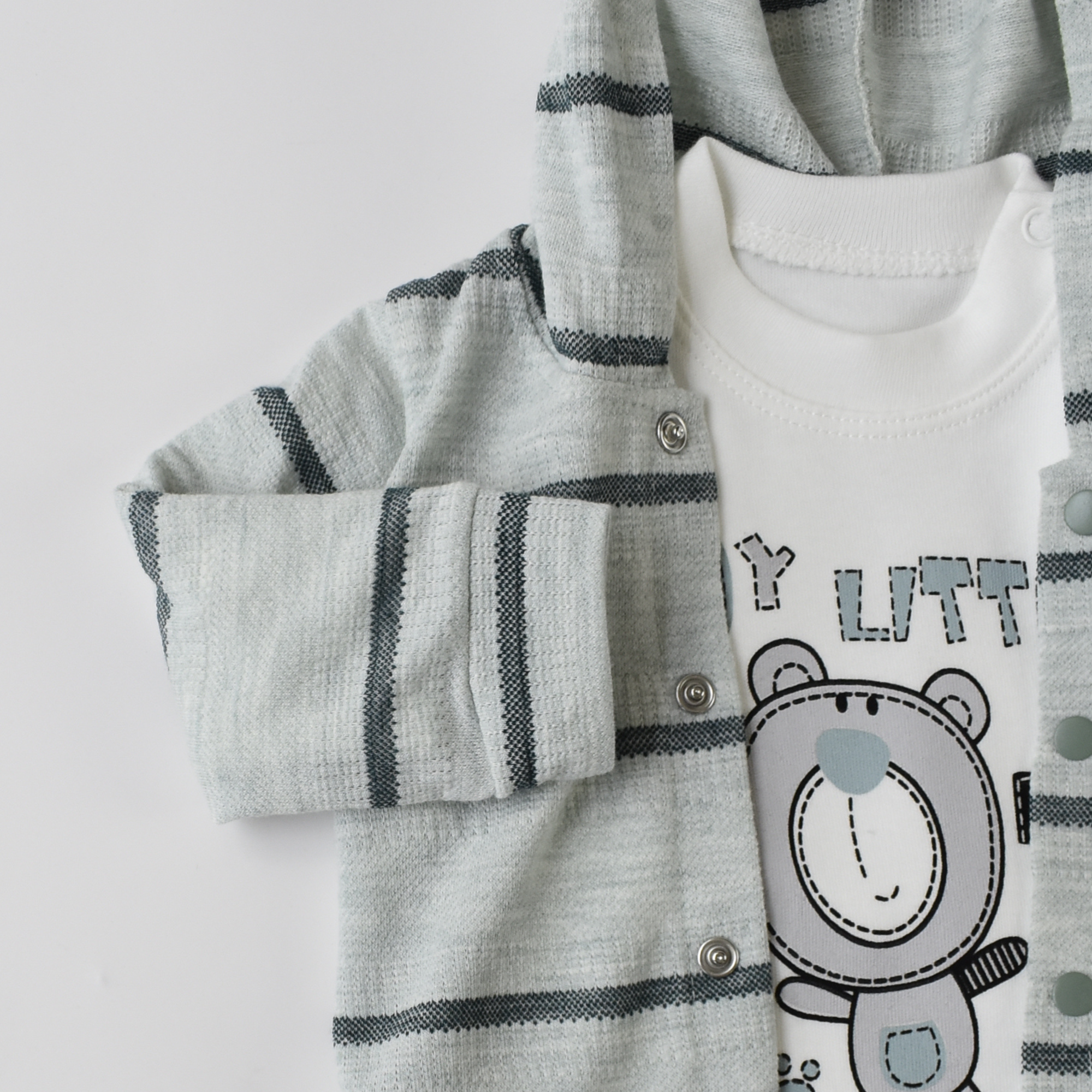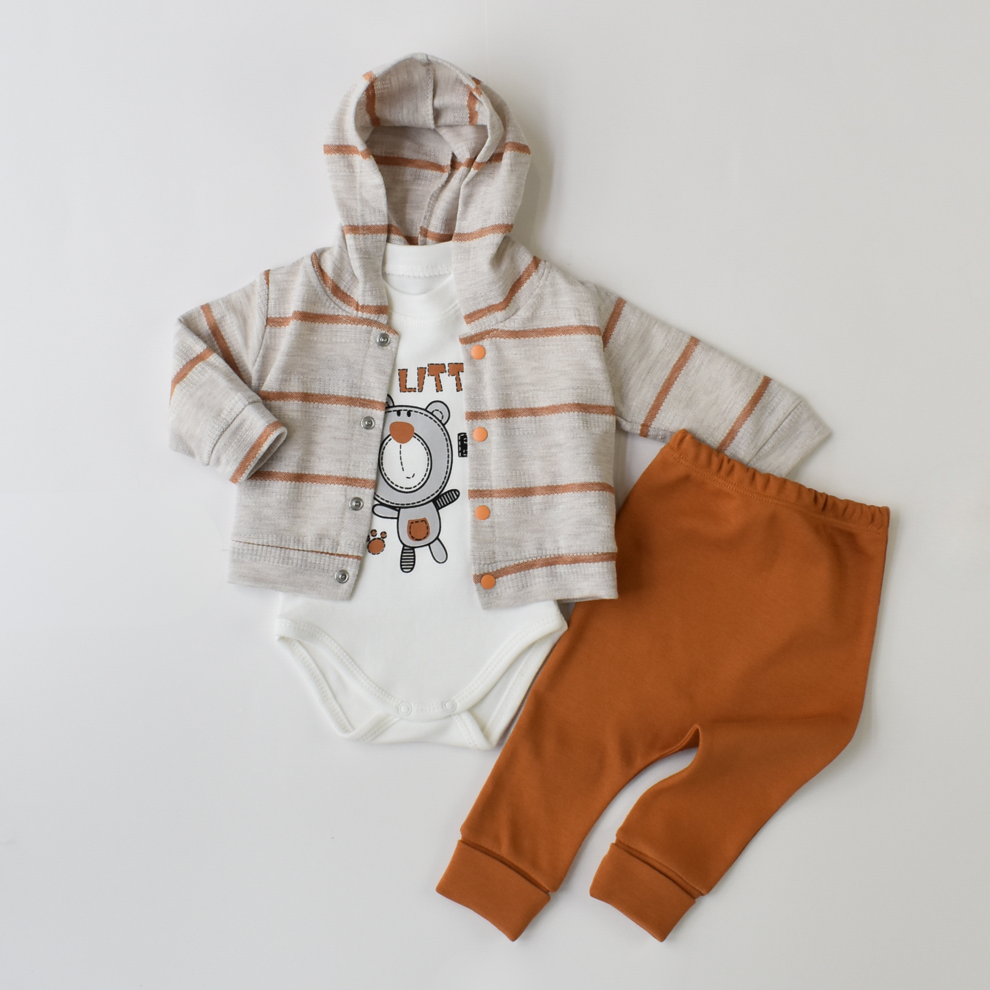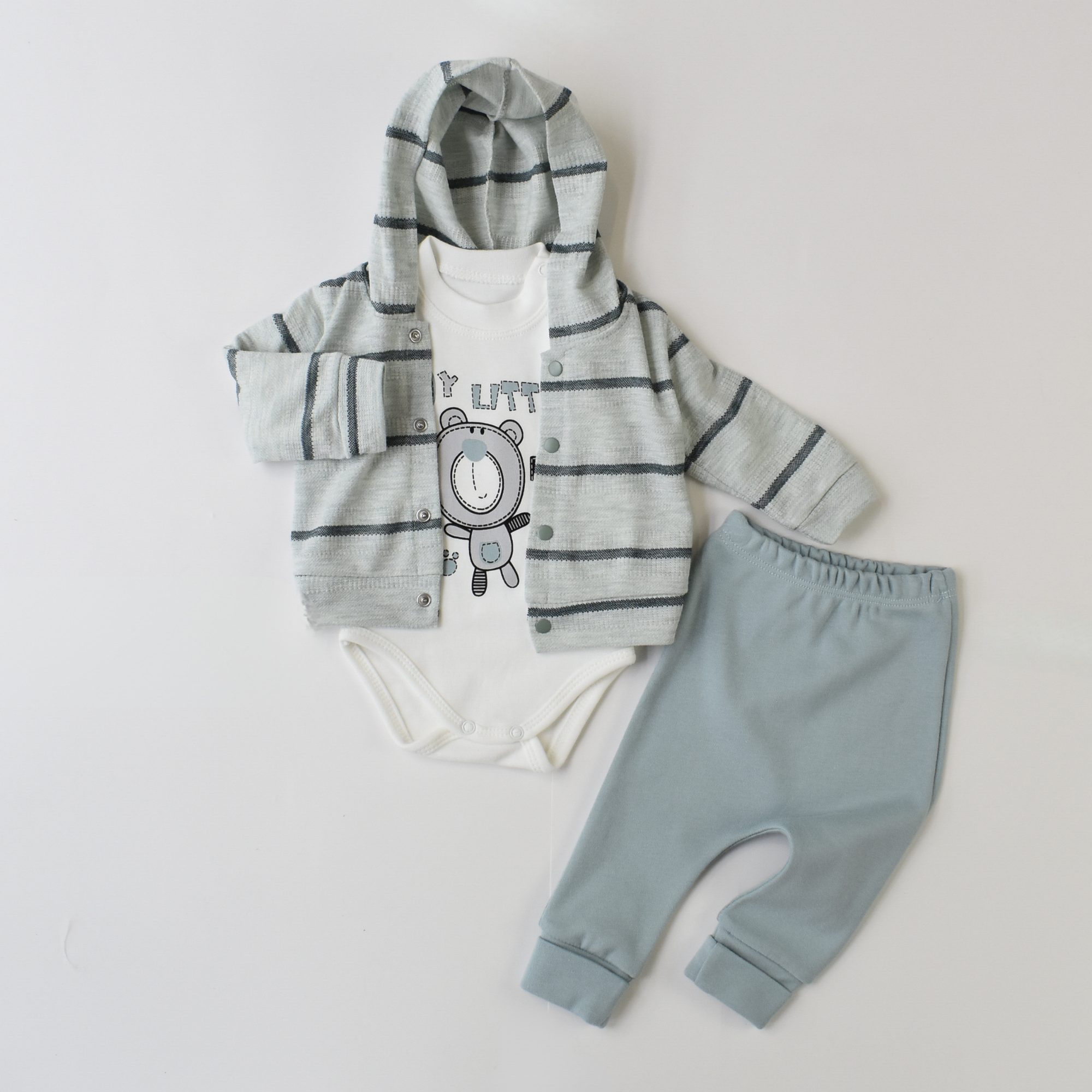 Keep your little one stylish and cozy with this lovely set of a comfy cotton button-up hoodie, a soft onesie (100% cotton), and snug pants (100% cotton).
