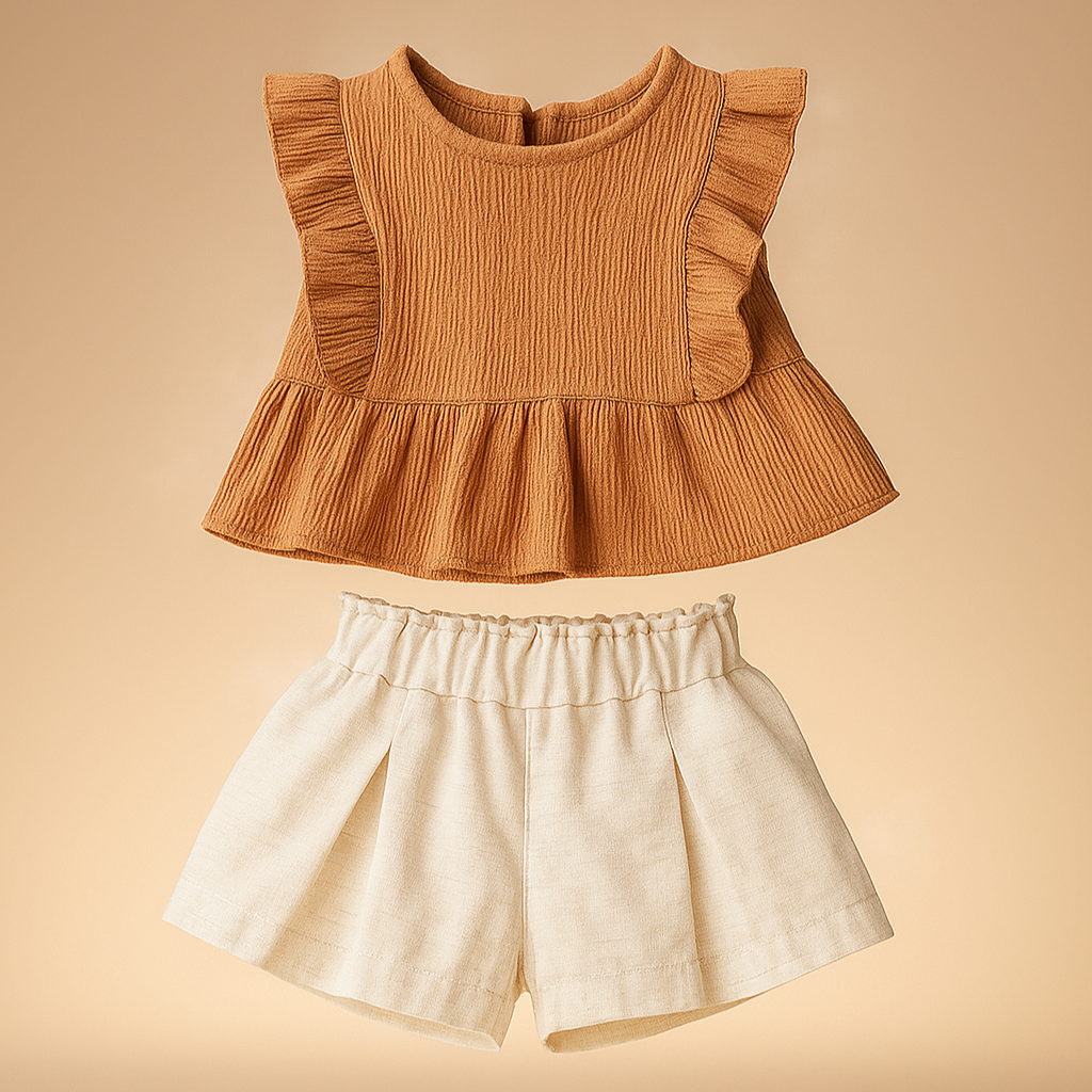 Keep your little fashionista comfortable and stylish with this cute two-piece set! Made from 100% soft, breathable cotton, the set features a simple yet chic blouse and matching shorts. Perfect for casual outings, playtime, or just relaxing, this set combines ease and style for girls on the go.