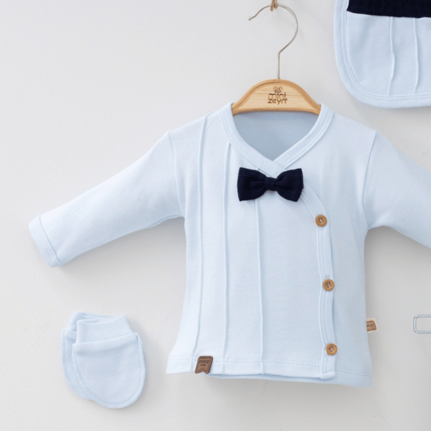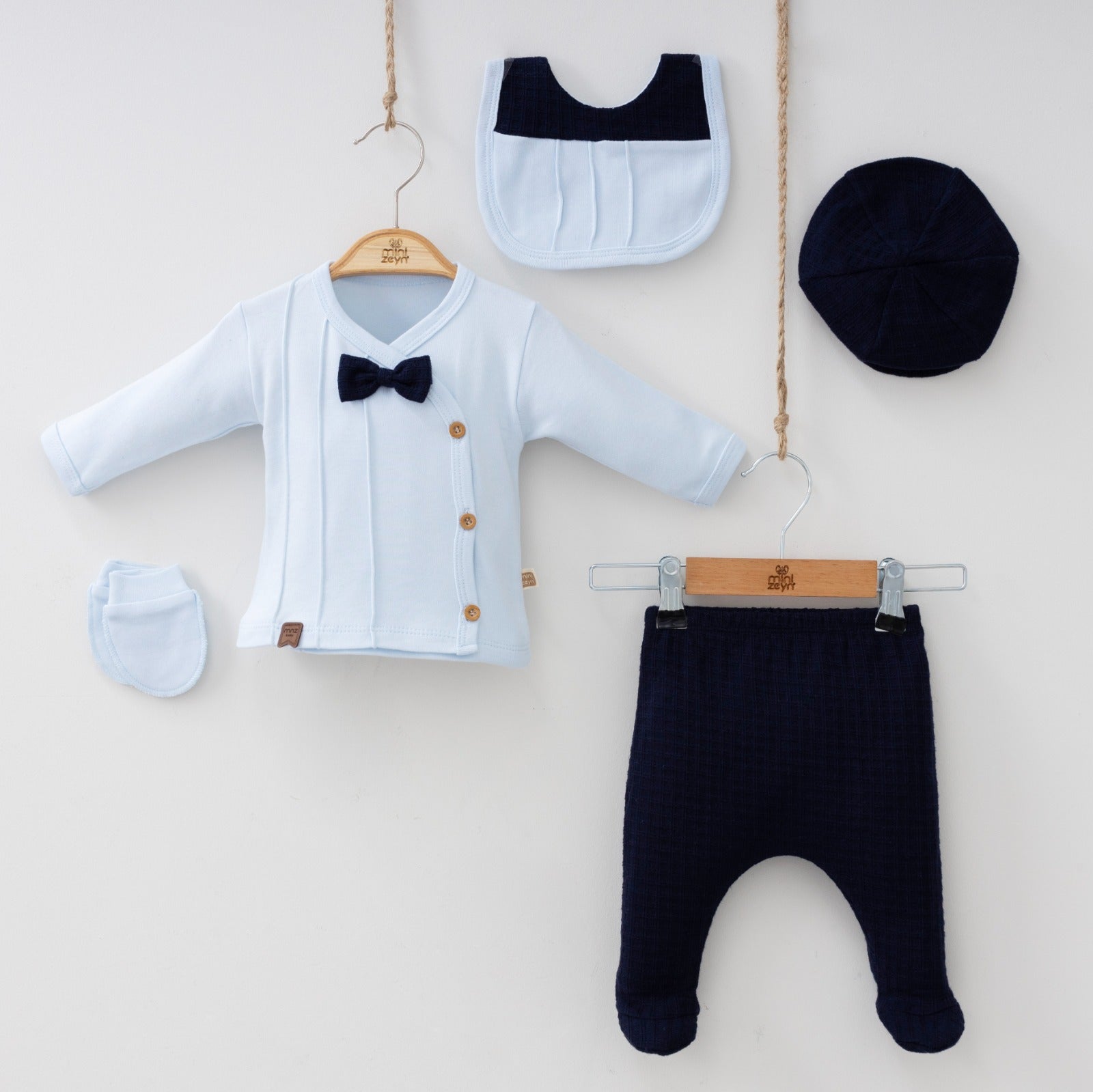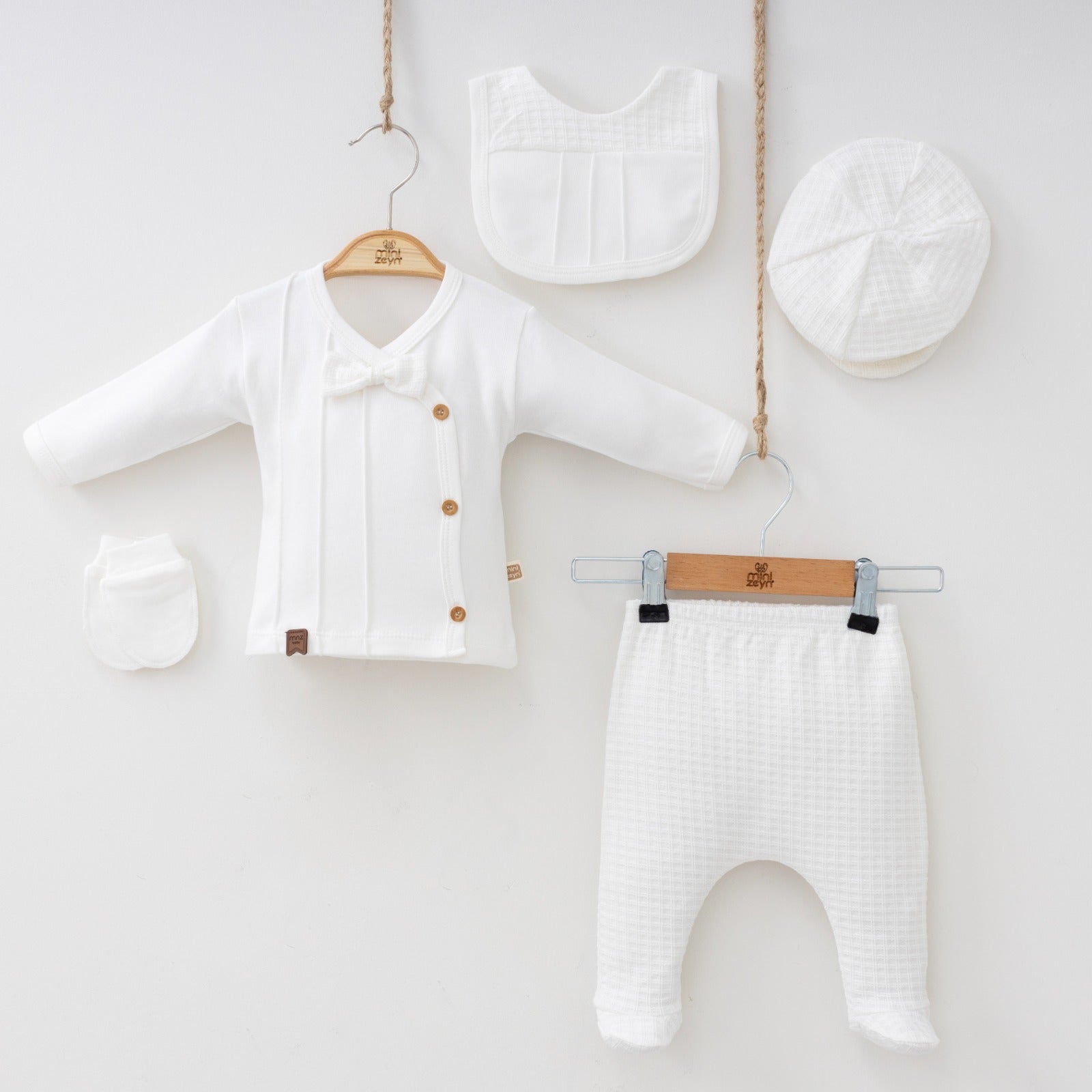 Very important to be stylish from the first day with this beautiful 5 piece themed pajama set that includes an asymmetric opening top (100% Cotton), cotton pants with closed-in feet (100% Cotton), a bib and matching anti-scratch mittens and warm hat for your new little one.