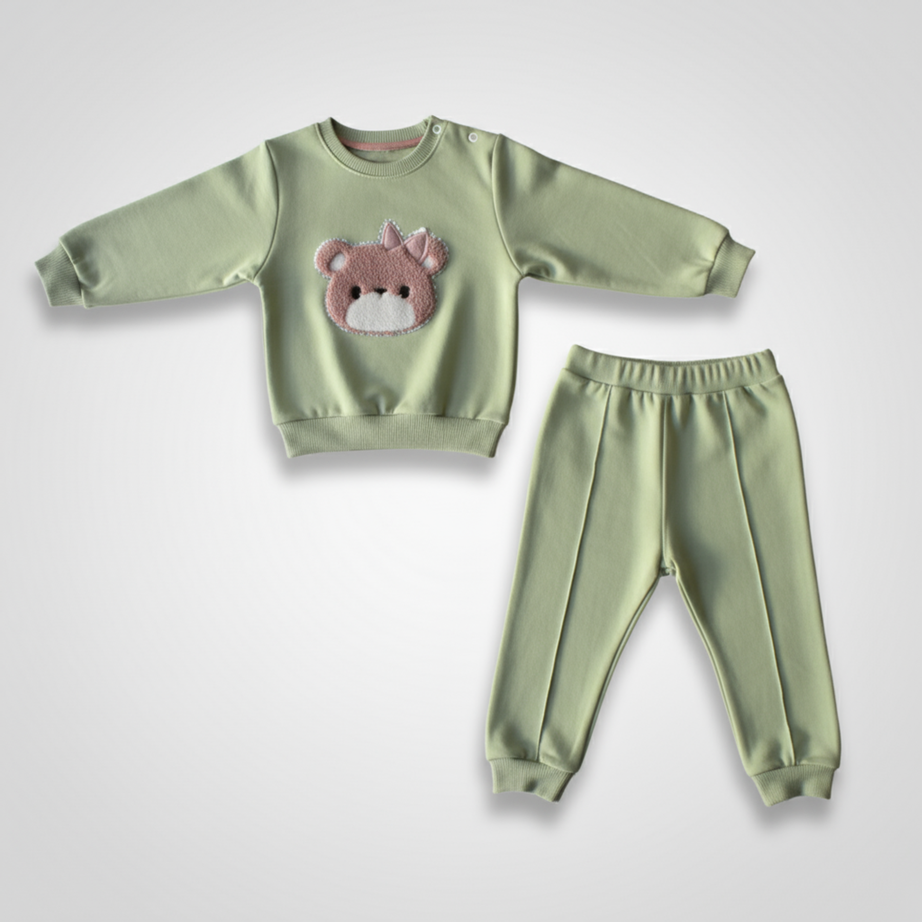 This adorable two-piece set is made from soft 100% cotton, designed to keep your baby cozy and comfortable all day. The long-sleeve sweatshirt features snap buttons on the shoulder for easy dressing and a sweet teddy bear applique on the front. Paired with matching elastic waist pants, this set is perfect for everyday wear, playtime, or outings.