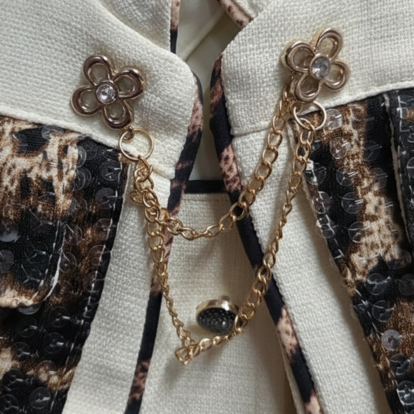 A refined and standout two-piece set featuring a structured cropped jacket adorned with bold leopard-sequin panels for a touch of glamour. The clean, tailored neckline and contrasting details add sophistication, while the front bow accent brings a soft, feminine charm. The pleated A-line skirt offers graceful movement and timeless elegance, creating a perfectly balanced silhouette. Ideal for special occasions where style, confidence, and uniqueness truly shine.