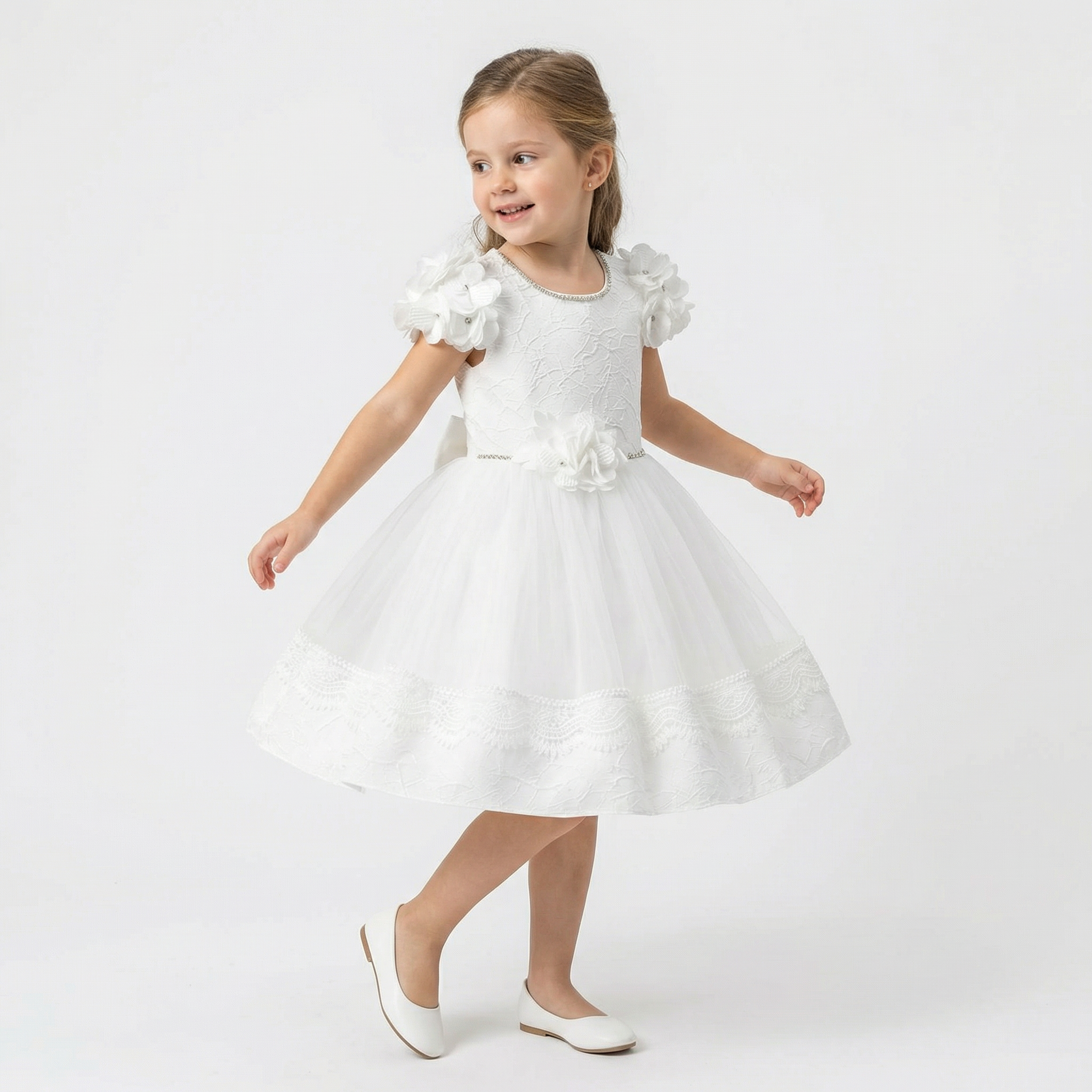 This elegant girls' dress is perfect for any special occasion. Featuring a luxurious satin bodice with delicate cap sleeves, it offers both comfort and sophistication. Beautiful 3D floral appliqués add a charming touch, while a satin sash defines the waist for a graceful silhouette. The full tulle skirt creates a dreamy, princess-like effect, flowing effortlessly to ankle length. A convenient rear center zipper and a sash tie back ensure a perfect fit. Whether for weddings, birthdays, or formal gatherings, this dress is designed to make every little girl feel like a princess.